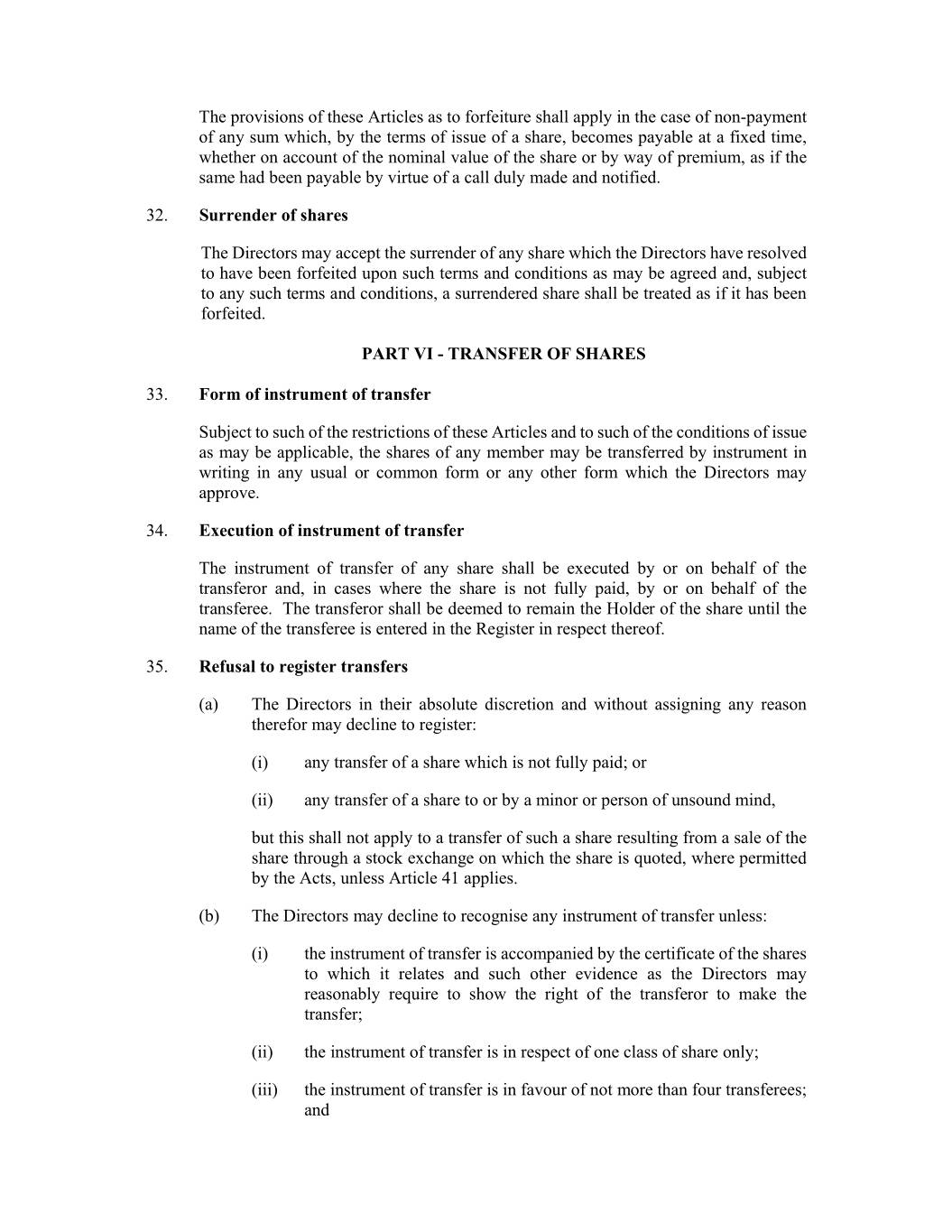 The provisions of these Articles as to forfeiture shall apply in the case of non-payment of any sum which, by the terms of issue of a share, becomes payable at a fixed time, whether on account of the nominal value of the share or by way of premium, as if the same had been payable by virtue of a call duly made and notified. 32. Surrender of shares The Directors may accept the surrender of any share which the Directors have resolved to have been forfeited upon such terms and conditions as may be agreed and, subject to any such terms and conditions, a surrendered share shall be treated as if it has been forfeited. PART VI - TRANSFER OF SHARES 33. Form of instrument of transfer Subject to such of the restrictions of these Articles and to such of the conditions of issue as may be applicable, the shares of any member may be transferred by instrument in writing in any usual or common form or any other form which the Directors may approve. 34. Execution of instrument of transfer The instrument of transfer of any share shall be executed by or on behalf of the transferor and, in cases where the share is not fully paid, by or on behalf of the transferee. The transferor shall be deemed to remain the Holder of the share until the name of the transferee is entered in the Register in respect thereof. 35. Refusal to register transfers (a) The Directors in their absolute discretion and without assigning any reason therefor may decline to register: (i) any transfer of a share which is not fully paid; or (ii) any transfer of a share to or by a minor or person of unsound mind, but this shall not apply to a transfer of such a share resulting from a sale of the share through a stock exchange on which the share is quoted, where permitted by the Acts, unless Article 41 applies. (b) The Directors may decline to recognise any instrument of transfer unless: (i) the instrument of transfer is accompanied by the certificate of the shares to which it relates and such other evidence as the Directors may reasonably require to show the right of the transferor to make the transfer; (ii) the instrument of transfer is in respect of one class of share only; (iii) the instrument of transfer is in favour of not more than four transferees; and