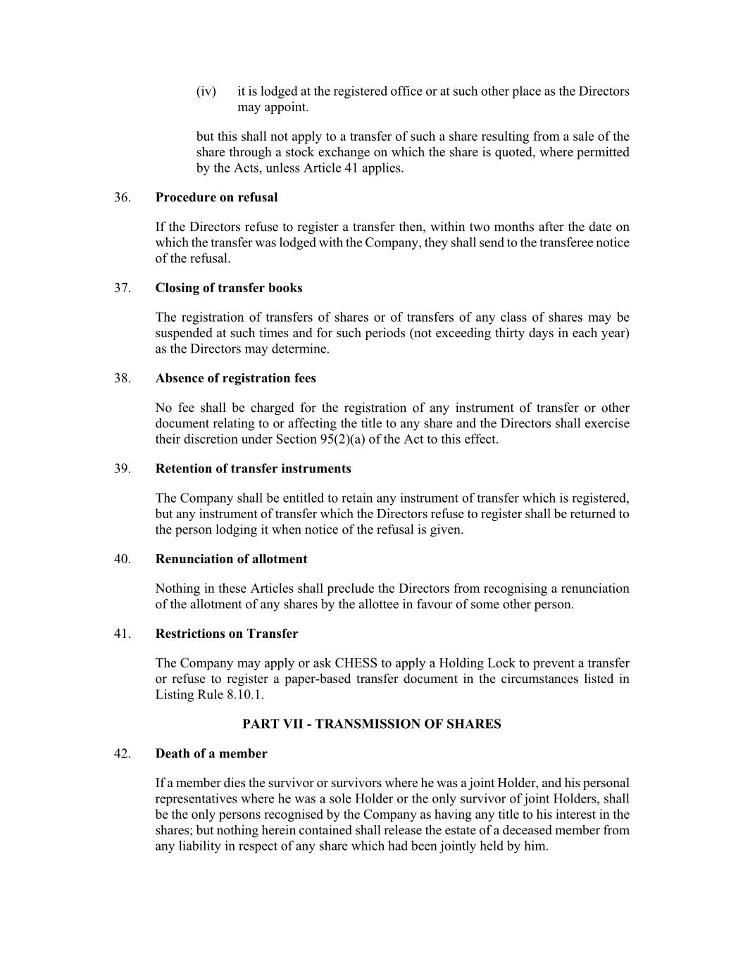 (iv) it is lodged at the registered office or at such other place as the Directors may appoint. but this shall not apply to a transfer of such a share resulting from a sale of the share through a stock exchange on which the share is quoted, where permitted by the Acts, unless Article 41 applies. 36. Procedure on refusal If the Directors refuse to register a transfer then, within two months after the date on which the transfer was lodged with the Company, they shall send to the transferee notice of the refusal. 37. Closing of transfer books The registration of transfers of shares or of transfers of any class of shares may be suspended at such times and for such periods (not exceeding thirty days in each year) as the Directors may determine. 38. Absence of registration fees No fee shall be charged for the registration of any instrument of transfer or other document relating to or affecting the title to any share and the Directors shall exercise their discretion under Section 95(2)(a) of the Act to this effect. 39. Retention of transfer instruments The Company shall be entitled to retain any instrument of transfer which is registered, but any instrument of transfer which the Directors refuse to register shall be returned to the person lodging it when notice of the refusal is given. 40. Renunciation of allotment Nothing in these Articles shall preclude the Directors from recognising a renunciation of the allotment of any shares by the allottee in favour of some other person. 41. Restrictions on Transfer The Company may apply or ask CHESS to apply a Holding Lock to prevent a transfer or refuse to register a paper-based transfer document in the circumstances listed in Listing Rule 8.10.1. PART VII - TRANSMISSION OF SHARES 42. Death of a member If a member dies the survivor or survivors where he was a joint Holder, and his personal representatives where he was a sole Holder or the only survivor of joint Holders, shall be the only persons recognised by the Company as having any title to his interest in the shares; but nothing herein contained shall release the estate of a deceased member from any liability in respect of any share which had been jointly held by him.