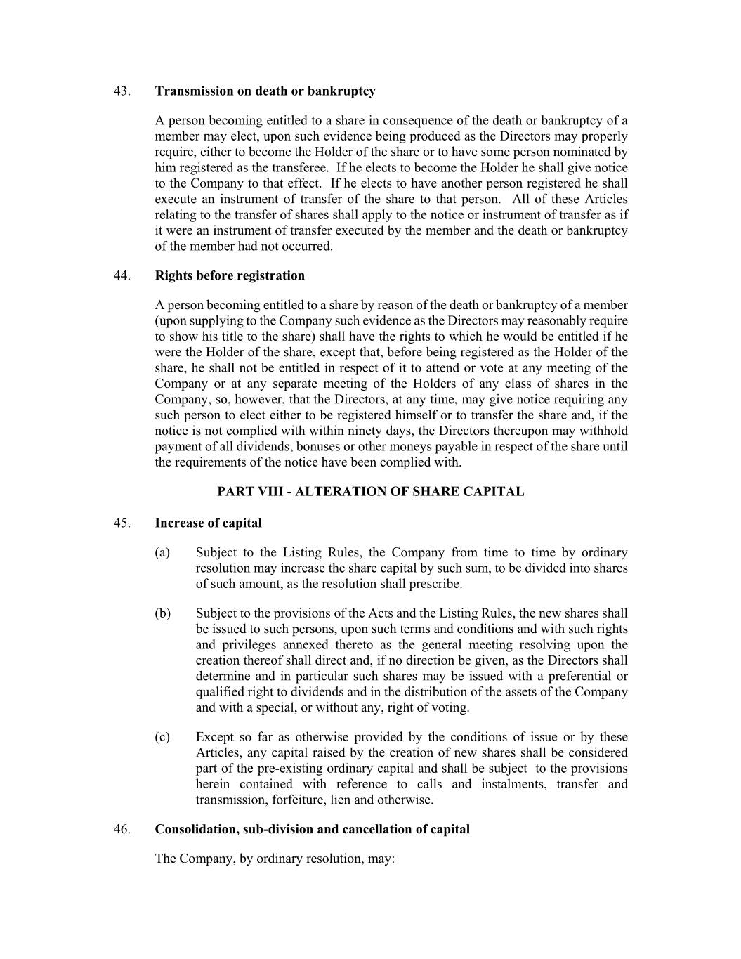 43. Transmission on death or bankruptcy A person becoming entitled to a share in consequence of the death or bankruptcy of a member may elect, upon such evidence being produced as the Directors may properly require, either to become the Holder of the share or to have some person nominated by him registered as the transferee. If he elects to become the Holder he shall give notice to the Company to that effect. If he elects to have another person registered he shall execute an instrument of transfer of the share to that person. All of these Articles relating to the transfer of shares shall apply to the notice or instrument of transfer as if it were an instrument of transfer executed by the member and the death or bankruptcy of the member had not occurred. 44. Rights before registration A person becoming entitled to a share by reason of the death or bankruptcy of a member (upon supplying to the Company such evidence as the Directors may reasonably require to show his title to the share) shall have the rights to which he would be entitled if he were the Holder of the share, except that, before being registered as the Holder of the share, he shall not be entitled in respect of it to attend or vote at any meeting of the Company or at any separate meeting of the Holders of any class of shares in the Company, so, however, that the Directors, at any time, may give notice requiring any such person to elect either to be registered himself or to transfer the share and, if the notice is not complied with within ninety days, the Directors thereupon may withhold payment of all dividends, bonuses or other moneys payable in respect of the share until the requirements of the notice have been complied with. PART VIII - ALTERATION OF SHARE CAPITAL 45. Increase of capital (a) Subject to the Listing Rules, the Company from time to time by ordinary resolution may increase the share capital by such sum, to be divided into shares of such amount, as the resolution shall prescribe. (b) Subject to the provisions of the Acts and the Listing Rules, the new shares shall be issued to such persons, upon such terms and conditions and with such rights and privileges annexed thereto as the general meeting resolving upon the creation thereof shall direct and, if no direction be given, as the Directors shall determine and in particular such shares may be issued with a preferential or qualified right to dividends and in the distribution of the assets of the Company and with a special, or without any, right of voting. (c) Except so far as otherwise provided by the conditions of issue or by these Articles, any capital raised by the creation of new shares shall be considered part of the pre-existing ordinary capital and shall be subject to the provisions herein contained with reference to calls and instalments, transfer and transmission, forfeiture, lien and otherwise. 46. Consolidation, sub-division and cancellation of capital The Company, by ordinary resolution, may: