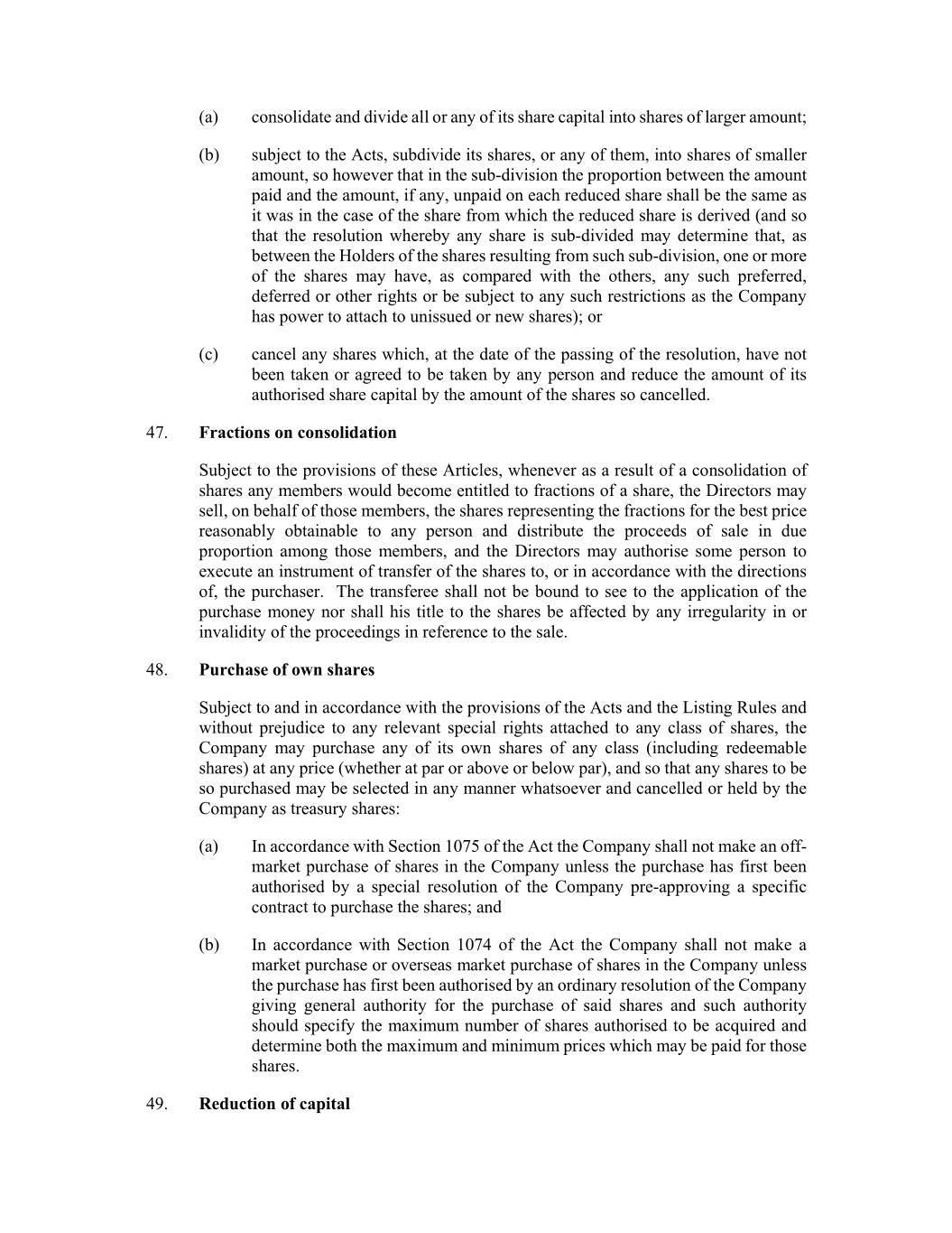 (a) consolidate and divide all or any of its share capital into shares of larger amount; (b) subject to the Acts, subdivide its shares, or any of them, into shares of smaller amount, so however that in the sub-division the proportion between the amount paid and the amount, if any, unpaid on each reduced share shall be the same as it was in the case of the share from which the reduced share is derived (and so that the resolution whereby any share is sub-divided may determine that, as between the Holders of the shares resulting from such sub-division, one or more of the shares may have, as compared with the others, any such preferred, deferred or other rights or be subject to any such restrictions as the Company has power to attach to unissued or new shares); or (c) cancel any shares which, at the date of the passing of the resolution, have not been taken or agreed to be taken by any person and reduce the amount of its authorised share capital by the amount of the shares so cancelled. 47. Fractions on consolidation Subject to the provisions of these Articles, whenever as a result of a consolidation of shares any members would become entitled to fractions of a share, the Directors may sell, on behalf of those members, the shares representing the fractions for the best price reasonably obtainable to any person and distribute the proceeds of sale in due proportion among those members, and the Directors may authorise some person to execute an instrument of transfer of the shares to, or in accordance with the directions of, the purchaser. The transferee shall not be bound to see to the application of the purchase money nor shall his title to the shares be affected by any irregularity in or invalidity of the proceedings in reference to the sale. 48. Purchase of own shares Subject to and in accordance with the provisions of the Acts and the Listing Rules and without prejudice to any relevant special rights attached to any class of shares, the Company may purchase any of its own shares of any class (including redeemable shares) at any price (whether at par or above or below par), and so that any shares to be so purchased may be selected in any manner whatsoever and cancelled or held by the Company as treasury shares: (a) In accordance with Section 1075 of the Act the Company shall not make an off- market purchase of shares in the Company unless the purchase has first been authorised by a special resolution of the Company pre-approving a specific contract to purchase the shares; and (b) In accordance with Section 1074 of the Act the Company shall not make a market purchase or overseas market purchase of shares in the Company unless the purchase has first been authorised by an ordinary resolution of the Company giving general authority for the purchase of said shares and such authority should specify the maximum number of shares authorised to be acquired and determine both the maximum and minimum prices which may be paid for those shares. 49. Reduction of capital