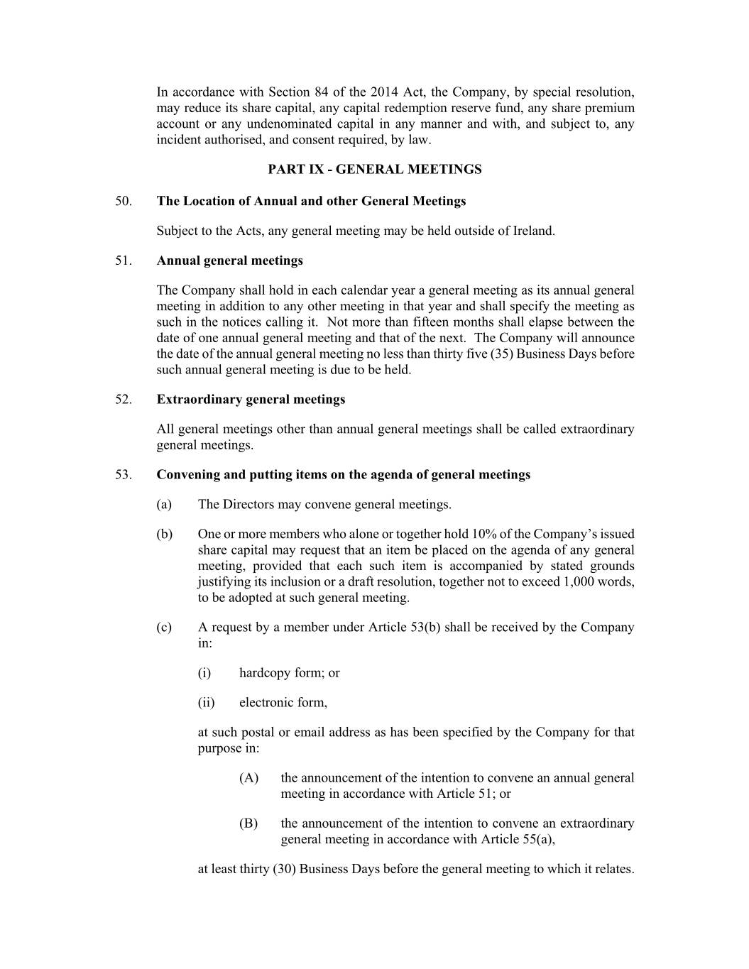 In accordance with Section 84 of the 2014 Act, the Company, by special resolution, may reduce its share capital, any capital redemption reserve fund, any share premium account or any undenominated capital in any manner and with, and subject to, any incident authorised, and consent required, by law. PART IX - GENERAL MEETINGS 50. The Location of Annual and other General Meetings Subject to the Acts, any general meeting may be held outside of Ireland. 51. Annual general meetings The Company shall hold in each calendar year a general meeting as its annual general meeting in addition to any other meeting in that year and shall specify the meeting as such in the notices calling it. Not more than fifteen months shall elapse between the date of one annual general meeting and that of the next. The Company will announce the date of the annual general meeting no less than thirty five (35) Business Days before such annual general meeting is due to be held. 52. Extraordinary general meetings All general meetings other than annual general meetings shall be called extraordinary general meetings. 53. Convening and putting items on the agenda of general meetings (a) The Directors may convene general meetings. (b) One or more members who alone or together hold 10% of the Company’s issued share capital may request that an item be placed on the agenda of any general meeting, provided that each such item is accompanied by stated grounds justifying its inclusion or a draft resolution, together not to exceed 1,000 words, to be adopted at such general meeting. (c) A request by a member under Article 53(b) shall be received by the Company in: (i) hardcopy form; or (ii) electronic form, at such postal or email address as has been specified by the Company for that purpose in: (A) the announcement of the intention to convene an annual general meeting in accordance with Article 51; or (B) the announcement of the intention to convene an extraordinary general meeting in accordance with Article 55(a), at least thirty (30) Business Days before the general meeting to which it relates.