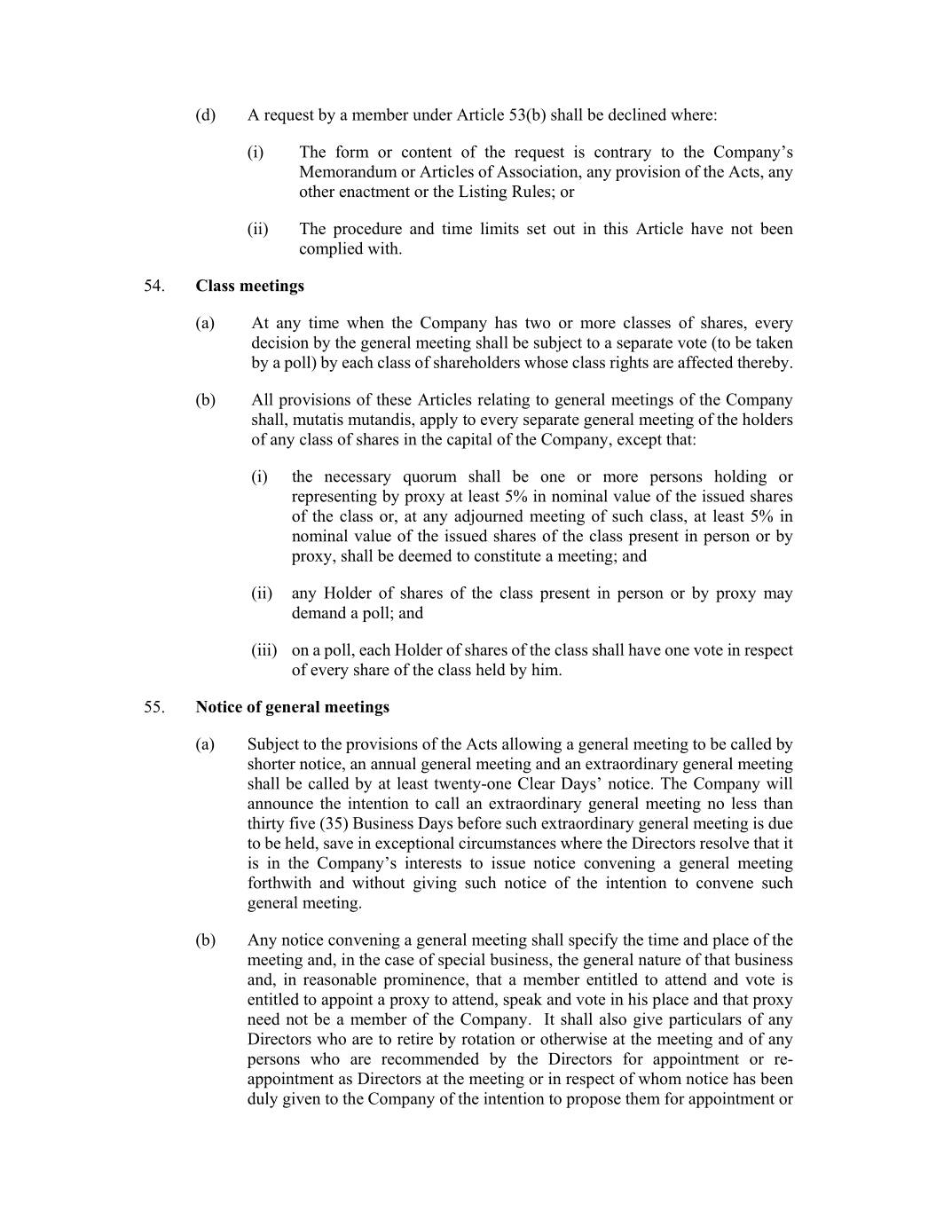 (d) A request by a member under Article 53(b) shall be declined where: (i) The form or content of the request is contrary to the Company’s Memorandum or Articles of Association, any provision of the Acts, any other enactment or the Listing Rules; or (ii) The procedure and time limits set out in this Article have not been complied with. 54. Class meetings (a) At any time when the Company has two or more classes of shares, every decision by the general meeting shall be subject to a separate vote (to be taken by a poll) by each class of shareholders whose class rights are affected thereby. (b) All provisions of these Articles relating to general meetings of the Company shall, mutatis mutandis, apply to every separate general meeting of the holders of any class of shares in the capital of the Company, except that: (i) the necessary quorum shall be one or more persons holding or representing by proxy at least 5% in nominal value of the issued shares of the class or, at any adjourned meeting of such class, at least 5% in nominal value of the issued shares of the class present in person or by proxy, shall be deemed to constitute a meeting; and (ii) any Holder of shares of the class present in person or by proxy may demand a poll; and (iii) on a poll, each Holder of shares of the class shall have one vote in respect of every share of the class held by him. 55. Notice of general meetings (a) Subject to the provisions of the Acts allowing a general meeting to be called by shorter notice, an annual general meeting and an extraordinary general meeting shall be called by at least twenty-one Clear Days’ notice. The Company will announce the intention to call an extraordinary general meeting no less than thirty five (35) Business Days before such extraordinary general meeting is due to be held, save in exceptional circumstances where the Directors resolve that it is in the Company’s interests to issue notice convening a general meeting forthwith and without giving such notice of the intention to convene such general meeting. (b) Any notice convening a general meeting shall specify the time and place of the meeting and, in the case of special business, the general nature of that business and, in reasonable prominence, that a member entitled to attend and vote is entitled to appoint a proxy to attend, speak and vote in his place and that proxy need not be a member of the Company. It shall also give particulars of any Directors who are to retire by rotation or otherwise at the meeting and of any persons who are recommended by the Directors for appointment or re- appointment as Directors at the meeting or in respect of whom notice has been duly given to the Company of the intention to propose them for appointment or