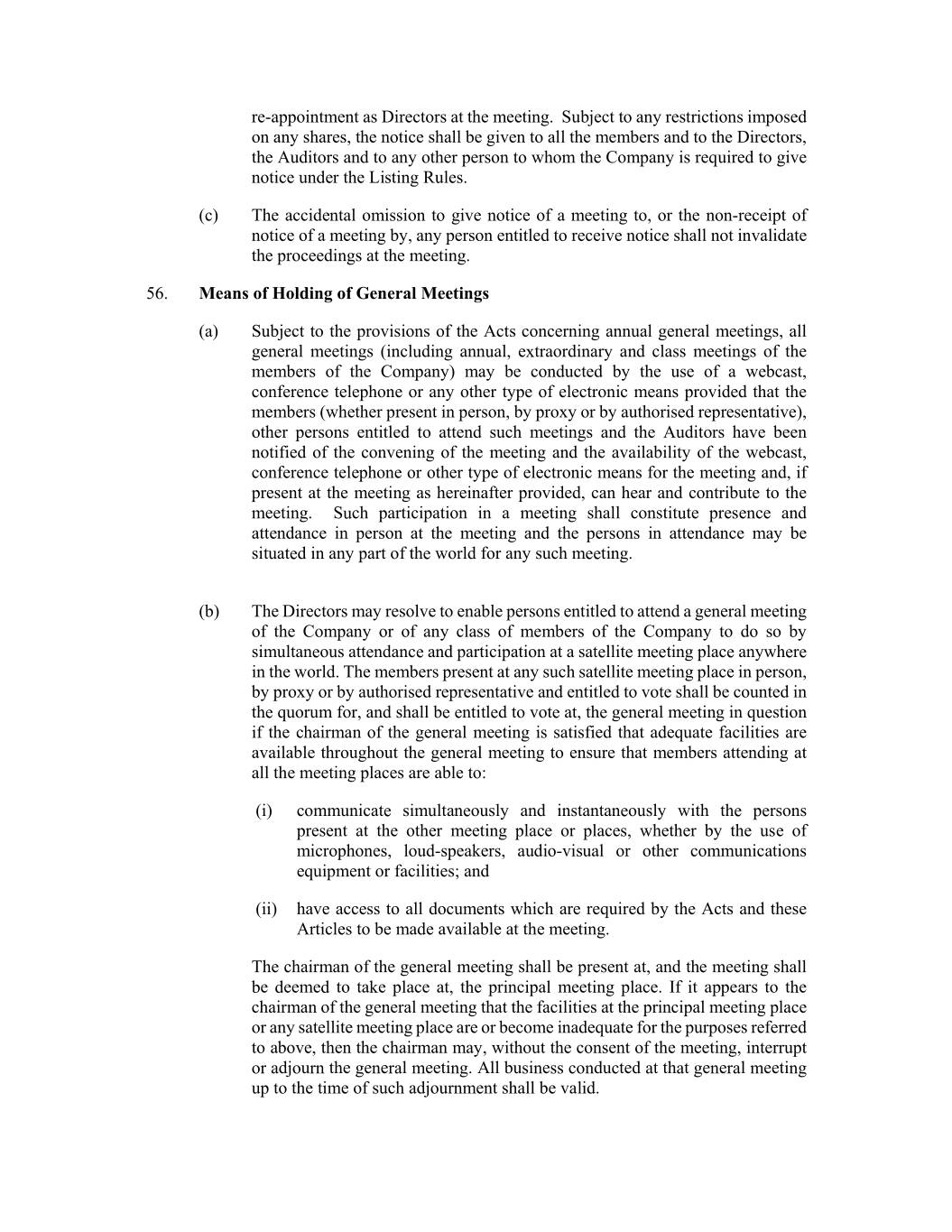 re-appointment as Directors at the meeting. Subject to any restrictions imposed on any shares, the notice shall be given to all the members and to the Directors, the Auditors and to any other person to whom the Company is required to give notice under the Listing Rules. (c) The accidental omission to give notice of a meeting to, or the non-receipt of notice of a meeting by, any person entitled to receive notice shall not invalidate the proceedings at the meeting. 56. Means of Holding of General Meetings (a) Subject to the provisions of the Acts concerning annual general meetings, all general meetings (including annual, extraordinary and class meetings of the members of the Company) may be conducted by the use of a webcast, conference telephone or any other type of electronic means provided that the members (whether present in person, by proxy or by authorised representative), other persons entitled to attend such meetings and the Auditors have been notified of the convening of the meeting and the availability of the webcast, conference telephone or other type of electronic means for the meeting and, if present at the meeting as hereinafter provided, can hear and contribute to the meeting. Such participation in a meeting shall constitute presence and attendance in person at the meeting and the persons in attendance may be situated in any part of the world for any such meeting. (b) The Directors may resolve to enable persons entitled to attend a general meeting of the Company or of any class of members of the Company to do so by simultaneous attendance and participation at a satellite meeting place anywhere in the world. The members present at any such satellite meeting place in person, by proxy or by authorised representative and entitled to vote shall be counted in the quorum for, and shall be entitled to vote at, the general meeting in question if the chairman of the general meeting is satisfied that adequate facilities are available throughout the general meeting to ensure that members attending at all the meeting places are able to: (i) communicate simultaneously and instantaneously with the persons present at the other meeting place or places, whether by the use of microphones, loud-speakers, audio-visual or other communications equipment or facilities; and (ii) have access to all documents which are required by the Acts and these Articles to be made available at the meeting. The chairman of the general meeting shall be present at, and the meeting shall be deemed to take place at, the principal meeting place. If it appears to the chairman of the general meeting that the facilities at the principal meeting place or any satellite meeting place are or become inadequate for the purposes referred to above, then the chairman may, without the consent of the meeting, interrupt or adjourn the general meeting. All business conducted at that general meeting up to the time of such adjournment shall be valid.