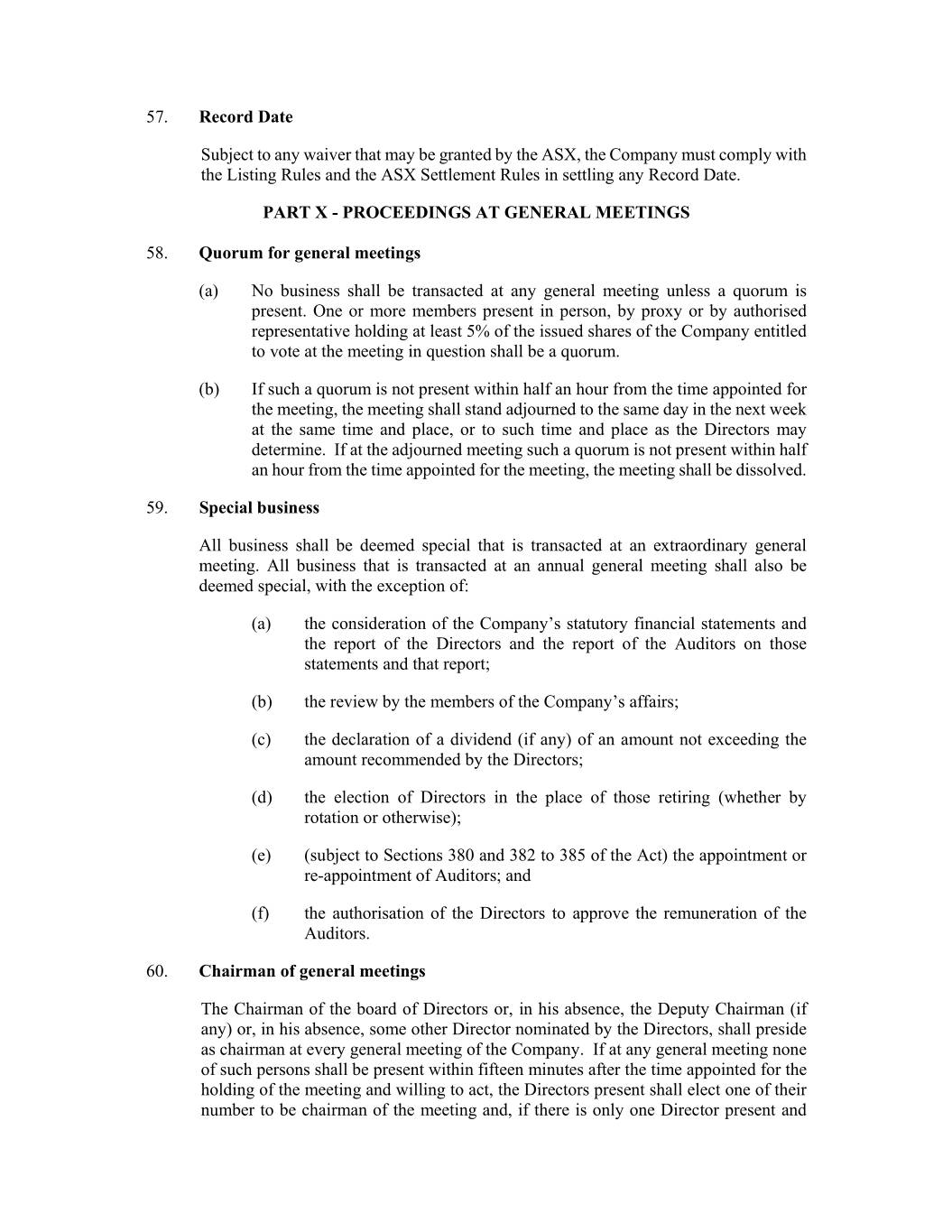 57. Record Date Subject to any waiver that may be granted by the ASX, the Company must comply with the Listing Rules and the ASX Settlement Rules in settling any Record Date. PART X - PROCEEDINGS AT GENERAL MEETINGS 58. Quorum for general meetings (a) No business shall be transacted at any general meeting unless a quorum is present. One or more members present in person, by proxy or by authorised representative holding at least 5% of the issued shares of the Company entitled to vote at the meeting in question shall be a quorum. (b) If such a quorum is not present within half an hour from the time appointed for the meeting, the meeting shall stand adjourned to the same day in the next week at the same time and place, or to such time and place as the Directors may determine. If at the adjourned meeting such a quorum is not present within half an hour from the time appointed for the meeting, the meeting shall be dissolved. 59. Special business All business shall be deemed special that is transacted at an extraordinary general meeting. All business that is transacted at an annual general meeting shall also be deemed special, with the exception of: (a) the consideration of the Company’s statutory financial statements and the report of the Directors and the report of the Auditors on those statements and that report; (b) the review by the members of the Company’s affairs; (c) the declaration of a dividend (if any) of an amount not exceeding the amount recommended by the Directors; (d) the election of Directors in the place of those retiring (whether by rotation or otherwise); (e) (subject to Sections 380 and 382 to 385 of the Act) the appointment or re-appointment of Auditors; and (f) the authorisation of the Directors to approve the remuneration of the Auditors. 60. Chairman of general meetings The Chairman of the board of Directors or, in his absence, the Deputy Chairman (if any) or, in his absence, some other Director nominated by the Directors, shall preside as chairman at every general meeting of the Company. If at any general meeting none of such persons shall be present within fifteen minutes after the time appointed for the holding of the meeting and willing to act, the Directors present shall elect one of their number to be chairman of the meeting and, if there is only one Director present and