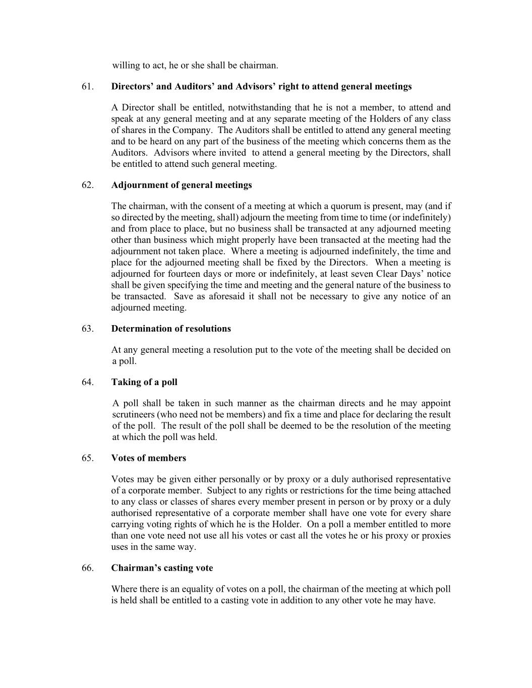 willing to act, he or she shall be chairman. 61. Directors’ and Auditors’ and Advisors’ right to attend general meetings A Director shall be entitled, notwithstanding that he is not a member, to attend and speak at any general meeting and at any separate meeting of the Holders of any class of shares in the Company. The Auditors shall be entitled to attend any general meeting and to be heard on any part of the business of the meeting which concerns them as the Auditors. Advisors where invited to attend a general meeting by the Directors, shall be entitled to attend such general meeting. 62. Adjournment of general meetings The chairman, with the consent of a meeting at which a quorum is present, may (and if so directed by the meeting, shall) adjourn the meeting from time to time (or indefinitely) and from place to place, but no business shall be transacted at any adjourned meeting other than business which might properly have been transacted at the meeting had the adjournment not taken place. Where a meeting is adjourned indefinitely, the time and place for the adjourned meeting shall be fixed by the Directors. When a meeting is adjourned for fourteen days or more or indefinitely, at least seven Clear Days’ notice shall be given specifying the time and meeting and the general nature of the business to be transacted. Save as aforesaid it shall not be necessary to give any notice of an adjourned meeting. 63. Determination of resolutions At any general meeting a resolution put to the vote of the meeting shall be decided on a poll. 64. Taking of a poll A poll shall be taken in such manner as the chairman directs and he may appoint scrutineers (who need not be members) and fix a time and place for declaring the result of the poll. The result of the poll shall be deemed to be the resolution of the meeting at which the poll was held. 65. Votes of members Votes may be given either personally or by proxy or a duly authorised representative of a corporate member. Subject to any rights or restrictions for the time being attached to any class or classes of shares every member present in person or by proxy or a duly authorised representative of a corporate member shall have one vote for every share carrying voting rights of which he is the Holder. On a poll a member entitled to more than one vote need not use all his votes or cast all the votes he or his proxy or proxies uses in the same way. 66. Chairman’s casting vote Where there is an equality of votes on a poll, the chairman of the meeting at which poll is held shall be entitled to a casting vote in addition to any other vote he may have.