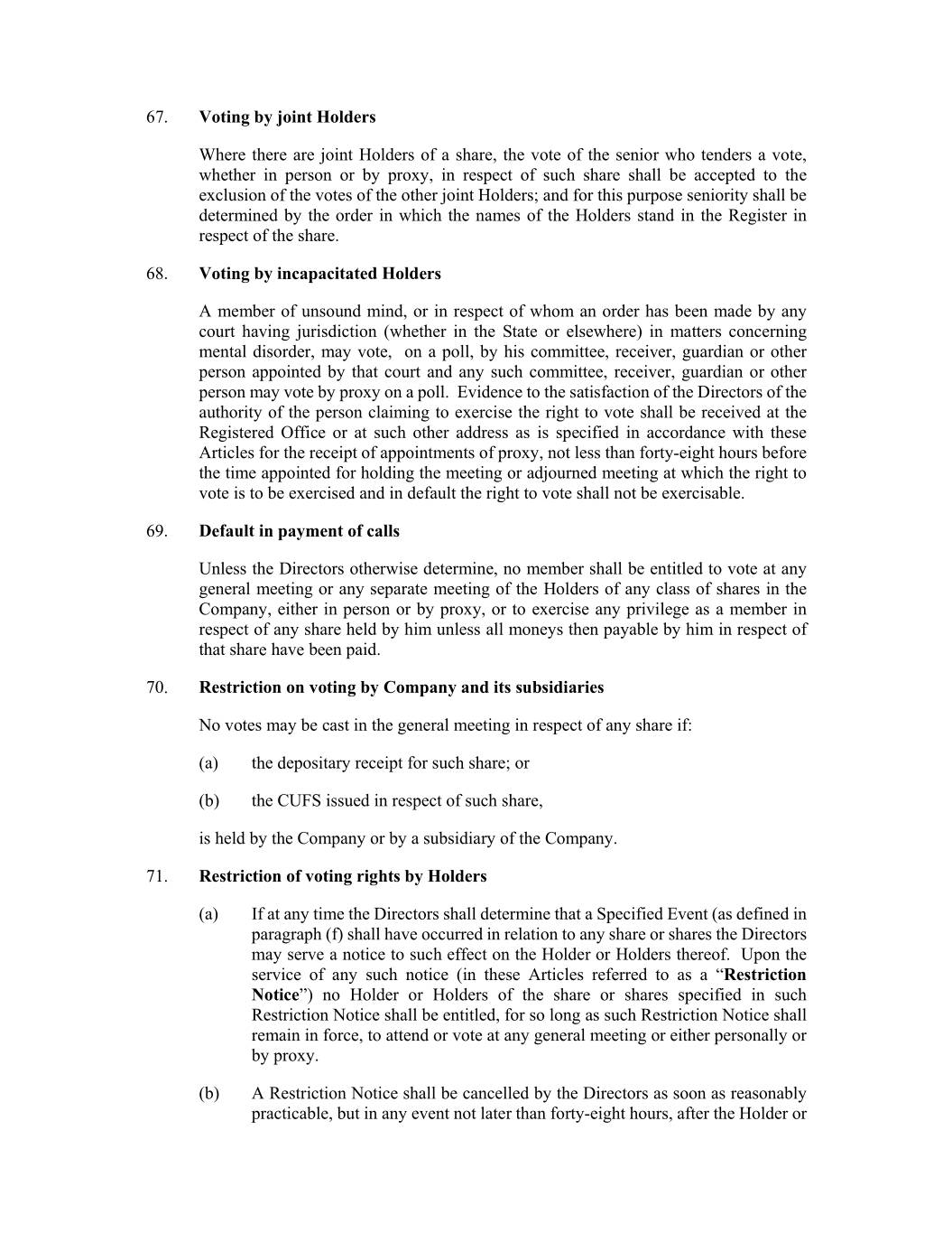 67. Voting by joint Holders Where there are joint Holders of a share, the vote of the senior who tenders a vote, whether in person or by proxy, in respect of such share shall be accepted to the exclusion of the votes of the other joint Holders; and for this purpose seniority shall be determined by the order in which the names of the Holders stand in the Register in respect of the share. 68. Voting by incapacitated Holders A member of unsound mind, or in respect of whom an order has been made by any court having jurisdiction (whether in the State or elsewhere) in matters concerning mental disorder, may vote, on a poll, by his committee, receiver, guardian or other person appointed by that court and any such committee, receiver, guardian or other person may vote by proxy on a poll. Evidence to the satisfaction of the Directors of the authority of the person claiming to exercise the right to vote shall be received at the Registered Office or at such other address as is specified in accordance with these Articles for the receipt of appointments of proxy, not less than forty-eight hours before the time appointed for holding the meeting or adjourned meeting at which the right to vote is to be exercised and in default the right to vote shall not be exercisable. 69. Default in payment of calls Unless the Directors otherwise determine, no member shall be entitled to vote at any general meeting or any separate meeting of the Holders of any class of shares in the Company, either in person or by proxy, or to exercise any privilege as a member in respect of any share held by him unless all moneys then payable by him in respect of that share have been paid. 70. Restriction on voting by Company and its subsidiaries No votes may be cast in the general meeting in respect of any share if: (a) the depositary receipt for such share; or (b) the CUFS issued in respect of such share, is held by the Company or by a subsidiary of the Company. 71. Restriction of voting rights by Holders (a) If at any time the Directors shall determine that a Specified Event (as defined in paragraph (f) shall have occurred in relation to any share or shares the Directors may serve a notice to such effect on the Holder or Holders thereof. Upon the service of any such notice (in these Articles referred to as a “Restriction Notice”) no Holder or Holders of the share or shares specified in such Restriction Notice shall be entitled, for so long as such Restriction Notice shall remain in force, to attend or vote at any general meeting or either personally or by proxy. (b) A Restriction Notice shall be cancelled by the Directors as soon as reasonably practicable, but in any event not later than forty-eight hours, after the Holder or