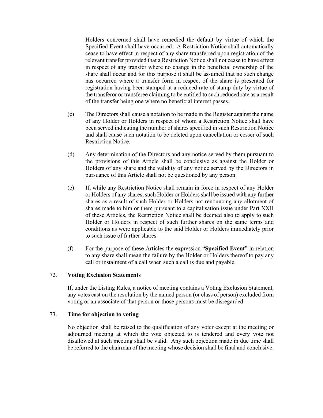 Holders concerned shall have remedied the default by virtue of which the Specified Event shall have occurred. A Restriction Notice shall automatically cease to have effect in respect of any share transferred upon registration of the relevant transfer provided that a Restriction Notice shall not cease to have effect in respect of any transfer where no change in the beneficial ownership of the share shall occur and for this purpose it shall be assumed that no such change has occurred where a transfer form in respect of the share is presented for registration having been stamped at a reduced rate of stamp duty by virtue of the transferor or transferee claiming to be entitled to such reduced rate as a result of the transfer being one where no beneficial interest passes. (c) The Directors shall cause a notation to be made in the Register against the name of any Holder or Holders in respect of whom a Restriction Notice shall have been served indicating the number of shares specified in such Restriction Notice and shall cause such notation to be deleted upon cancellation or cesser of such Restriction Notice. (d) Any determination of the Directors and any notice served by them pursuant to the provisions of this Article shall be conclusive as against the Holder or Holders of any share and the validity of any notice served by the Directors in pursuance of this Article shall not be questioned by any person. (e) If, while any Restriction Notice shall remain in force in respect of any Holder or Holders of any shares, such Holder or Holders shall be issued with any further shares as a result of such Holder or Holders not renouncing any allotment of shares made to him or them pursuant to a capitalisation issue under Part XXII of these Articles, the Restriction Notice shall be deemed also to apply to such Holder or Holders in respect of such further shares on the same terms and conditions as were applicable to the said Holder or Holders immediately prior to such issue of further shares. (f) For the purpose of these Articles the expression “Specified Event” in relation to any share shall mean the failure by the Holder or Holders thereof to pay any call or instalment of a call when such a call is due and payable. 72. Voting Exclusion Statements If, under the Listing Rules, a notice of meeting contains a Voting Exclusion Statement, any votes cast on the resolution by the named person (or class of person) excluded from voting or an associate of that person or those persons must be disregarded. 73. Time for objection to voting No objection shall be raised to the qualification of any voter except at the meeting or adjourned meeting at which the vote objected to is tendered and every vote not disallowed at such meeting shall be valid. Any such objection made in due time shall be referred to the chairman of the meeting whose decision shall be final and conclusive.