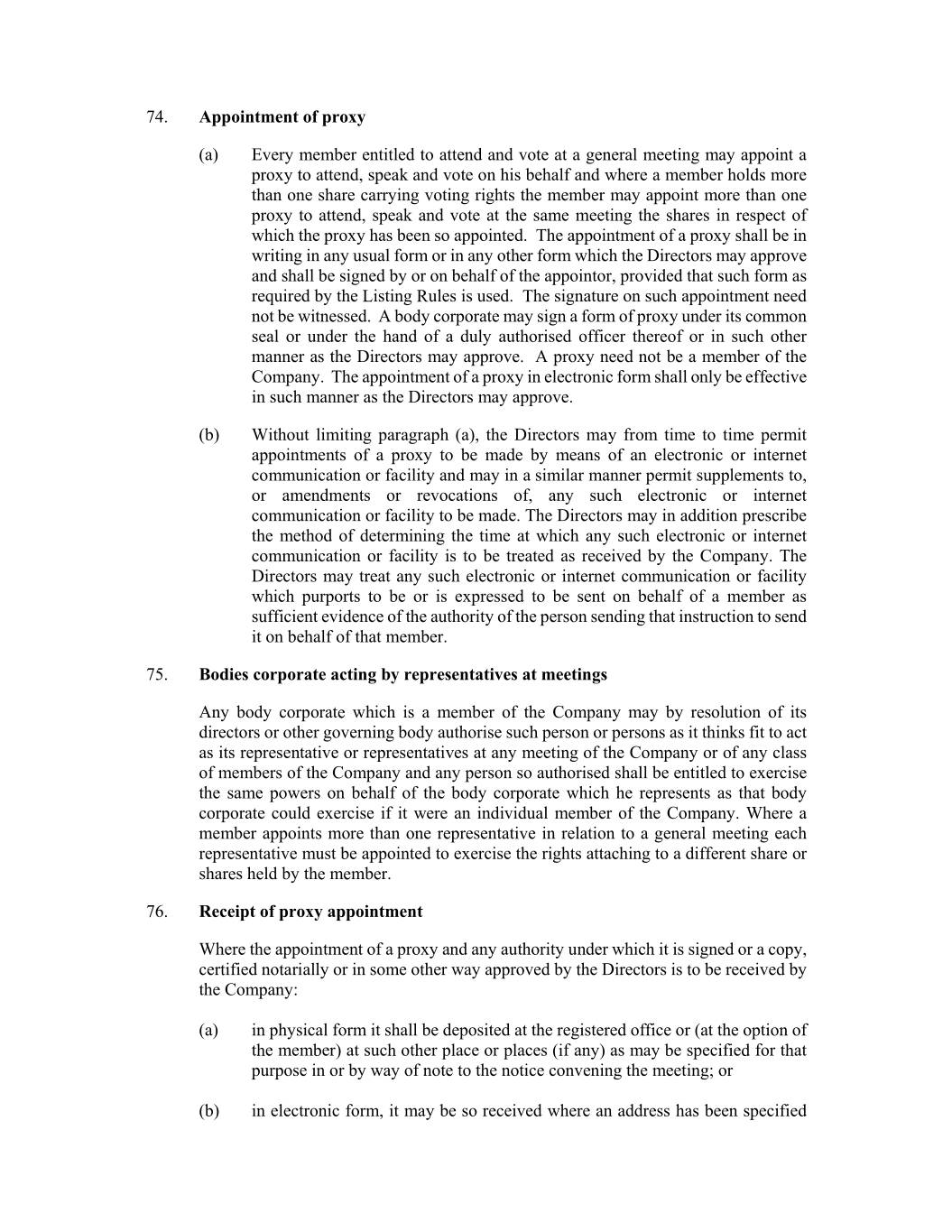 74. Appointment of proxy (a) Every member entitled to attend and vote at a general meeting may appoint a proxy to attend, speak and vote on his behalf and where a member holds more than one share carrying voting rights the member may appoint more than one proxy to attend, speak and vote at the same meeting the shares in respect of which the proxy has been so appointed. The appointment of a proxy shall be in writing in any usual form or in any other form which the Directors may approve and shall be signed by or on behalf of the appointor, provided that such form as required by the Listing Rules is used. The signature on such appointment need not be witnessed. A body corporate may sign a form of proxy under its common seal or under the hand of a duly authorised officer thereof or in such other manner as the Directors may approve. A proxy need not be a member of the Company. The appointment of a proxy in electronic form shall only be effective in such manner as the Directors may approve. (b) Without limiting paragraph (a), the Directors may from time to time permit appointments of a proxy to be made by means of an electronic or internet communication or facility and may in a similar manner permit supplements to, or amendments or revocations of, any such electronic or internet communication or facility to be made. The Directors may in addition prescribe the method of determining the time at which any such electronic or internet communication or facility is to be treated as received by the Company. The Directors may treat any such electronic or internet communication or facility which purports to be or is expressed to be sent on behalf of a member as sufficient evidence of the authority of the person sending that instruction to send it on behalf of that member. 75. Bodies corporate acting by representatives at meetings Any body corporate which is a member of the Company may by resolution of its directors or other governing body authorise such person or persons as it thinks fit to act as its representative or representatives at any meeting of the Company or of any class of members of the Company and any person so authorised shall be entitled to exercise the same powers on behalf of the body corporate which he represents as that body corporate could exercise if it were an individual member of the Company. Where a member appoints more than one representative in relation to a general meeting each representative must be appointed to exercise the rights attaching to a different share or shares held by the member. 76. Receipt of proxy appointment Where the appointment of a proxy and any authority under which it is signed or a copy, certified notarially or in some other way approved by the Directors is to be received by the Company: (a) in physical form it shall be deposited at the registered office or (at the option of the member) at such other place or places (if any) as may be specified for that purpose in or by way of note to the notice convening the meeting; or (b) in electronic form, it may be so received where an address has been specified
