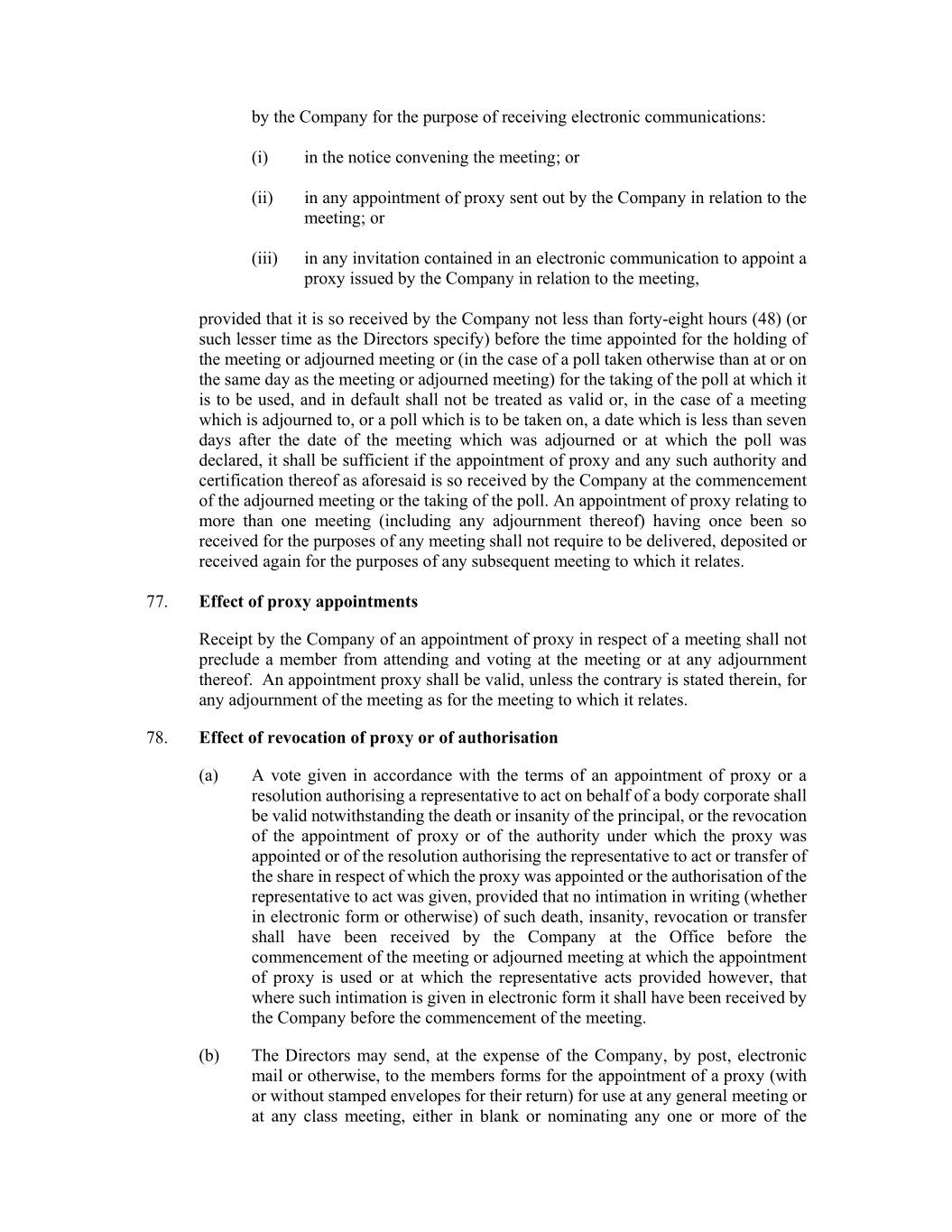 by the Company for the purpose of receiving electronic communications: (i) in the notice convening the meeting; or (ii) in any appointment of proxy sent out by the Company in relation to the meeting; or (iii) in any invitation contained in an electronic communication to appoint a proxy issued by the Company in relation to the meeting, provided that it is so received by the Company not less than forty-eight hours (48) (or such lesser time as the Directors specify) before the time appointed for the holding of the meeting or adjourned meeting or (in the case of a poll taken otherwise than at or on the same day as the meeting or adjourned meeting) for the taking of the poll at which it is to be used, and in default shall not be treated as valid or, in the case of a meeting which is adjourned to, or a poll which is to be taken on, a date which is less than seven days after the date of the meeting which was adjourned or at which the poll was declared, it shall be sufficient if the appointment of proxy and any such authority and certification thereof as aforesaid is so received by the Company at the commencement of the adjourned meeting or the taking of the poll. An appointment of proxy relating to more than one meeting (including any adjournment thereof) having once been so received for the purposes of any meeting shall not require to be delivered, deposited or received again for the purposes of any subsequent meeting to which it relates. 77. Effect of proxy appointments Receipt by the Company of an appointment of proxy in respect of a meeting shall not preclude a member from attending and voting at the meeting or at any adjournment thereof. An appointment proxy shall be valid, unless the contrary is stated therein, for any adjournment of the meeting as for the meeting to which it relates. 78. Effect of revocation of proxy or of authorisation (a) A vote given in accordance with the terms of an appointment of proxy or a resolution authorising a representative to act on behalf of a body corporate shall be valid notwithstanding the death or insanity of the principal, or the revocation of the appointment of proxy or of the authority under which the proxy was appointed or of the resolution authorising the representative to act or transfer of the share in respect of which the proxy was appointed or the authorisation of the representative to act was given, provided that no intimation in writing (whether in electronic form or otherwise) of such death, insanity, revocation or transfer shall have been received by the Company at the Office before the commencement of the meeting or adjourned meeting at which the appointment of proxy is used or at which the representative acts provided however, that where such intimation is given in electronic form it shall have been received by the Company before the commencement of the meeting. (b) The Directors may send, at the expense of the Company, by post, electronic mail or otherwise, to the members forms for the appointment of a proxy (with or without stamped envelopes for their return) for use at any general meeting or at any class meeting, either in blank or nominating any one or more of the