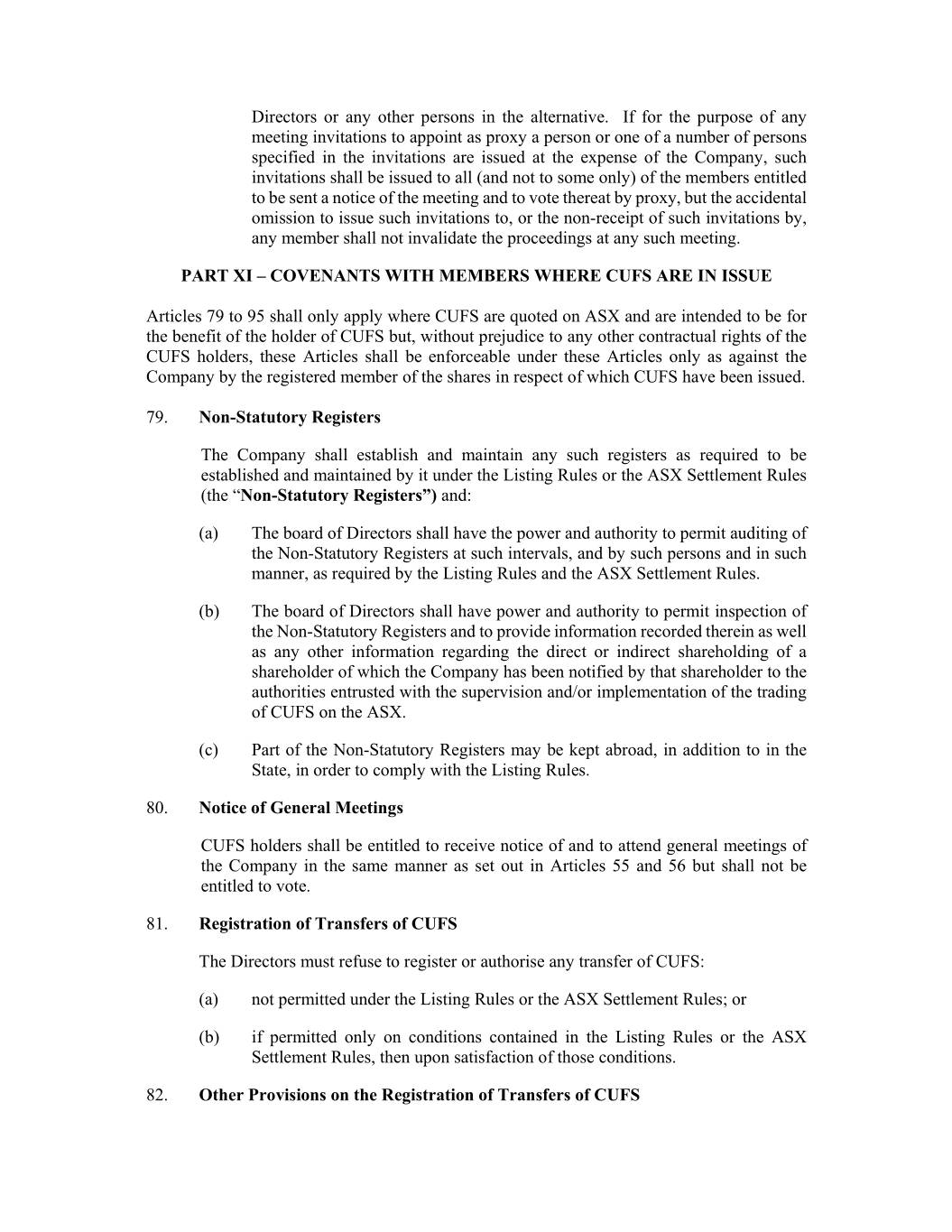 Directors or any other persons in the alternative. If for the purpose of any meeting invitations to appoint as proxy a person or one of a number of persons specified in the invitations are issued at the expense of the Company, such invitations shall be issued to all (and not to some only) of the members entitled to be sent a notice of the meeting and to vote thereat by proxy, but the accidental omission to issue such invitations to, or the non-receipt of such invitations by, any member shall not invalidate the proceedings at any such meeting. PART XI – COVENANTS WITH MEMBERS WHERE CUFS ARE IN ISSUE Articles 79 to 95 shall only apply where CUFS are quoted on ASX and are intended to be for the benefit of the holder of CUFS but, without prejudice to any other contractual rights of the CUFS holders, these Articles shall be enforceable under these Articles only as against the Company by the registered member of the shares in respect of which CUFS have been issued. 79. Non-Statutory Registers The Company shall establish and maintain any such registers as required to be established and maintained by it under the Listing Rules or the ASX Settlement Rules (the “Non-Statutory Registers”) and: (a) The board of Directors shall have the power and authority to permit auditing of the Non-Statutory Registers at such intervals, and by such persons and in such manner, as required by the Listing Rules and the ASX Settlement Rules. (b) The board of Directors shall have power and authority to permit inspection of the Non-Statutory Registers and to provide information recorded therein as well as any other information regarding the direct or indirect shareholding of a shareholder of which the Company has been notified by that shareholder to the authorities entrusted with the supervision and/or implementation of the trading of CUFS on the ASX. (c) Part of the Non-Statutory Registers may be kept abroad, in addition to in the State, in order to comply with the Listing Rules. 80. Notice of General Meetings CUFS holders shall be entitled to receive notice of and to attend general meetings of the Company in the same manner as set out in Articles 55 and 56 but shall not be entitled to vote. 81. Registration of Transfers of CUFS The Directors must refuse to register or authorise any transfer of CUFS: (a) not permitted under the Listing Rules or the ASX Settlement Rules; or (b) if permitted only on conditions contained in the Listing Rules or the ASX Settlement Rules, then upon satisfaction of those conditions. 82. Other Provisions on the Registration of Transfers of CUFS