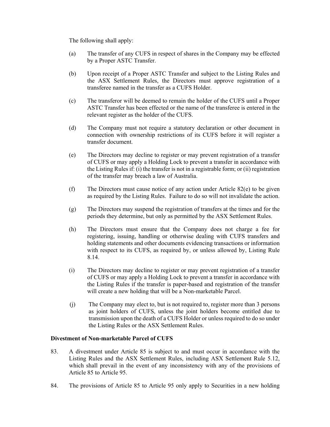 The following shall apply: (a) The transfer of any CUFS in respect of shares in the Company may be effected by a Proper ASTC Transfer. (b) Upon receipt of a Proper ASTC Transfer and subject to the Listing Rules and the ASX Settlement Rules, the Directors must approve registration of a transferee named in the transfer as a CUFS Holder. (c) The transferor will be deemed to remain the holder of the CUFS until a Proper ASTC Transfer has been effected or the name of the transferee is entered in the relevant register as the holder of the CUFS. (d) The Company must not require a statutory declaration or other document in connection with ownership restrictions of its CUFS before it will register a transfer document. (e) The Directors may decline to register or may prevent registration of a transfer of CUFS or may apply a Holding Lock to prevent a transfer in accordance with the Listing Rules if: (i) the transfer is not in a registrable form; or (ii) registration of the transfer may breach a law of Australia. (f) The Directors must cause notice of any action under Article 82(e) to be given as required by the Listing Rules. Failure to do so will not invalidate the action. (g) The Directors may suspend the registration of transfers at the times and for the periods they determine, but only as permitted by the ASX Settlement Rules. (h) The Directors must ensure that the Company does not charge a fee for registering, issuing, handling or otherwise dealing with CUFS transfers and holding statements and other documents evidencing transactions or information with respect to its CUFS, as required by, or unless allowed by, Listing Rule 8.14. (i) The Directors may decline to register or may prevent registration of a transfer of CUFS or may apply a Holding Lock to prevent a transfer in accordance with the Listing Rules if the transfer is paper-based and registration of the transfer will create a new holding that will be a Non-marketable Parcel. (j) The Company may elect to, but is not required to, register more than 3 persons as joint holders of CUFS, unless the joint holders become entitled due to transmission upon the death of a CUFS Holder or unless required to do so under the Listing Rules or the ASX Settlement Rules. Divestment of Non-marketable Parcel of CUFS 83. A divestment under Article 85 is subject to and must occur in accordance with the Listing Rules and the ASX Settlement Rules, including ASX Settlement Rule 5.12, which shall prevail in the event of any inconsistency with any of the provisions of Article 85 to Article 95. 84. The provisions of Article 85 to Article 95 only apply to Securities in a new holding