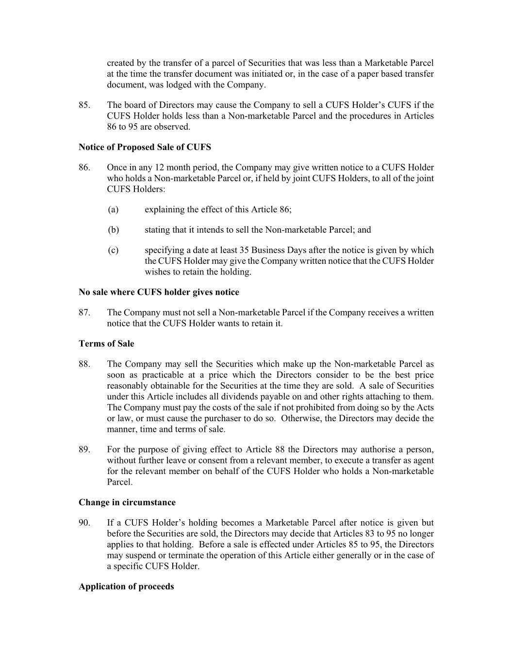 created by the transfer of a parcel of Securities that was less than a Marketable Parcel at the time the transfer document was initiated or, in the case of a paper based transfer document, was lodged with the Company. 85. The board of Directors may cause the Company to sell a CUFS Holder’s CUFS if the CUFS Holder holds less than a Non-marketable Parcel and the procedures in Articles 86 to 95 are observed. Notice of Proposed Sale of CUFS 86. Once in any 12 month period, the Company may give written notice to a CUFS Holder who holds a Non-marketable Parcel or, if held by joint CUFS Holders, to all of the joint CUFS Holders: (a) explaining the effect of this Article 86; (b) stating that it intends to sell the Non-marketable Parcel; and (c) specifying a date at least 35 Business Days after the notice is given by which the CUFS Holder may give the Company written notice that the CUFS Holder wishes to retain the holding. No sale where CUFS holder gives notice 87. The Company must not sell a Non-marketable Parcel if the Company receives a written notice that the CUFS Holder wants to retain it. Terms of Sale 88. The Company may sell the Securities which make up the Non-marketable Parcel as soon as practicable at a price which the Directors consider to be the best price reasonably obtainable for the Securities at the time they are sold. A sale of Securities under this Article includes all dividends payable on and other rights attaching to them. The Company must pay the costs of the sale if not prohibited from doing so by the Acts or law, or must cause the purchaser to do so. Otherwise, the Directors may decide the manner, time and terms of sale. 89. For the purpose of giving effect to Article 88 the Directors may authorise a person, without further leave or consent from a relevant member, to execute a transfer as agent for the relevant member on behalf of the CUFS Holder who holds a Non-marketable Parcel. Change in circumstance 90. If a CUFS Holder’s holding becomes a Marketable Parcel after notice is given but before the Securities are sold, the Directors may decide that Articles 83 to 95 no longer applies to that holding. Before a sale is effected under Articles 85 to 95, the Directors may suspend or terminate the operation of this Article either generally or in the case of a specific CUFS Holder. Application of proceeds