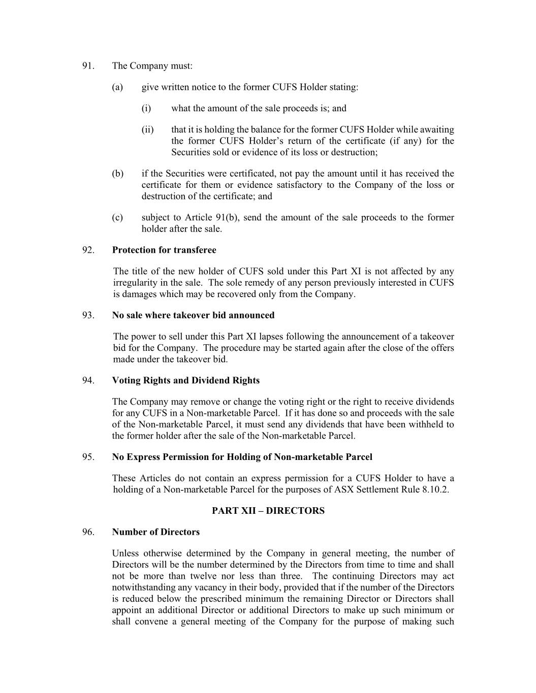 91. The Company must: (a) give written notice to the former CUFS Holder stating: (i) what the amount of the sale proceeds is; and (ii) that it is holding the balance for the former CUFS Holder while awaiting the former CUFS Holder’s return of the certificate (if any) for the Securities sold or evidence of its loss or destruction; (b) if the Securities were certificated, not pay the amount until it has received the certificate for them or evidence satisfactory to the Company of the loss or destruction of the certificate; and (c) subject to Article 91(b), send the amount of the sale proceeds to the former holder after the sale. 92. Protection for transferee The title of the new holder of CUFS sold under this Part XI is not affected by any irregularity in the sale. The sole remedy of any person previously interested in CUFS is damages which may be recovered only from the Company. 93. No sale where takeover bid announced The power to sell under this Part XI lapses following the announcement of a takeover bid for the Company. The procedure may be started again after the close of the offers made under the takeover bid. 94. Voting Rights and Dividend Rights The Company may remove or change the voting right or the right to receive dividends for any CUFS in a Non-marketable Parcel. If it has done so and proceeds with the sale of the Non-marketable Parcel, it must send any dividends that have been withheld to the former holder after the sale of the Non-marketable Parcel. 95. No Express Permission for Holding of Non-marketable Parcel These Articles do not contain an express permission for a CUFS Holder to have a holding of a Non-marketable Parcel for the purposes of ASX Settlement Rule 8.10.2. PART XII – DIRECTORS 96. Number of Directors Unless otherwise determined by the Company in general meeting, the number of Directors will be the number determined by the Directors from time to time and shall not be more than twelve nor less than three. The continuing Directors may act notwithstanding any vacancy in their body, provided that if the number of the Directors is reduced below the prescribed minimum the remaining Director or Directors shall appoint an additional Director or additional Directors to make up such minimum or shall convene a general meeting of the Company for the purpose of making such