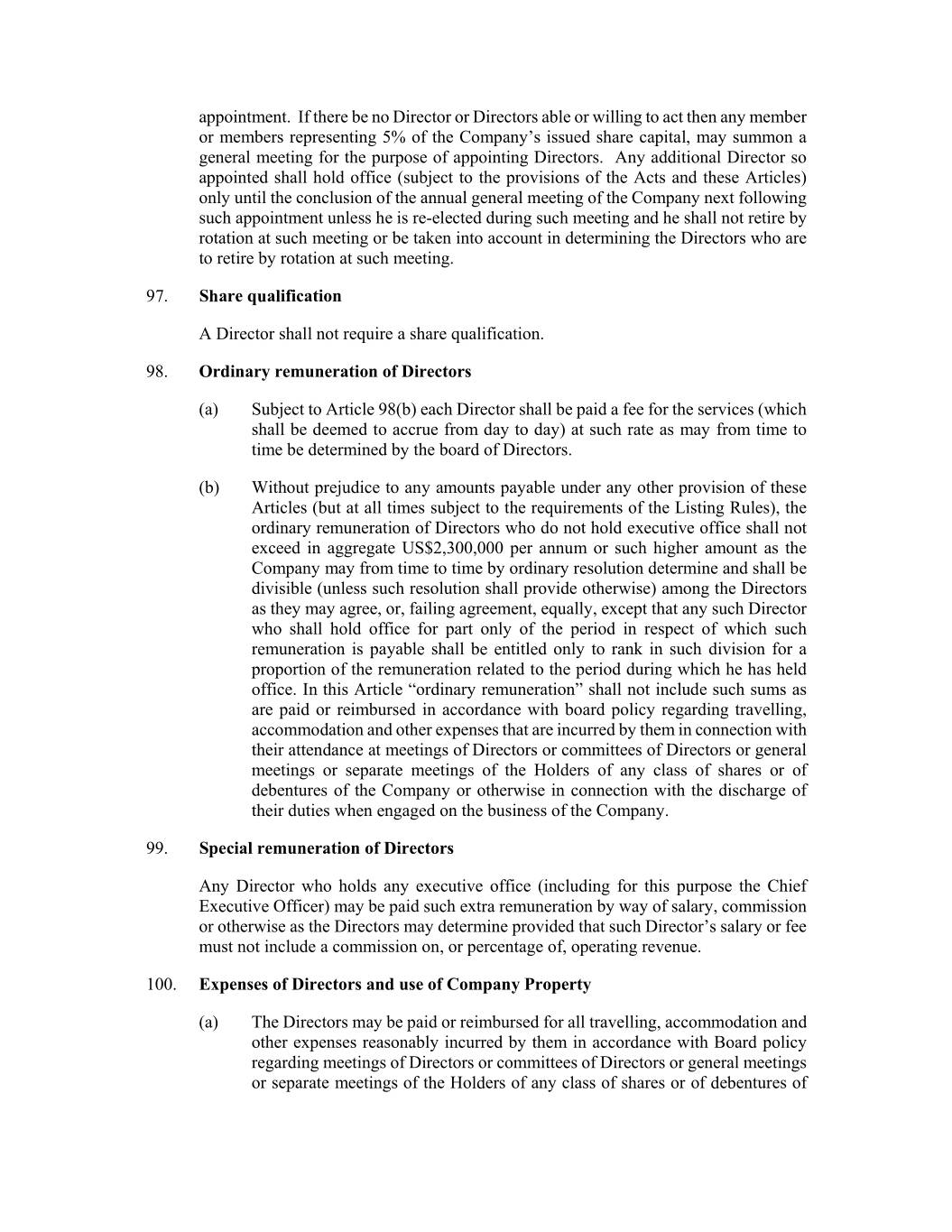 appointment. If there be no Director or Directors able or willing to act then any member or members representing 5% of the Company’s issued share capital, may summon a general meeting for the purpose of appointing Directors. Any additional Director so appointed shall hold office (subject to the provisions of the Acts and these Articles) only until the conclusion of the annual general meeting of the Company next following such appointment unless he is re-elected during such meeting and he shall not retire by rotation at such meeting or be taken into account in determining the Directors who are to retire by rotation at such meeting. 97. Share qualification A Director shall not require a share qualification. 98. Ordinary remuneration of Directors (a) Subject to Article 98(b) each Director shall be paid a fee for the services (which shall be deemed to accrue from day to day) at such rate as may from time to time be determined by the board of Directors. (b) Without prejudice to any amounts payable under any other provision of these Articles (but at all times subject to the requirements of the Listing Rules), the ordinary remuneration of Directors who do not hold executive office shall not exceed in aggregate US$2,300,000 per annum or such higher amount as the Company may from time to time by ordinary resolution determine and shall be divisible (unless such resolution shall provide otherwise) among the Directors as they may agree, or, failing agreement, equally, except that any such Director who shall hold office for part only of the period in respect of which such remuneration is payable shall be entitled only to rank in such division for a proportion of the remuneration related to the period during which he has held office. In this Article “ordinary remuneration” shall not include such sums as are paid or reimbursed in accordance with board policy regarding travelling, accommodation and other expenses that are incurred by them in connection with their attendance at meetings of Directors or committees of Directors or general meetings or separate meetings of the Holders of any class of shares or of debentures of the Company or otherwise in connection with the discharge of their duties when engaged on the business of the Company. 99. Special remuneration of Directors Any Director who holds any executive office (including for this purpose the Chief Executive Officer) may be paid such extra remuneration by way of salary, commission or otherwise as the Directors may determine provided that such Director’s salary or fee must not include a commission on, or percentage of, operating revenue. 100. Expenses of Directors and use of Company Property (a) The Directors may be paid or reimbursed for all travelling, accommodation and other expenses reasonably incurred by them in accordance with Board policy regarding meetings of Directors or committees of Directors or general meetings or separate meetings of the Holders of any class of shares or of debentures of