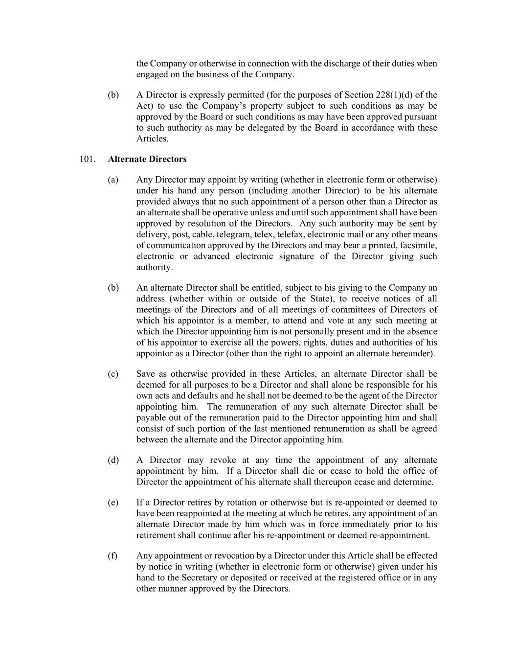 the Company or otherwise in connection with the discharge of their duties when engaged on the business of the Company. (b) A Director is expressly permitted (for the purposes of Section 228(1)(d) of the Act) to use the Company’s property subject to such conditions as may be approved by the Board or such conditions as may have been approved pursuant to such authority as may be delegated by the Board in accordance with these Articles. 101. Alternate Directors (a) Any Director may appoint by writing (whether in electronic form or otherwise) under his hand any person (including another Director) to be his alternate provided always that no such appointment of a person other than a Director as an alternate shall be operative unless and until such appointment shall have been approved by resolution of the Directors. Any such authority may be sent by delivery, post, cable, telegram, telex, telefax, electronic mail or any other means of communication approved by the Directors and may bear a printed, facsimile, electronic or advanced electronic signature of the Director giving such authority. (b) An alternate Director shall be entitled, subject to his giving to the Company an address (whether within or outside of the State), to receive notices of all meetings of the Directors and of all meetings of committees of Directors of which his appointor is a member, to attend and vote at any such meeting at which the Director appointing him is not personally present and in the absence of his appointor to exercise all the powers, rights, duties and authorities of his appointor as a Director (other than the right to appoint an alternate hereunder). (c) Save as otherwise provided in these Articles, an alternate Director shall be deemed for all purposes to be a Director and shall alone be responsible for his own acts and defaults and he shall not be deemed to be the agent of the Director appointing him. The remuneration of any such alternate Director shall be payable out of the remuneration paid to the Director appointing him and shall consist of such portion of the last mentioned remuneration as shall be agreed between the alternate and the Director appointing him. (d) A Director may revoke at any time the appointment of any alternate appointment by him. If a Director shall die or cease to hold the office of Director the appointment of his alternate shall thereupon cease and determine. (e) If a Director retires by rotation or otherwise but is re-appointed or deemed to have been reappointed at the meeting at which he retires, any appointment of an alternate Director made by him which was in force immediately prior to his retirement shall continue after his re-appointment or deemed re-appointment. (f) Any appointment or revocation by a Director under this Article shall be effected by notice in writing (whether in electronic form or otherwise) given under his hand to the Secretary or deposited or received at the registered office or in any other manner approved by the Directors.