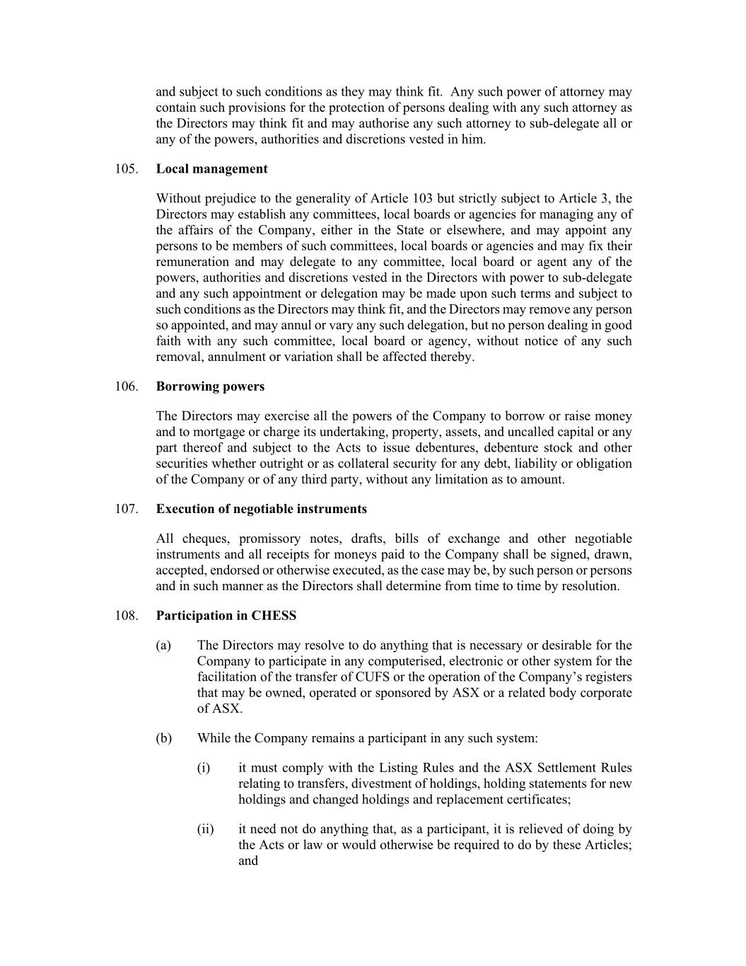 and subject to such conditions as they may think fit. Any such power of attorney may contain such provisions for the protection of persons dealing with any such attorney as the Directors may think fit and may authorise any such attorney to sub-delegate all or any of the powers, authorities and discretions vested in him. 105. Local management Without prejudice to the generality of Article 103 but strictly subject to Article 3, the Directors may establish any committees, local boards or agencies for managing any of the affairs of the Company, either in the State or elsewhere, and may appoint any persons to be members of such committees, local boards or agencies and may fix their remuneration and may delegate to any committee, local board or agent any of the powers, authorities and discretions vested in the Directors with power to sub-delegate and any such appointment or delegation may be made upon such terms and subject to such conditions as the Directors may think fit, and the Directors may remove any person so appointed, and may annul or vary any such delegation, but no person dealing in good faith with any such committee, local board or agency, without notice of any such removal, annulment or variation shall be affected thereby. 106. Borrowing powers The Directors may exercise all the powers of the Company to borrow or raise money and to mortgage or charge its undertaking, property, assets, and uncalled capital or any part thereof and subject to the Acts to issue debentures, debenture stock and other securities whether outright or as collateral security for any debt, liability or obligation of the Company or of any third party, without any limitation as to amount. 107. Execution of negotiable instruments All cheques, promissory notes, drafts, bills of exchange and other negotiable instruments and all receipts for moneys paid to the Company shall be signed, drawn, accepted, endorsed or otherwise executed, as the case may be, by such person or persons and in such manner as the Directors shall determine from time to time by resolution. 108. Participation in CHESS (a) The Directors may resolve to do anything that is necessary or desirable for the Company to participate in any computerised, electronic or other system for the facilitation of the transfer of CUFS or the operation of the Company’s registers that may be owned, operated or sponsored by ASX or a related body corporate of ASX. (b) While the Company remains a participant in any such system: (i) it must comply with the Listing Rules and the ASX Settlement Rules relating to transfers, divestment of holdings, holding statements for new holdings and changed holdings and replacement certificates; (ii) it need not do anything that, as a participant, it is relieved of doing by the Acts or law or would otherwise be required to do by these Articles; and