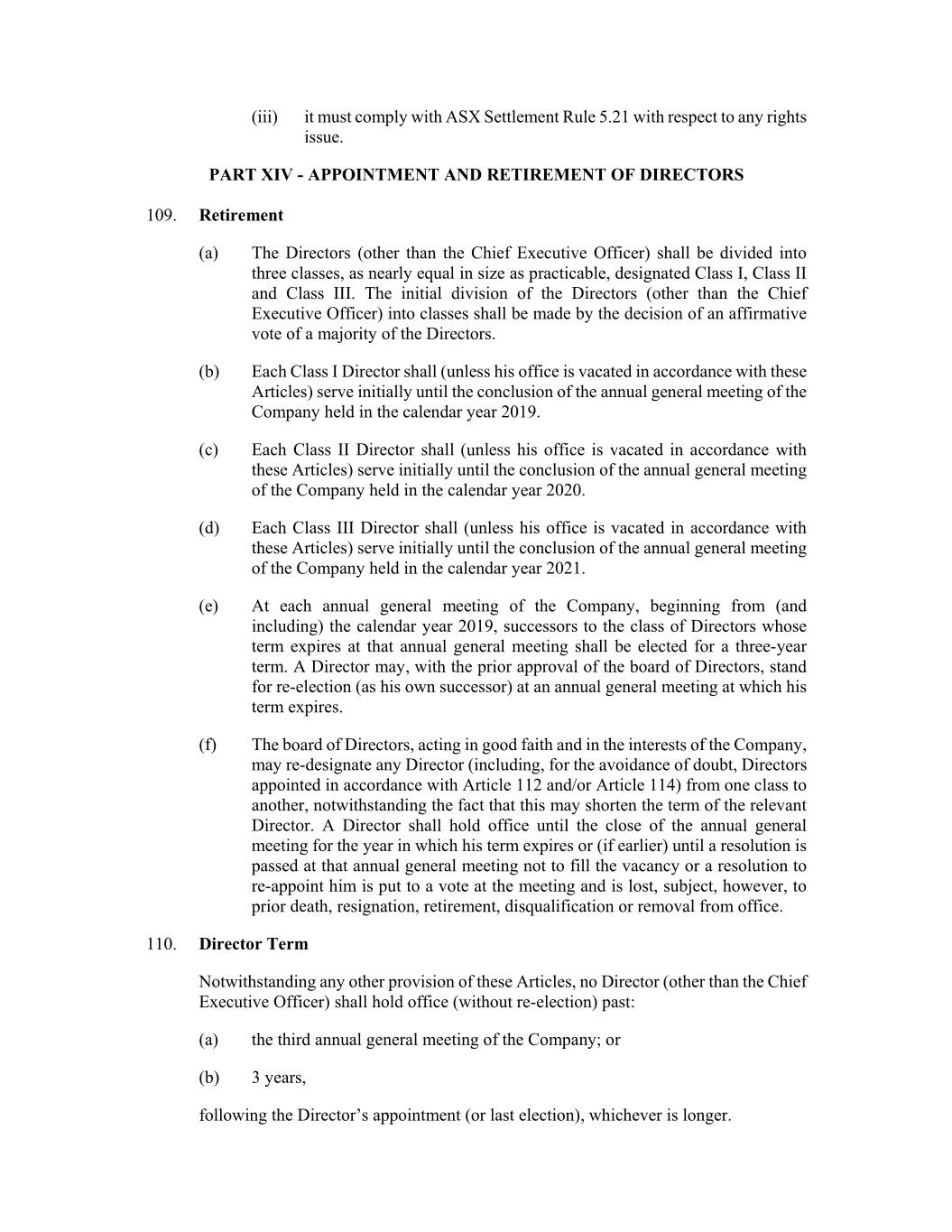 (iii) it must comply with ASX Settlement Rule 5.21 with respect to any rights issue. PART XIV - APPOINTMENT AND RETIREMENT OF DIRECTORS 109. Retirement (a) The Directors (other than the Chief Executive Officer) shall be divided into three classes, as nearly equal in size as practicable, designated Class I, Class II and Class III. The initial division of the Directors (other than the Chief Executive Officer) into classes shall be made by the decision of an affirmative vote of a majority of the Directors. (b) Each Class I Director shall (unless his office is vacated in accordance with these Articles) serve initially until the conclusion of the annual general meeting of the Company held in the calendar year 2019. (c) Each Class II Director shall (unless his office is vacated in accordance with these Articles) serve initially until the conclusion of the annual general meeting of the Company held in the calendar year 2020. (d) Each Class III Director shall (unless his office is vacated in accordance with these Articles) serve initially until the conclusion of the annual general meeting of the Company held in the calendar year 2021. (e) At each annual general meeting of the Company, beginning from (and including) the calendar year 2019, successors to the class of Directors whose term expires at that annual general meeting shall be elected for a three-year term. A Director may, with the prior approval of the board of Directors, stand for re-election (as his own successor) at an annual general meeting at which his term expires. (f) The board of Directors, acting in good faith and in the interests of the Company, may re-designate any Director (including, for the avoidance of doubt, Directors appointed in accordance with Article 112 and/or Article 114) from one class to another, notwithstanding the fact that this may shorten the term of the relevant Director. A Director shall hold office until the close of the annual general meeting for the year in which his term expires or (if earlier) until a resolution is passed at that annual general meeting not to fill the vacancy or a resolution to re-appoint him is put to a vote at the meeting and is lost, subject, however, to prior death, resignation, retirement, disqualification or removal from office. 110. Director Term Notwithstanding any other provision of these Articles, no Director (other than the Chief Executive Officer) shall hold office (without re-election) past: (a) the third annual general meeting of the Company; or (b) 3 years, following the Director’s appointment (or last election), whichever is longer.