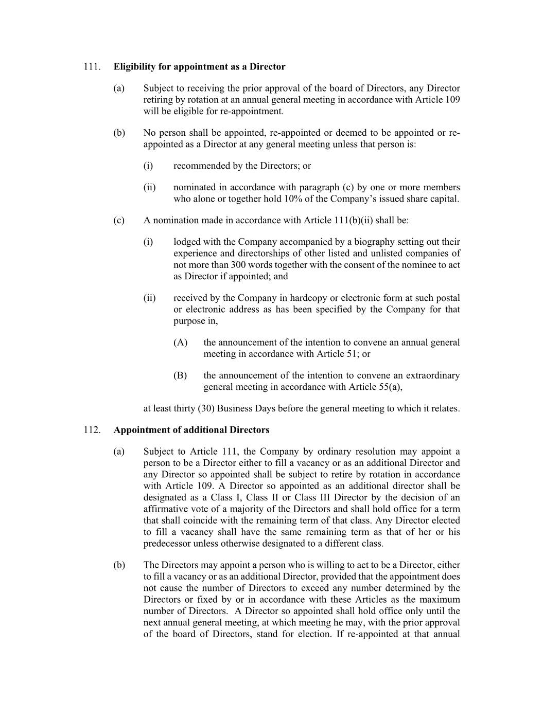 111. Eligibility for appointment as a Director (a) Subject to receiving the prior approval of the board of Directors, any Director retiring by rotation at an annual general meeting in accordance with Article 109 will be eligible for re-appointment. (b) No person shall be appointed, re-appointed or deemed to be appointed or re- appointed as a Director at any general meeting unless that person is: (i) recommended by the Directors; or (ii) nominated in accordance with paragraph (c) by one or more members who alone or together hold 10% of the Company’s issued share capital. (c) A nomination made in accordance with Article 111(b)(ii) shall be: (i) lodged with the Company accompanied by a biography setting out their experience and directorships of other listed and unlisted companies of not more than 300 words together with the consent of the nominee to act as Director if appointed; and (ii) received by the Company in hardcopy or electronic form at such postal or electronic address as has been specified by the Company for that purpose in, (A) the announcement of the intention to convene an annual general meeting in accordance with Article 51; or (B) the announcement of the intention to convene an extraordinary general meeting in accordance with Article 55(a), at least thirty (30) Business Days before the general meeting to which it relates. 112. Appointment of additional Directors (a) Subject to Article 111, the Company by ordinary resolution may appoint a person to be a Director either to fill a vacancy or as an additional Director and any Director so appointed shall be subject to retire by rotation in accordance with Article 109. A Director so appointed as an additional director shall be designated as a Class I, Class II or Class III Director by the decision of an affirmative vote of a majority of the Directors and shall hold office for a term that shall coincide with the remaining term of that class. Any Director elected to fill a vacancy shall have the same remaining term as that of her or his predecessor unless otherwise designated to a different class. (b) The Directors may appoint a person who is willing to act to be a Director, either to fill a vacancy or as an additional Director, provided that the appointment does not cause the number of Directors to exceed any number determined by the Directors or fixed by or in accordance with these Articles as the maximum number of Directors. A Director so appointed shall hold office only until the next annual general meeting, at which meeting he may, with the prior approval of the board of Directors, stand for election. If re-appointed at that annual