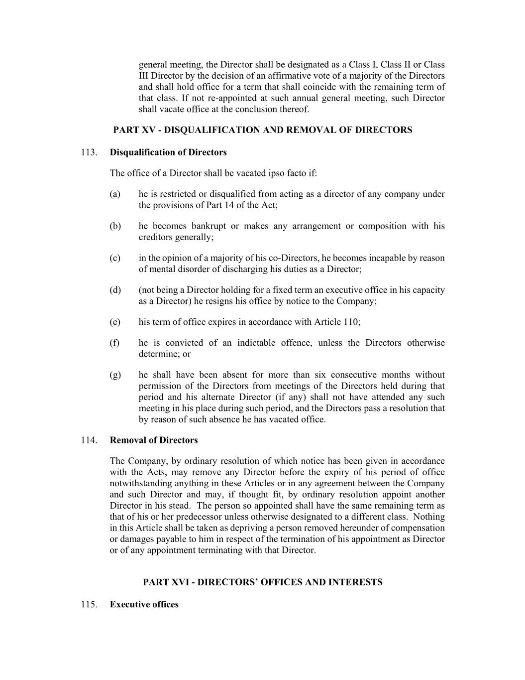 general meeting, the Director shall be designated as a Class I, Class II or Class III Director by the decision of an affirmative vote of a majority of the Directors and shall hold office for a term that shall coincide with the remaining term of that class. If not re-appointed at such annual general meeting, such Director shall vacate office at the conclusion thereof. PART XV - DISQUALIFICATION AND REMOVAL OF DIRECTORS 113. Disqualification of Directors The office of a Director shall be vacated ipso facto if: (a) he is restricted or disqualified from acting as a director of any company under the provisions of Part 14 of the Act; (b) he becomes bankrupt or makes any arrangement or composition with his creditors generally; (c) in the opinion of a majority of his co-Directors, he becomes incapable by reason of mental disorder of discharging his duties as a Director; (d) (not being a Director holding for a fixed term an executive office in his capacity as a Director) he resigns his office by notice to the Company; (e) his term of office expires in accordance with Article 110; (f) he is convicted of an indictable offence, unless the Directors otherwise determine; or (g) he shall have been absent for more than six consecutive months without permission of the Directors from meetings of the Directors held during that period and his alternate Director (if any) shall not have attended any such meeting in his place during such period, and the Directors pass a resolution that by reason of such absence he has vacated office. 114. Removal of Directors The Company, by ordinary resolution of which notice has been given in accordance with the Acts, may remove any Director before the expiry of his period of office notwithstanding anything in these Articles or in any agreement between the Company and such Director and may, if thought fit, by ordinary resolution appoint another Director in his stead. The person so appointed shall have the same remaining term as that of his or her predecessor unless otherwise designated to a different class. Nothing in this Article shall be taken as depriving a person removed hereunder of compensation or damages payable to him in respect of the termination of his appointment as Director or of any appointment terminating with that Director. PART XVI - DIRECTORS’ OFFICES AND INTERESTS 115. Executive offices