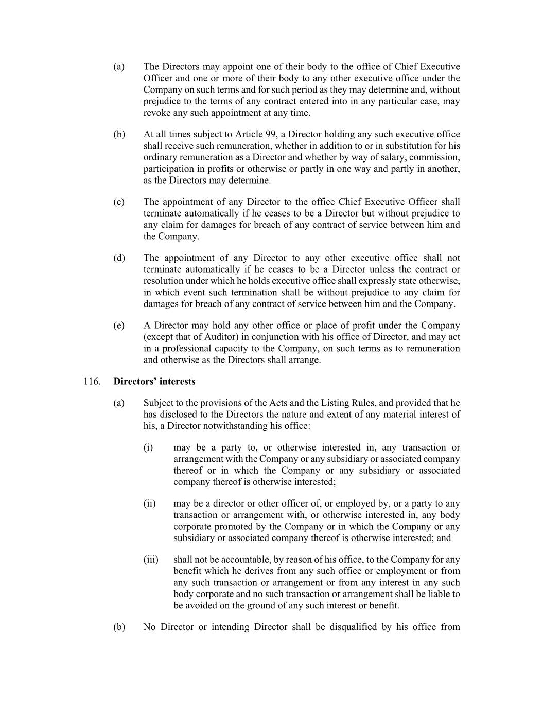 (a) The Directors may appoint one of their body to the office of Chief Executive Officer and one or more of their body to any other executive office under the Company on such terms and for such period as they may determine and, without prejudice to the terms of any contract entered into in any particular case, may revoke any such appointment at any time. (b) At all times subject to Article 99, a Director holding any such executive office shall receive such remuneration, whether in addition to or in substitution for his ordinary remuneration as a Director and whether by way of salary, commission, participation in profits or otherwise or partly in one way and partly in another, as the Directors may determine. (c) The appointment of any Director to the office Chief Executive Officer shall terminate automatically if he ceases to be a Director but without prejudice to any claim for damages for breach of any contract of service between him and the Company. (d) The appointment of any Director to any other executive office shall not terminate automatically if he ceases to be a Director unless the contract or resolution under which he holds executive office shall expressly state otherwise, in which event such termination shall be without prejudice to any claim for damages for breach of any contract of service between him and the Company. (e) A Director may hold any other office or place of profit under the Company (except that of Auditor) in conjunction with his office of Director, and may act in a professional capacity to the Company, on such terms as to remuneration and otherwise as the Directors shall arrange. 116. Directors’ interests (a) Subject to the provisions of the Acts and the Listing Rules, and provided that he has disclosed to the Directors the nature and extent of any material interest of his, a Director notwithstanding his office: (i) may be a party to, or otherwise interested in, any transaction or arrangement with the Company or any subsidiary or associated company thereof or in which the Company or any subsidiary or associated company thereof is otherwise interested; (ii) may be a director or other officer of, or employed by, or a party to any transaction or arrangement with, or otherwise interested in, any body corporate promoted by the Company or in which the Company or any subsidiary or associated company thereof is otherwise interested; and (iii) shall not be accountable, by reason of his office, to the Company for any benefit which he derives from any such office or employment or from any such transaction or arrangement or from any interest in any such body corporate and no such transaction or arrangement shall be liable to be avoided on the ground of any such interest or benefit. (b) No Director or intending Director shall be disqualified by his office from