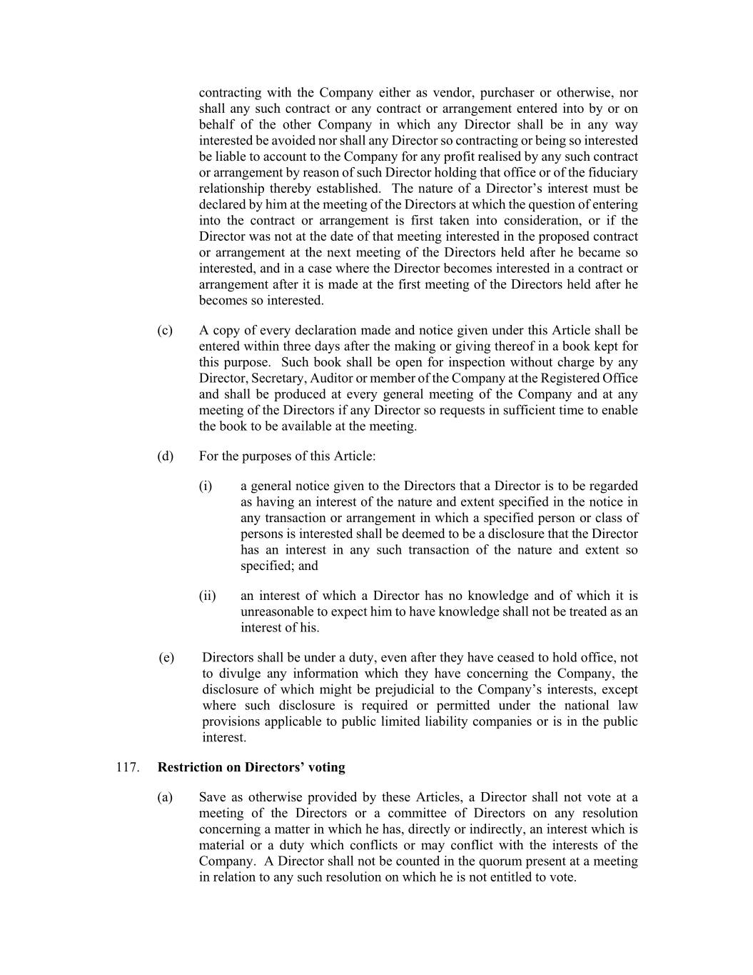 contracting with the Company either as vendor, purchaser or otherwise, nor shall any such contract or any contract or arrangement entered into by or on behalf of the other Company in which any Director shall be in any way interested be avoided nor shall any Director so contracting or being so interested be liable to account to the Company for any profit realised by any such contract or arrangement by reason of such Director holding that office or of the fiduciary relationship thereby established. The nature of a Director’s interest must be declared by him at the meeting of the Directors at which the question of entering into the contract or arrangement is first taken into consideration, or if the Director was not at the date of that meeting interested in the proposed contract or arrangement at the next meeting of the Directors held after he became so interested, and in a case where the Director becomes interested in a contract or arrangement after it is made at the first meeting of the Directors held after he becomes so interested. (c) A copy of every declaration made and notice given under this Article shall be entered within three days after the making or giving thereof in a book kept for this purpose. Such book shall be open for inspection without charge by any Director, Secretary, Auditor or member of the Company at the Registered Office and shall be produced at every general meeting of the Company and at any meeting of the Directors if any Director so requests in sufficient time to enable the book to be available at the meeting. (d) For the purposes of this Article: (i) a general notice given to the Directors that a Director is to be regarded as having an interest of the nature and extent specified in the notice in any transaction or arrangement in which a specified person or class of persons is interested shall be deemed to be a disclosure that the Director has an interest in any such transaction of the nature and extent so specified; and (ii) an interest of which a Director has no knowledge and of which it is unreasonable to expect him to have knowledge shall not be treated as an interest of his. (e) Directors shall be under a duty, even after they have ceased to hold office, not to divulge any information which they have concerning the Company, the disclosure of which might be prejudicial to the Company’s interests, except where such disclosure is required or permitted under the national law provisions applicable to public limited liability companies or is in the public interest. 117. Restriction on Directors’ voting (a) Save as otherwise provided by these Articles, a Director shall not vote at a meeting of the Directors or a committee of Directors on any resolution concerning a matter in which he has, directly or indirectly, an interest which is material or a duty which conflicts or may conflict with the interests of the Company. A Director shall not be counted in the quorum present at a meeting in relation to any such resolution on which he is not entitled to vote.