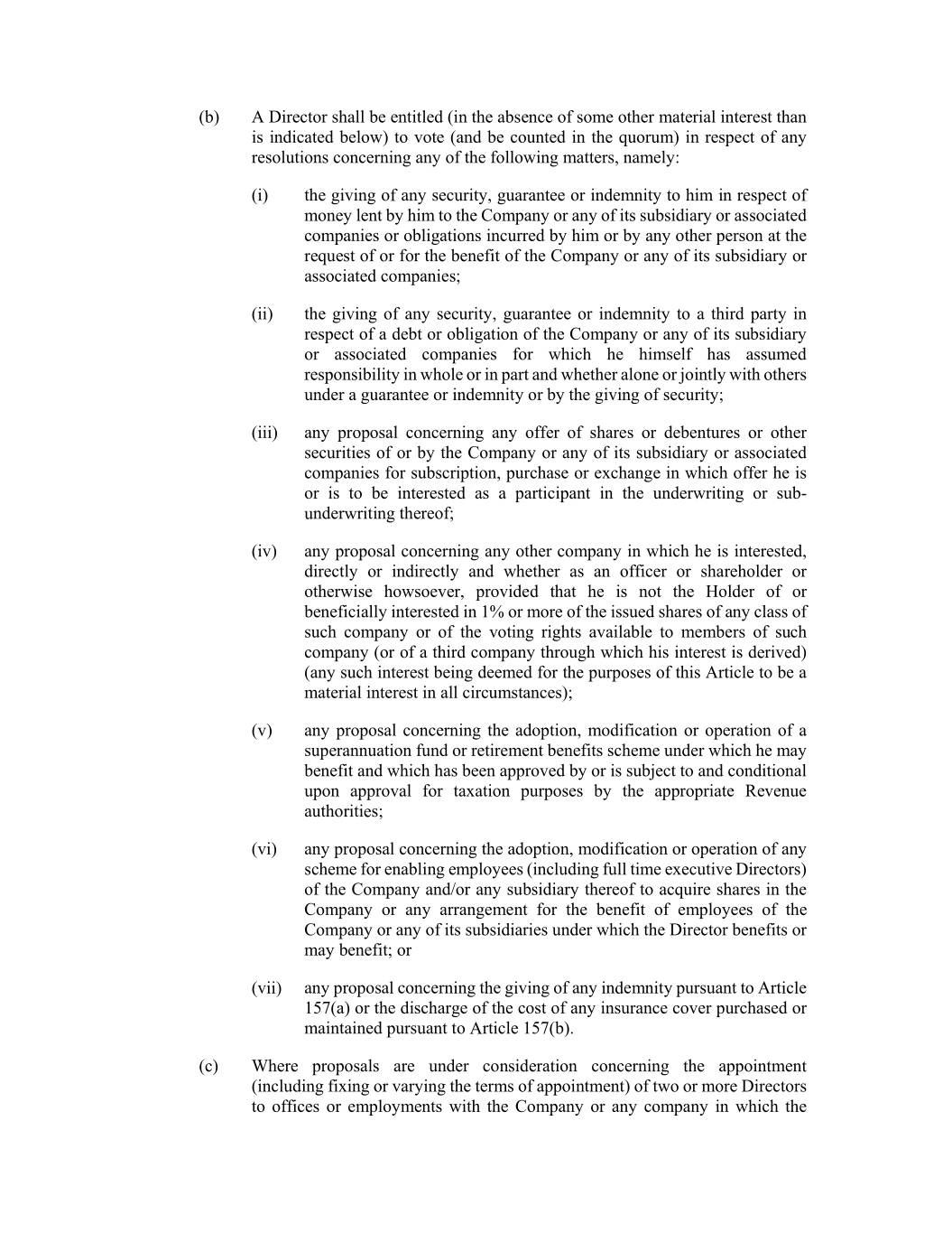 (b) A Director shall be entitled (in the absence of some other material interest than is indicated below) to vote (and be counted in the quorum) in respect of any resolutions concerning any of the following matters, namely: (i) the giving of any security, guarantee or indemnity to him in respect of money lent by him to the Company or any of its subsidiary or associated companies or obligations incurred by him or by any other person at the request of or for the benefit of the Company or any of its subsidiary or associated companies; (ii) the giving of any security, guarantee or indemnity to a third party in respect of a debt or obligation of the Company or any of its subsidiary or associated companies for which he himself has assumed responsibility in whole or in part and whether alone or jointly with others under a guarantee or indemnity or by the giving of security; (iii) any proposal concerning any offer of shares or debentures or other securities of or by the Company or any of its subsidiary or associated companies for subscription, purchase or exchange in which offer he is or is to be interested as a participant in the underwriting or sub- underwriting thereof; (iv) any proposal concerning any other company in which he is interested, directly or indirectly and whether as an officer or shareholder or otherwise howsoever, provided that he is not the Holder of or beneficially interested in 1% or more of the issued shares of any class of such company or of the voting rights available to members of such company (or of a third company through which his interest is derived) (any such interest being deemed for the purposes of this Article to be a material interest in all circumstances); (v) any proposal concerning the adoption, modification or operation of a superannuation fund or retirement benefits scheme under which he may benefit and which has been approved by or is subject to and conditional upon approval for taxation purposes by the appropriate Revenue authorities; (vi) any proposal concerning the adoption, modification or operation of any scheme for enabling employees (including full time executive Directors) of the Company and/or any subsidiary thereof to acquire shares in the Company or any arrangement for the benefit of employees of the Company or any of its subsidiaries under which the Director benefits or may benefit; or (vii) any proposal concerning the giving of any indemnity pursuant to Article 157(a) or the discharge of the cost of any insurance cover purchased or maintained pursuant to Article 157(b). (c) Where proposals are under consideration concerning the appointment (including fixing or varying the terms of appointment) of two or more Directors to offices or employments with the Company or any company in which the