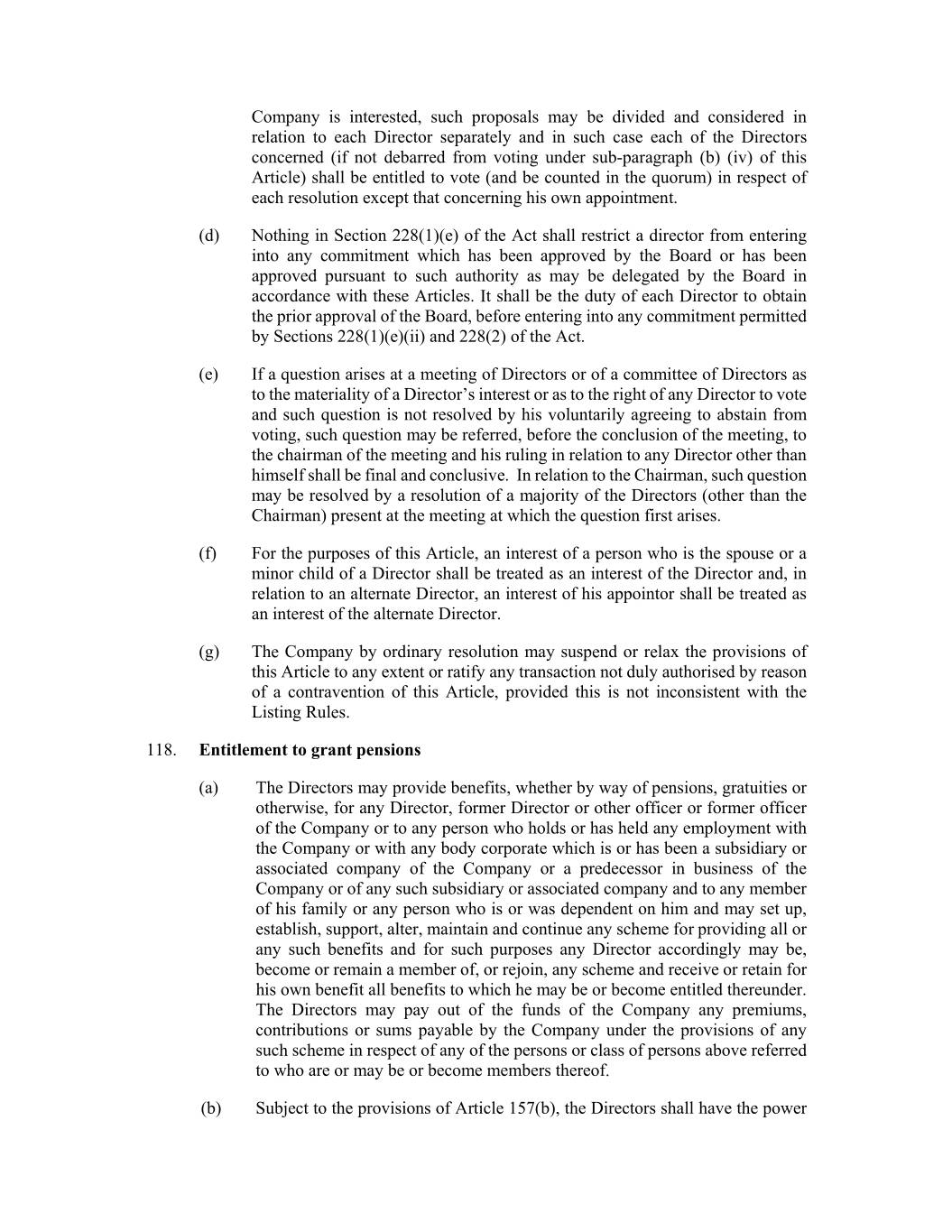 Company is interested, such proposals may be divided and considered in relation to each Director separately and in such case each of the Directors concerned (if not debarred from voting under sub-paragraph (b) (iv) of this Article) shall be entitled to vote (and be counted in the quorum) in respect of each resolution except that concerning his own appointment. (d) Nothing in Section 228(1)(e) of the Act shall restrict a director from entering into any commitment which has been approved by the Board or has been approved pursuant to such authority as may be delegated by the Board in accordance with these Articles. It shall be the duty of each Director to obtain the prior approval of the Board, before entering into any commitment permitted by Sections 228(1)(e)(ii) and 228(2) of the Act. (e) If a question arises at a meeting of Directors or of a committee of Directors as to the materiality of a Director’s interest or as to the right of any Director to vote and such question is not resolved by his voluntarily agreeing to abstain from voting, such question may be referred, before the conclusion of the meeting, to the chairman of the meeting and his ruling in relation to any Director other than himself shall be final and conclusive. In relation to the Chairman, such question may be resolved by a resolution of a majority of the Directors (other than the Chairman) present at the meeting at which the question first arises. (f) For the purposes of this Article, an interest of a person who is the spouse or a minor child of a Director shall be treated as an interest of the Director and, in relation to an alternate Director, an interest of his appointor shall be treated as an interest of the alternate Director. (g) The Company by ordinary resolution may suspend or relax the provisions of this Article to any extent or ratify any transaction not duly authorised by reason of a contravention of this Article, provided this is not inconsistent with the Listing Rules. 118. Entitlement to grant pensions (a) The Directors may provide benefits, whether by way of pensions, gratuities or otherwise, for any Director, former Director or other officer or former officer of the Company or to any person who holds or has held any employment with the Company or with any body corporate which is or has been a subsidiary or associated company of the Company or a predecessor in business of the Company or of any such subsidiary or associated company and to any member of his family or any person who is or was dependent on him and may set up, establish, support, alter, maintain and continue any scheme for providing all or any such benefits and for such purposes any Director accordingly may be, become or remain a member of, or rejoin, any scheme and receive or retain for his own benefit all benefits to which he may be or become entitled thereunder. The Directors may pay out of the funds of the Company any premiums, contributions or sums payable by the Company under the provisions of any such scheme in respect of any of the persons or class of persons above referred to who are or may be or become members thereof. (b) Subject to the provisions of Article 157(b), the Directors shall have the power