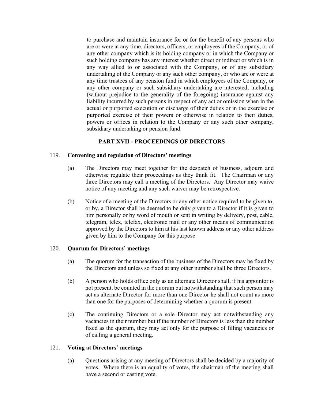 to purchase and maintain insurance for or for the benefit of any persons who are or were at any time, directors, officers, or employees of the Company, or of any other company which is its holding company or in which the Company or such holding company has any interest whether direct or indirect or which is in any way allied to or associated with the Company, or of any subsidiary undertaking of the Company or any such other company, or who are or were at any time trustees of any pension fund in which employees of the Company, or any other company or such subsidiary undertaking are interested, including (without prejudice to the generality of the foregoing) insurance against any liability incurred by such persons in respect of any act or omission when in the actual or purported execution or discharge of their duties or in the exercise or purported exercise of their powers or otherwise in relation to their duties, powers or offices in relation to the Company or any such other company, subsidiary undertaking or pension fund. PART XVII - PROCEEDINGS OF DIRECTORS 119. Convening and regulation of Directors’ meetings (a) The Directors may meet together for the despatch of business, adjourn and otherwise regulate their proceedings as they think fit. The Chairman or any three Directors may call a meeting of the Directors. Any Director may waive notice of any meeting and any such waiver may be retrospective. (b) Notice of a meeting of the Directors or any other notice required to be given to, or by, a Director shall be deemed to be duly given to a Director if it is given to him personally or by word of mouth or sent in writing by delivery, post, cable, telegram, telex, telefax, electronic mail or any other means of communication approved by the Directors to him at his last known address or any other address given by him to the Company for this purpose. 120. Quorum for Directors’ meetings (a) The quorum for the transaction of the business of the Directors may be fixed by the Directors and unless so fixed at any other number shall be three Directors. (b) A person who holds office only as an alternate Director shall, if his appointor is not present, be counted in the quorum but notwithstanding that such person may act as alternate Director for more than one Director he shall not count as more than one for the purposes of determining whether a quorum is present. (c) The continuing Directors or a sole Director may act notwithstanding any vacancies in their number but if the number of Directors is less than the number fixed as the quorum, they may act only for the purpose of filling vacancies or of calling a general meeting. 121. Voting at Directors’ meetings (a) Questions arising at any meeting of Directors shall be decided by a majority of votes. Where there is an equality of votes, the chairman of the meeting shall have a second or casting vote.