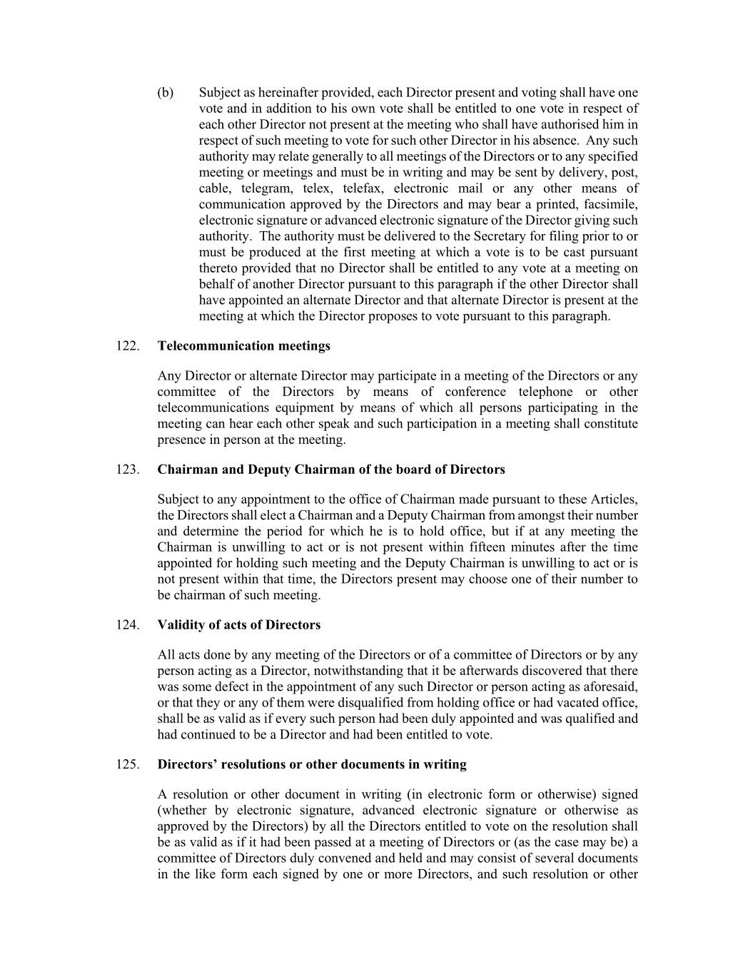 (b) Subject as hereinafter provided, each Director present and voting shall have one vote and in addition to his own vote shall be entitled to one vote in respect of each other Director not present at the meeting who shall have authorised him in respect of such meeting to vote for such other Director in his absence. Any such authority may relate generally to all meetings of the Directors or to any specified meeting or meetings and must be in writing and may be sent by delivery, post, cable, telegram, telex, telefax, electronic mail or any other means of communication approved by the Directors and may bear a printed, facsimile, electronic signature or advanced electronic signature of the Director giving such authority. The authority must be delivered to the Secretary for filing prior to or must be produced at the first meeting at which a vote is to be cast pursuant thereto provided that no Director shall be entitled to any vote at a meeting on behalf of another Director pursuant to this paragraph if the other Director shall have appointed an alternate Director and that alternate Director is present at the meeting at which the Director proposes to vote pursuant to this paragraph. 122. Telecommunication meetings Any Director or alternate Director may participate in a meeting of the Directors or any committee of the Directors by means of conference telephone or other telecommunications equipment by means of which all persons participating in the meeting can hear each other speak and such participation in a meeting shall constitute presence in person at the meeting. 123. Chairman and Deputy Chairman of the board of Directors Subject to any appointment to the office of Chairman made pursuant to these Articles, the Directors shall elect a Chairman and a Deputy Chairman from amongst their number and determine the period for which he is to hold office, but if at any meeting the Chairman is unwilling to act or is not present within fifteen minutes after the time appointed for holding such meeting and the Deputy Chairman is unwilling to act or is not present within that time, the Directors present may choose one of their number to be chairman of such meeting. 124. Validity of acts of Directors All acts done by any meeting of the Directors or of a committee of Directors or by any person acting as a Director, notwithstanding that it be afterwards discovered that there was some defect in the appointment of any such Director or person acting as aforesaid, or that they or any of them were disqualified from holding office or had vacated office, shall be as valid as if every such person had been duly appointed and was qualified and had continued to be a Director and had been entitled to vote. 125. Directors’ resolutions or other documents in writing A resolution or other document in writing (in electronic form or otherwise) signed (whether by electronic signature, advanced electronic signature or otherwise as approved by the Directors) by all the Directors entitled to vote on the resolution shall be as valid as if it had been passed at a meeting of Directors or (as the case may be) a committee of Directors duly convened and held and may consist of several documents in the like form each signed by one or more Directors, and such resolution or other