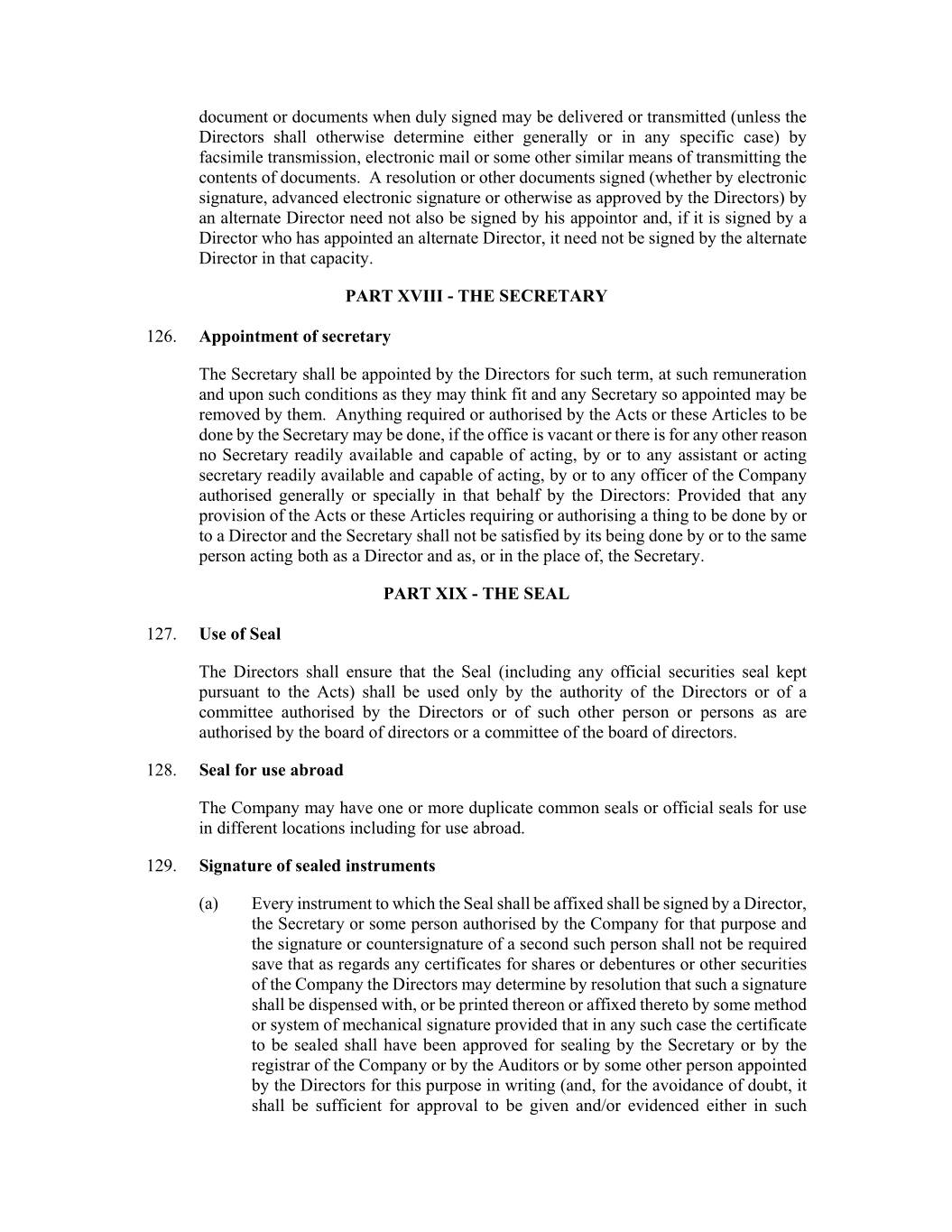 document or documents when duly signed may be delivered or transmitted (unless the Directors shall otherwise determine either generally or in any specific case) by facsimile transmission, electronic mail or some other similar means of transmitting the contents of documents. A resolution or other documents signed (whether by electronic signature, advanced electronic signature or otherwise as approved by the Directors) by an alternate Director need not also be signed by his appointor and, if it is signed by a Director who has appointed an alternate Director, it need not be signed by the alternate Director in that capacity. PART XVIII - THE SECRETARY 126. Appointment of secretary The Secretary shall be appointed by the Directors for such term, at such remuneration and upon such conditions as they may think fit and any Secretary so appointed may be removed by them. Anything required or authorised by the Acts or these Articles to be done by the Secretary may be done, if the office is vacant or there is for any other reason no Secretary readily available and capable of acting, by or to any assistant or acting secretary readily available and capable of acting, by or to any officer of the Company authorised generally or specially in that behalf by the Directors: Provided that any provision of the Acts or these Articles requiring or authorising a thing to be done by or to a Director and the Secretary shall not be satisfied by its being done by or to the same person acting both as a Director and as, or in the place of, the Secretary. PART XIX - THE SEAL 127. Use of Seal The Directors shall ensure that the Seal (including any official securities seal kept pursuant to the Acts) shall be used only by the authority of the Directors or of a committee authorised by the Directors or of such other person or persons as are authorised by the board of directors or a committee of the board of directors. 128. Seal for use abroad The Company may have one or more duplicate common seals or official seals for use in different locations including for use abroad. 129. Signature of sealed instruments (a) Every instrument to which the Seal shall be affixed shall be signed by a Director, the Secretary or some person authorised by the Company for that purpose and the signature or countersignature of a second such person shall not be required save that as regards any certificates for shares or debentures or other securities of the Company the Directors may determine by resolution that such a signature shall be dispensed with, or be printed thereon or affixed thereto by some method or system of mechanical signature provided that in any such case the certificate to be sealed shall have been approved for sealing by the Secretary or by the registrar of the Company or by the Auditors or by some other person appointed by the Directors for this purpose in writing (and, for the avoidance of doubt, it shall be sufficient for approval to be given and/or evidenced either in such