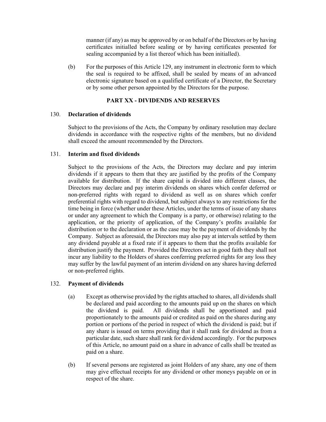 manner (if any) as may be approved by or on behalf of the Directors or by having certificates initialled before sealing or by having certificates presented for sealing accompanied by a list thereof which has been initialled). (b) For the purposes of this Article 129, any instrument in electronic form to which the seal is required to be affixed, shall be sealed by means of an advanced electronic signature based on a qualified certificate of a Director, the Secretary or by some other person appointed by the Directors for the purpose. PART XX - DIVIDENDS AND RESERVES 130. Declaration of dividends Subject to the provisions of the Acts, the Company by ordinary resolution may declare dividends in accordance with the respective rights of the members, but no dividend shall exceed the amount recommended by the Directors. 131. Interim and fixed dividends Subject to the provisions of the Acts, the Directors may declare and pay interim dividends if it appears to them that they are justified by the profits of the Company available for distribution. If the share capital is divided into different classes, the Directors may declare and pay interim dividends on shares which confer deferred or non-preferred rights with regard to dividend as well as on shares which confer preferential rights with regard to dividend, but subject always to any restrictions for the time being in force (whether under these Articles, under the terms of issue of any shares or under any agreement to which the Company is a party, or otherwise) relating to the application, or the priority of application, of the Company’s profits available for distribution or to the declaration or as the case may be the payment of dividends by the Company. Subject as aforesaid, the Directors may also pay at intervals settled by them any dividend payable at a fixed rate if it appears to them that the profits available for distribution justify the payment. Provided the Directors act in good faith they shall not incur any liability to the Holders of shares conferring preferred rights for any loss they may suffer by the lawful payment of an interim dividend on any shares having deferred or non-preferred rights. 132. Payment of dividends (a) Except as otherwise provided by the rights attached to shares, all dividends shall be declared and paid according to the amounts paid up on the shares on which the dividend is paid. All dividends shall be apportioned and paid proportionately to the amounts paid or credited as paid on the shares during any portion or portions of the period in respect of which the dividend is paid; but if any share is issued on terms providing that it shall rank for dividend as from a particular date, such share shall rank for dividend accordingly. For the purposes of this Article, no amount paid on a share in advance of calls shall be treated as paid on a share. (b) If several persons are registered as joint Holders of any share, any one of them may give effectual receipts for any dividend or other moneys payable on or in respect of the share.