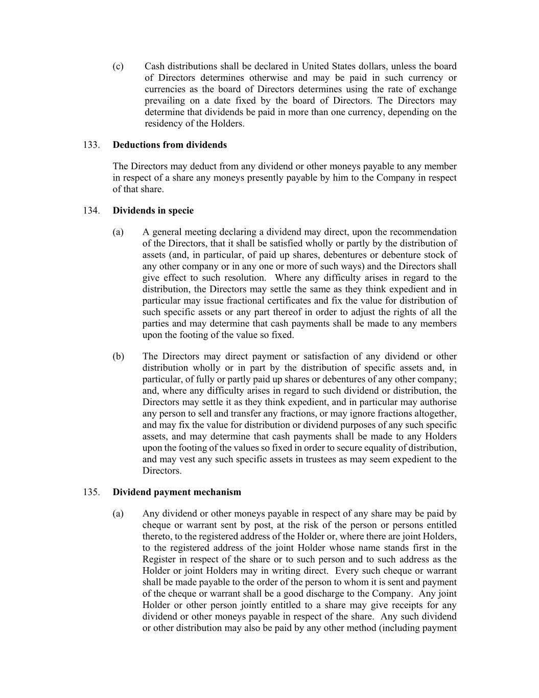 (c) Cash distributions shall be declared in United States dollars, unless the board of Directors determines otherwise and may be paid in such currency or currencies as the board of Directors determines using the rate of exchange prevailing on a date fixed by the board of Directors. The Directors may determine that dividends be paid in more than one currency, depending on the residency of the Holders. 133. Deductions from dividends The Directors may deduct from any dividend or other moneys payable to any member in respect of a share any moneys presently payable by him to the Company in respect of that share. 134. Dividends in specie (a) A general meeting declaring a dividend may direct, upon the recommendation of the Directors, that it shall be satisfied wholly or partly by the distribution of assets (and, in particular, of paid up shares, debentures or debenture stock of any other company or in any one or more of such ways) and the Directors shall give effect to such resolution. Where any difficulty arises in regard to the distribution, the Directors may settle the same as they think expedient and in particular may issue fractional certificates and fix the value for distribution of such specific assets or any part thereof in order to adjust the rights of all the parties and may determine that cash payments shall be made to any members upon the footing of the value so fixed. (b) The Directors may direct payment or satisfaction of any dividend or other distribution wholly or in part by the distribution of specific assets and, in particular, of fully or partly paid up shares or debentures of any other company; and, where any difficulty arises in regard to such dividend or distribution, the Directors may settle it as they think expedient, and in particular may authorise any person to sell and transfer any fractions, or may ignore fractions altogether, and may fix the value for distribution or dividend purposes of any such specific assets, and may determine that cash payments shall be made to any Holders upon the footing of the values so fixed in order to secure equality of distribution, and may vest any such specific assets in trustees as may seem expedient to the Directors. 135. Dividend payment mechanism (a) Any dividend or other moneys payable in respect of any share may be paid by cheque or warrant sent by post, at the risk of the person or persons entitled thereto, to the registered address of the Holder or, where there are joint Holders, to the registered address of the joint Holder whose name stands first in the Register in respect of the share or to such person and to such address as the Holder or joint Holders may in writing direct. Every such cheque or warrant shall be made payable to the order of the person to whom it is sent and payment of the cheque or warrant shall be a good discharge to the Company. Any joint Holder or other person jointly entitled to a share may give receipts for any dividend or other moneys payable in respect of the share. Any such dividend or other distribution may also be paid by any other method (including payment