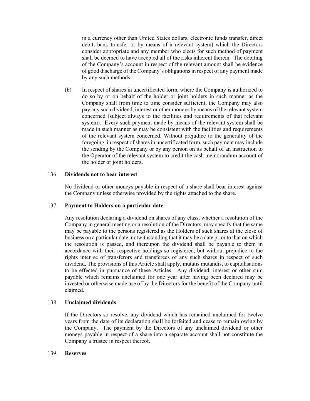 in a currency other than United States dollars, electronic funds transfer, direct debit, bank transfer or by means of a relevant system) which the Directors consider appropriate and any member who elects for such method of payment shall be deemed to have accepted all of the risks inherent therein. The debiting of the Company’s account in respect of the relevant amount shall be evidence of good discharge of the Company’s obligations in respect of any payment made by any such methods. (b) In respect of shares in uncertificated form, where the Company is authorized to do so by or on behalf of the holder or joint holders in such manner as the Company shall from time to time consider sufficient, the Company may also pay any such dividend, interest or other moneys by means of the relevant system concerned (subject always to the facilities and requirements of that relevant system). Every such payment made by means of the relevant system shall be made in such manner as may be consistent with the facilities and requirements of the relevant system concerned. Without prejudice to the generality of the foregoing, in respect of shares in uncertificated form, such payment may include the sending by the Company or by any person on its behalf of an instruction to the Operator of the relevant system to credit the cash memorandum account of the holder or joint holders. 136. Dividends not to bear interest No dividend or other moneys payable in respect of a share shall bear interest against the Company unless otherwise provided by the rights attached to the share. 137. Payment to Holders on a particular date Any resolution declaring a dividend on shares of any class, whether a resolution of the Company in general meeting or a resolution of the Directors, may specify that the same may be payable to the persons registered as the Holders of such shares at the close of business on a particular date, notwithstanding that it may be a date prior to that on which the resolution is passed, and thereupon the dividend shall be payable to them in accordance with their respective holdings so registered, but without prejudice to the rights inter se of transferors and transferees of any such shares in respect of such dividend. The provisions of this Article shall apply, mutatis mutandis, to capitalisations to be effected in pursuance of these Articles. Any dividend, interest or other sum payable which remains unclaimed for one year after having been declared may be invested or otherwise made use of by the Directors for the benefit of the Company until claimed. 138. Unclaimed dividends If the Directors so resolve, any dividend which has remained unclaimed for twelve years from the date of its declaration shall be forfeited and cease to remain owing by the Company. The payment by the Directors of any unclaimed dividend or other moneys payable in respect of a share into a separate account shall not constitute the Company a trustee in respect thereof. 139. Reserves