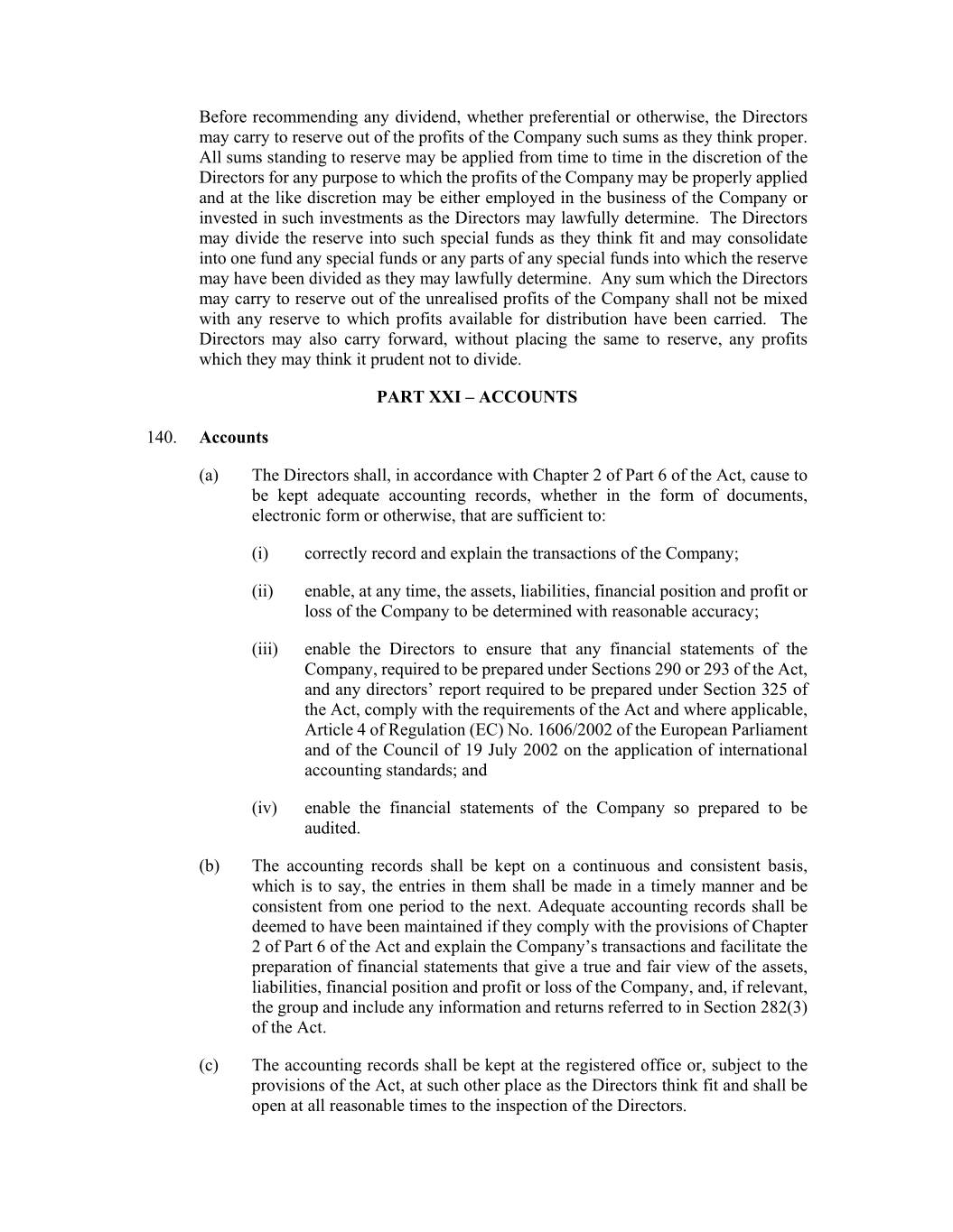 Before recommending any dividend, whether preferential or otherwise, the Directors may carry to reserve out of the profits of the Company such sums as they think proper. All sums standing to reserve may be applied from time to time in the discretion of the Directors for any purpose to which the profits of the Company may be properly applied and at the like discretion may be either employed in the business of the Company or invested in such investments as the Directors may lawfully determine. The Directors may divide the reserve into such special funds as they think fit and may consolidate into one fund any special funds or any parts of any special funds into which the reserve may have been divided as they may lawfully determine. Any sum which the Directors may carry to reserve out of the unrealised profits of the Company shall not be mixed with any reserve to which profits available for distribution have been carried. The Directors may also carry forward, without placing the same to reserve, any profits which they may think it prudent not to divide. PART XXI – ACCOUNTS 140. Accounts (a) The Directors shall, in accordance with Chapter 2 of Part 6 of the Act, cause to be kept adequate accounting records, whether in the form of documents, electronic form or otherwise, that are sufficient to: (i) correctly record and explain the transactions of the Company; (ii) enable, at any time, the assets, liabilities, financial position and profit or loss of the Company to be determined with reasonable accuracy; (iii) enable the Directors to ensure that any financial statements of the Company, required to be prepared under Sections 290 or 293 of the Act, and any directors’ report required to be prepared under Section 325 of the Act, comply with the requirements of the Act and where applicable, Article 4 of Regulation (EC) No. 1606/2002 of the European Parliament and of the Council of 19 July 2002 on the application of international accounting standards; and (iv) enable the financial statements of the Company so prepared to be audited. (b) The accounting records shall be kept on a continuous and consistent basis, which is to say, the entries in them shall be made in a timely manner and be consistent from one period to the next. Adequate accounting records shall be deemed to have been maintained if they comply with the provisions of Chapter 2 of Part 6 of the Act and explain the Company’s transactions and facilitate the preparation of financial statements that give a true and fair view of the assets, liabilities, financial position and profit or loss of the Company, and, if relevant, the group and include any information and returns referred to in Section 282(3) of the Act. (c) The accounting records shall be kept at the registered office or, subject to the provisions of the Act, at such other place as the Directors think fit and shall be open at all reasonable times to the inspection of the Directors.