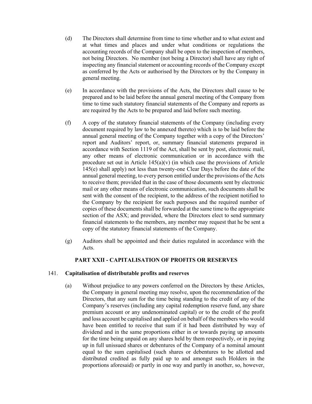(d) The Directors shall determine from time to time whether and to what extent and at what times and places and under what conditions or regulations the accounting records of the Company shall be open to the inspection of members, not being Directors. No member (not being a Director) shall have any right of inspecting any financial statement or accounting records of the Company except as conferred by the Acts or authorised by the Directors or by the Company in general meeting. (e) In accordance with the provisions of the Acts, the Directors shall cause to be prepared and to be laid before the annual general meeting of the Company from time to time such statutory financial statements of the Company and reports as are required by the Acts to be prepared and laid before such meeting. (f) A copy of the statutory financial statements of the Company (including every document required by law to be annexed thereto) which is to be laid before the annual general meeting of the Company together with a copy of the Directors’ report and Auditors’ report, or, summary financial statements prepared in accordance with Section 1119 of the Act, shall be sent by post, electronic mail, any other means of electronic communication or in accordance with the procedure set out in Article 145(a)(v) (in which case the provisions of Article 145(e) shall apply) not less than twenty-one Clear Days before the date of the annual general meeting, to every person entitled under the provisions of the Acts to receive them; provided that in the case of those documents sent by electronic mail or any other means of electronic communication, such documents shall be sent with the consent of the recipient, to the address of the recipient notified to the Company by the recipient for such purposes and the required number of copies of these documents shall be forwarded at the same time to the appropriate section of the ASX; and provided, where the Directors elect to send summary financial statements to the members, any member may request that he be sent a copy of the statutory financial statements of the Company. (g) Auditors shall be appointed and their duties regulated in accordance with the Acts. PART XXII - CAPITALISATION OF PROFITS OR RESERVES 141. Capitalisation of distributable profits and reserves (a) Without prejudice to any powers conferred on the Directors by these Articles, the Company in general meeting may resolve, upon the recommendation of the Directors, that any sum for the time being standing to the credit of any of the Company’s reserves (including any capital redemption reserve fund, any share premium account or any undenominated capital) or to the credit of the profit and loss account be capitalised and applied on behalf of the members who would have been entitled to receive that sum if it had been distributed by way of dividend and in the same proportions either in or towards paying up amounts for the time being unpaid on any shares held by them respectively, or in paying up in full unissued shares or debentures of the Company of a nominal amount equal to the sum capitalised (such shares or debentures to be allotted and distributed credited as fully paid up to and amongst such Holders in the proportions aforesaid) or partly in one way and partly in another, so, however,