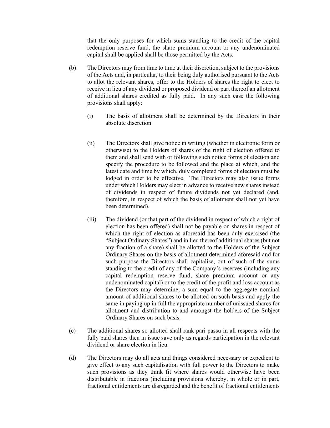 that the only purposes for which sums standing to the credit of the capital redemption reserve fund, the share premium account or any undenominated capital shall be applied shall be those permitted by the Acts. (b) The Directors may from time to time at their discretion, subject to the provisions of the Acts and, in particular, to their being duly authorised pursuant to the Acts to allot the relevant shares, offer to the Holders of shares the right to elect to receive in lieu of any dividend or proposed dividend or part thereof an allotment of additional shares credited as fully paid. In any such case the following provisions shall apply: (i) The basis of allotment shall be determined by the Directors in their absolute discretion. (ii) The Directors shall give notice in writing (whether in electronic form or otherwise) to the Holders of shares of the right of election offered to them and shall send with or following such notice forms of election and specify the procedure to be followed and the place at which, and the latest date and time by which, duly completed forms of election must be lodged in order to be effective. The Directors may also issue forms under which Holders may elect in advance to receive new shares instead of dividends in respect of future dividends not yet declared (and, therefore, in respect of which the basis of allotment shall not yet have been determined). (iii) The dividend (or that part of the dividend in respect of which a right of election has been offered) shall not be payable on shares in respect of which the right of election as aforesaid has been duly exercised (the “Subject Ordinary Shares”) and in lieu thereof additional shares (but not any fraction of a share) shall be allotted to the Holders of the Subject Ordinary Shares on the basis of allotment determined aforesaid and for such purpose the Directors shall capitalise, out of such of the sums standing to the credit of any of the Company’s reserves (including any capital redemption reserve fund, share premium account or any undenominated capital) or to the credit of the profit and loss account as the Directors may determine, a sum equal to the aggregate nominal amount of additional shares to be allotted on such basis and apply the same in paying up in full the appropriate number of unissued shares for allotment and distribution to and amongst the holders of the Subject Ordinary Shares on such basis. (c) The additional shares so allotted shall rank pari passu in all respects with the fully paid shares then in issue save only as regards participation in the relevant dividend or share election in lieu. (d) The Directors may do all acts and things considered necessary or expedient to give effect to any such capitalisation with full power to the Directors to make such provisions as they think fit where shares would otherwise have been distributable in fractions (including provisions whereby, in whole or in part, fractional entitlements are disregarded and the benefit of fractional entitlements