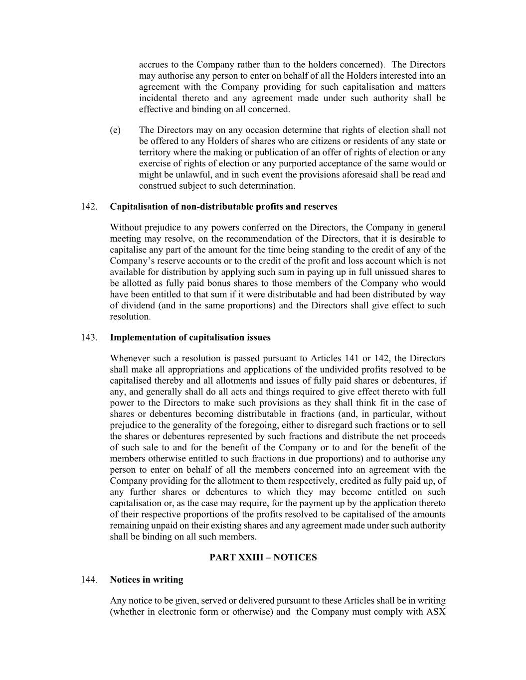 accrues to the Company rather than to the holders concerned). The Directors may authorise any person to enter on behalf of all the Holders interested into an agreement with the Company providing for such capitalisation and matters incidental thereto and any agreement made under such authority shall be effective and binding on all concerned. (e) The Directors may on any occasion determine that rights of election shall not be offered to any Holders of shares who are citizens or residents of any state or territory where the making or publication of an offer of rights of election or any exercise of rights of election or any purported acceptance of the same would or might be unlawful, and in such event the provisions aforesaid shall be read and construed subject to such determination. 142. Capitalisation of non-distributable profits and reserves Without prejudice to any powers conferred on the Directors, the Company in general meeting may resolve, on the recommendation of the Directors, that it is desirable to capitalise any part of the amount for the time being standing to the credit of any of the Company’s reserve accounts or to the credit of the profit and loss account which is not available for distribution by applying such sum in paying up in full unissued shares to be allotted as fully paid bonus shares to those members of the Company who would have been entitled to that sum if it were distributable and had been distributed by way of dividend (and in the same proportions) and the Directors shall give effect to such resolution. 143. Implementation of capitalisation issues Whenever such a resolution is passed pursuant to Articles 141 or 142, the Directors shall make all appropriations and applications of the undivided profits resolved to be capitalised thereby and all allotments and issues of fully paid shares or debentures, if any, and generally shall do all acts and things required to give effect thereto with full power to the Directors to make such provisions as they shall think fit in the case of shares or debentures becoming distributable in fractions (and, in particular, without prejudice to the generality of the foregoing, either to disregard such fractions or to sell the shares or debentures represented by such fractions and distribute the net proceeds of such sale to and for the benefit of the Company or to and for the benefit of the members otherwise entitled to such fractions in due proportions) and to authorise any person to enter on behalf of all the members concerned into an agreement with the Company providing for the allotment to them respectively, credited as fully paid up, of any further shares or debentures to which they may become entitled on such capitalisation or, as the case may require, for the payment up by the application thereto of their respective proportions of the profits resolved to be capitalised of the amounts remaining unpaid on their existing shares and any agreement made under such authority shall be binding on all such members. PART XXIII – NOTICES 144. Notices in writing Any notice to be given, served or delivered pursuant to these Articles shall be in writing (whether in electronic form or otherwise) and the Company must comply with ASX