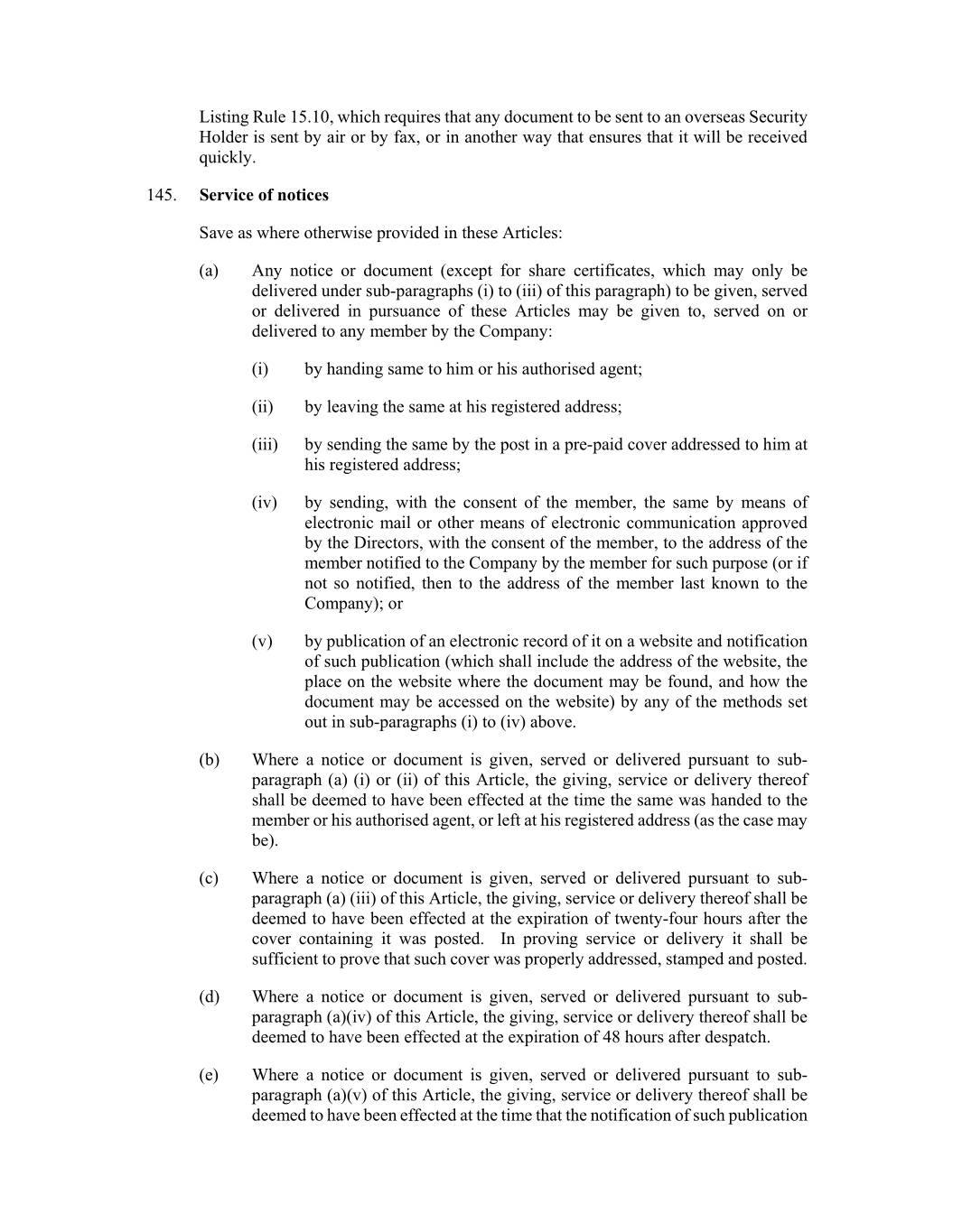 Listing Rule 15.10, which requires that any document to be sent to an overseas Security Holder is sent by air or by fax, or in another way that ensures that it will be received quickly. 145. Service of notices Save as where otherwise provided in these Articles: (a) Any notice or document (except for share certificates, which may only be delivered under sub-paragraphs (i) to (iii) of this paragraph) to be given, served or delivered in pursuance of these Articles may be given to, served on or delivered to any member by the Company: (i) by handing same to him or his authorised agent; (ii) by leaving the same at his registered address; (iii) by sending the same by the post in a pre-paid cover addressed to him at his registered address; (iv) by sending, with the consent of the member, the same by means of electronic mail or other means of electronic communication approved by the Directors, with the consent of the member, to the address of the member notified to the Company by the member for such purpose (or if not so notified, then to the address of the member last known to the Company); or (v) by publication of an electronic record of it on a website and notification of such publication (which shall include the address of the website, the place on the website where the document may be found, and how the document may be accessed on the website) by any of the methods set out in sub-paragraphs (i) to (iv) above. (b) Where a notice or document is given, served or delivered pursuant to sub- paragraph (a) (i) or (ii) of this Article, the giving, service or delivery thereof shall be deemed to have been effected at the time the same was handed to the member or his authorised agent, or left at his registered address (as the case may be). (c) Where a notice or document is given, served or delivered pursuant to sub- paragraph (a) (iii) of this Article, the giving, service or delivery thereof shall be deemed to have been effected at the expiration of twenty-four hours after the cover containing it was posted. In proving service or delivery it shall be sufficient to prove that such cover was properly addressed, stamped and posted. (d) Where a notice or document is given, served or delivered pursuant to sub- paragraph (a)(iv) of this Article, the giving, service or delivery thereof shall be deemed to have been effected at the expiration of 48 hours after despatch. (e) Where a notice or document is given, served or delivered pursuant to sub- paragraph (a)(v) of this Article, the giving, service or delivery thereof shall be deemed to have been effected at the time that the notification of such publication