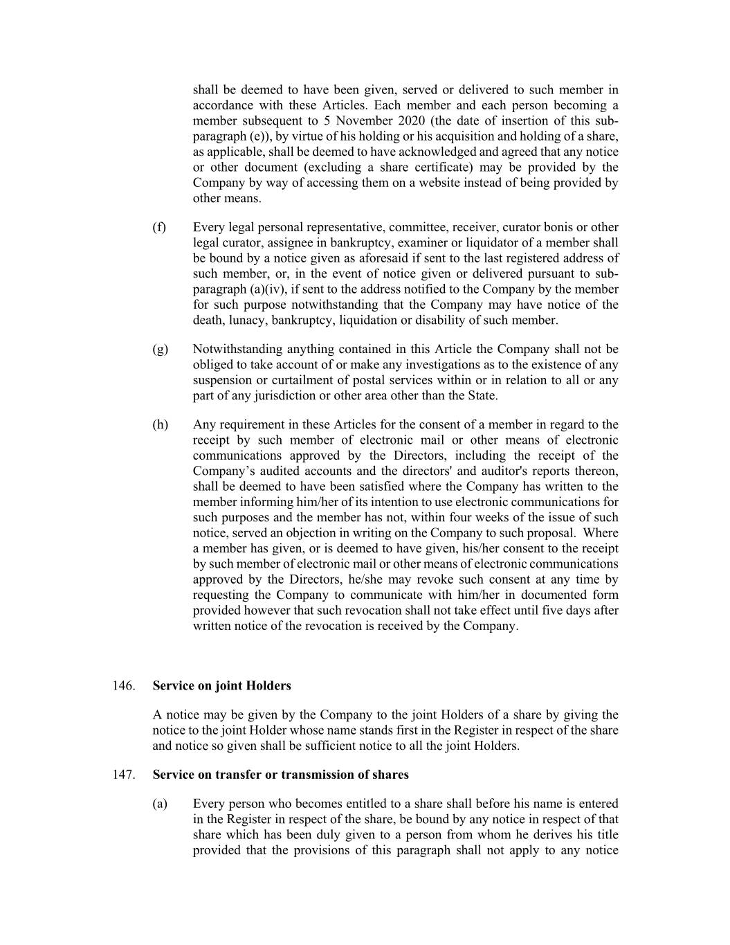 shall be deemed to have been given, served or delivered to such member in accordance with these Articles. Each member and each person becoming a member subsequent to 5 November 2020 (the date of insertion of this sub- paragraph (e)), by virtue of his holding or his acquisition and holding of a share, as applicable, shall be deemed to have acknowledged and agreed that any notice or other document (excluding a share certificate) may be provided by the Company by way of accessing them on a website instead of being provided by other means. (f) Every legal personal representative, committee, receiver, curator bonis or other legal curator, assignee in bankruptcy, examiner or liquidator of a member shall be bound by a notice given as aforesaid if sent to the last registered address of such member, or, in the event of notice given or delivered pursuant to sub- paragraph (a)(iv), if sent to the address notified to the Company by the member for such purpose notwithstanding that the Company may have notice of the death, lunacy, bankruptcy, liquidation or disability of such member. (g) Notwithstanding anything contained in this Article the Company shall not be obliged to take account of or make any investigations as to the existence of any suspension or curtailment of postal services within or in relation to all or any part of any jurisdiction or other area other than the State. (h) Any requirement in these Articles for the consent of a member in regard to the receipt by such member of electronic mail or other means of electronic communications approved by the Directors, including the receipt of the Company’s audited accounts and the directors' and auditor's reports thereon, shall be deemed to have been satisfied where the Company has written to the member informing him/her of its intention to use electronic communications for such purposes and the member has not, within four weeks of the issue of such notice, served an objection in writing on the Company to such proposal. Where a member has given, or is deemed to have given, his/her consent to the receipt by such member of electronic mail or other means of electronic communications approved by the Directors, he/she may revoke such consent at any time by requesting the Company to communicate with him/her in documented form provided however that such revocation shall not take effect until five days after written notice of the revocation is received by the Company. 146. Service on joint Holders A notice may be given by the Company to the joint Holders of a share by giving the notice to the joint Holder whose name stands first in the Register in respect of the share and notice so given shall be sufficient notice to all the joint Holders. 147. Service on transfer or transmission of shares (a) Every person who becomes entitled to a share shall before his name is entered in the Register in respect of the share, be bound by any notice in respect of that share which has been duly given to a person from whom he derives his title provided that the provisions of this paragraph shall not apply to any notice