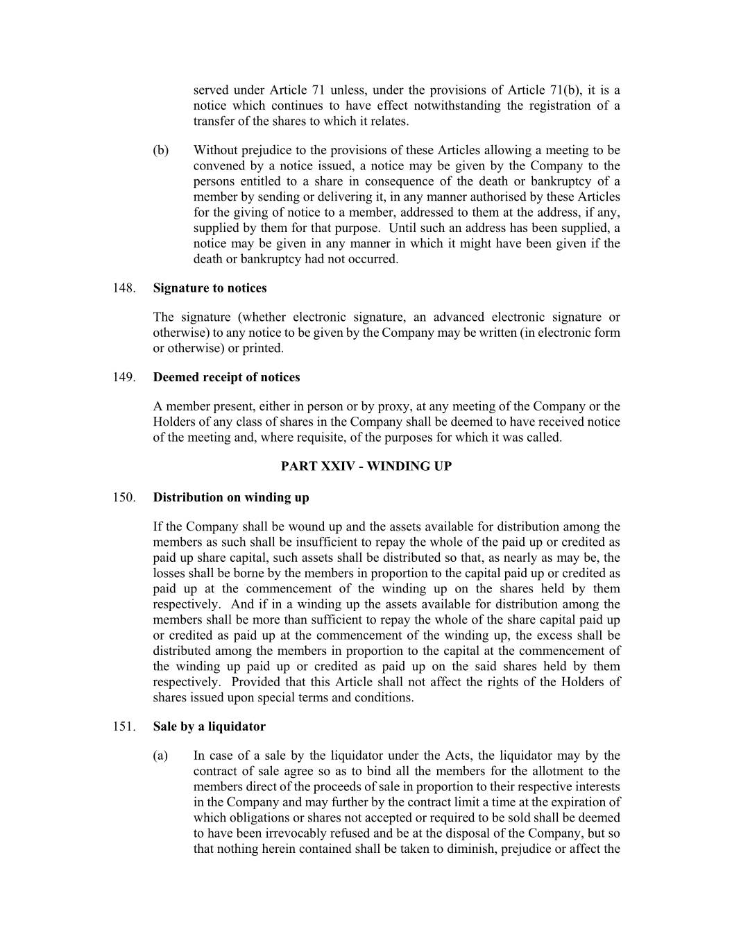 served under Article 71 unless, under the provisions of Article 71(b), it is a notice which continues to have effect notwithstanding the registration of a transfer of the shares to which it relates. (b) Without prejudice to the provisions of these Articles allowing a meeting to be convened by a notice issued, a notice may be given by the Company to the persons entitled to a share in consequence of the death or bankruptcy of a member by sending or delivering it, in any manner authorised by these Articles for the giving of notice to a member, addressed to them at the address, if any, supplied by them for that purpose. Until such an address has been supplied, a notice may be given in any manner in which it might have been given if the death or bankruptcy had not occurred. 148. Signature to notices The signature (whether electronic signature, an advanced electronic signature or otherwise) to any notice to be given by the Company may be written (in electronic form or otherwise) or printed. 149. Deemed receipt of notices A member present, either in person or by proxy, at any meeting of the Company or the Holders of any class of shares in the Company shall be deemed to have received notice of the meeting and, where requisite, of the purposes for which it was called. PART XXIV - WINDING UP 150. Distribution on winding up If the Company shall be wound up and the assets available for distribution among the members as such shall be insufficient to repay the whole of the paid up or credited as paid up share capital, such assets shall be distributed so that, as nearly as may be, the losses shall be borne by the members in proportion to the capital paid up or credited as paid up at the commencement of the winding up on the shares held by them respectively. And if in a winding up the assets available for distribution among the members shall be more than sufficient to repay the whole of the share capital paid up or credited as paid up at the commencement of the winding up, the excess shall be distributed among the members in proportion to the capital at the commencement of the winding up paid up or credited as paid up on the said shares held by them respectively. Provided that this Article shall not affect the rights of the Holders of shares issued upon special terms and conditions. 151. Sale by a liquidator (a) In case of a sale by the liquidator under the Acts, the liquidator may by the contract of sale agree so as to bind all the members for the allotment to the members direct of the proceeds of sale in proportion to their respective interests in the Company and may further by the contract limit a time at the expiration of which obligations or shares not accepted or required to be sold shall be deemed to have been irrevocably refused and be at the disposal of the Company, but so that nothing herein contained shall be taken to diminish, prejudice or affect the