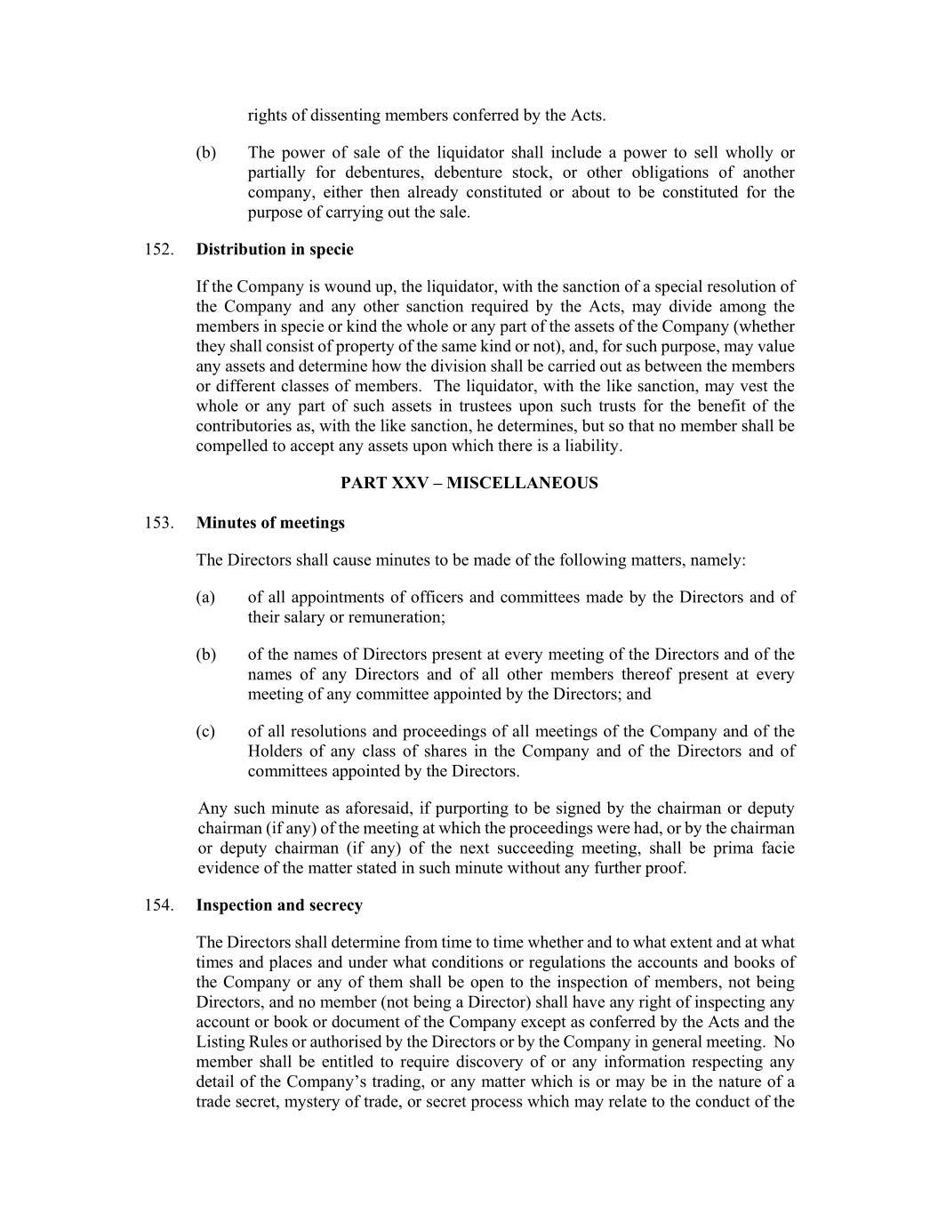 rights of dissenting members conferred by the Acts. (b) The power of sale of the liquidator shall include a power to sell wholly or partially for debentures, debenture stock, or other obligations of another company, either then already constituted or about to be constituted for the purpose of carrying out the sale. 152. Distribution in specie If the Company is wound up, the liquidator, with the sanction of a special resolution of the Company and any other sanction required by the Acts, may divide among the members in specie or kind the whole or any part of the assets of the Company (whether they shall consist of property of the same kind or not), and, for such purpose, may value any assets and determine how the division shall be carried out as between the members or different classes of members. The liquidator, with the like sanction, may vest the whole or any part of such assets in trustees upon such trusts for the benefit of the contributories as, with the like sanction, he determines, but so that no member shall be compelled to accept any assets upon which there is a liability. PART XXV – MISCELLANEOUS 153. Minutes of meetings The Directors shall cause minutes to be made of the following matters, namely: (a) of all appointments of officers and committees made by the Directors and of their salary or remuneration; (b) of the names of Directors present at every meeting of the Directors and of the names of any Directors and of all other members thereof present at every meeting of any committee appointed by the Directors; and (c) of all resolutions and proceedings of all meetings of the Company and of the Holders of any class of shares in the Company and of the Directors and of committees appointed by the Directors. Any such minute as aforesaid, if purporting to be signed by the chairman or deputy chairman (if any) of the meeting at which the proceedings were had, or by the chairman or deputy chairman (if any) of the next succeeding meeting, shall be prima facie evidence of the matter stated in such minute without any further proof. 154. Inspection and secrecy The Directors shall determine from time to time whether and to what extent and at what times and places and under what conditions or regulations the accounts and books of the Company or any of them shall be open to the inspection of members, not being Directors, and no member (not being a Director) shall have any right of inspecting any account or book or document of the Company except as conferred by the Acts and the Listing Rules or authorised by the Directors or by the Company in general meeting. No member shall be entitled to require discovery of or any information respecting any detail of the Company’s trading, or any matter which is or may be in the nature of a trade secret, mystery of trade, or secret process which may relate to the conduct of the