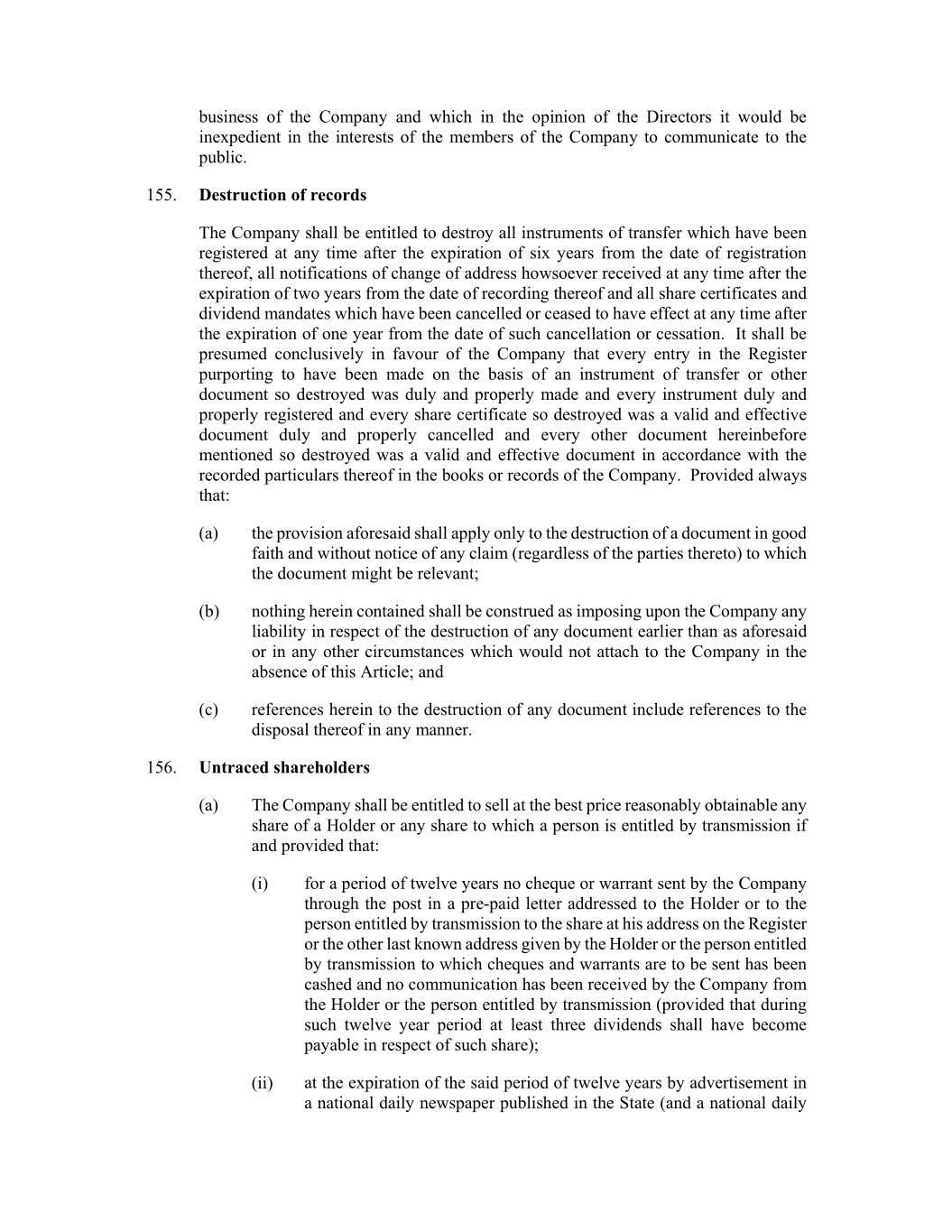 business of the Company and which in the opinion of the Directors it would be inexpedient in the interests of the members of the Company to communicate to the public. 155. Destruction of records The Company shall be entitled to destroy all instruments of transfer which have been registered at any time after the expiration of six years from the date of registration thereof, all notifications of change of address howsoever received at any time after the expiration of two years from the date of recording thereof and all share certificates and dividend mandates which have been cancelled or ceased to have effect at any time after the expiration of one year from the date of such cancellation or cessation. It shall be presumed conclusively in favour of the Company that every entry in the Register purporting to have been made on the basis of an instrument of transfer or other document so destroyed was duly and properly made and every instrument duly and properly registered and every share certificate so destroyed was a valid and effective document duly and properly cancelled and every other document hereinbefore mentioned so destroyed was a valid and effective document in accordance with the recorded particulars thereof in the books or records of the Company. Provided always that: (a) the provision aforesaid shall apply only to the destruction of a document in good faith and without notice of any claim (regardless of the parties thereto) to which the document might be relevant; (b) nothing herein contained shall be construed as imposing upon the Company any liability in respect of the destruction of any document earlier than as aforesaid or in any other circumstances which would not attach to the Company in the absence of this Article; and (c) references herein to the destruction of any document include references to the disposal thereof in any manner. 156. Untraced shareholders (a) The Company shall be entitled to sell at the best price reasonably obtainable any share of a Holder or any share to which a person is entitled by transmission if and provided that: (i) for a period of twelve years no cheque or warrant sent by the Company through the post in a pre-paid letter addressed to the Holder or to the person entitled by transmission to the share at his address on the Register or the other last known address given by the Holder or the person entitled by transmission to which cheques and warrants are to be sent has been cashed and no communication has been received by the Company from the Holder or the person entitled by transmission (provided that during such twelve year period at least three dividends shall have become payable in respect of such share); (ii) at the expiration of the said period of twelve years by advertisement in a national daily newspaper published in the State (and a national daily