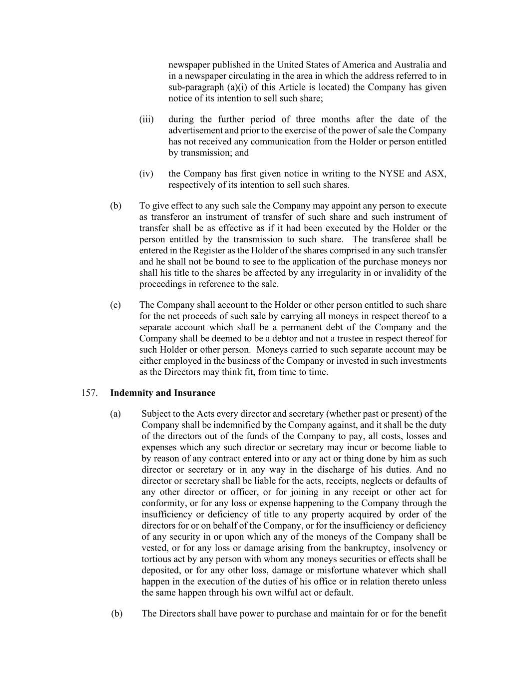 newspaper published in the United States of America and Australia and in a newspaper circulating in the area in which the address referred to in sub-paragraph (a)(i) of this Article is located) the Company has given notice of its intention to sell such share; (iii) during the further period of three months after the date of the advertisement and prior to the exercise of the power of sale the Company has not received any communication from the Holder or person entitled by transmission; and (iv) the Company has first given notice in writing to the NYSE and ASX, respectively of its intention to sell such shares. (b) To give effect to any such sale the Company may appoint any person to execute as transferor an instrument of transfer of such share and such instrument of transfer shall be as effective as if it had been executed by the Holder or the person entitled by the transmission to such share. The transferee shall be entered in the Register as the Holder of the shares comprised in any such transfer and he shall not be bound to see to the application of the purchase moneys nor shall his title to the shares be affected by any irregularity in or invalidity of the proceedings in reference to the sale. (c) The Company shall account to the Holder or other person entitled to such share for the net proceeds of such sale by carrying all moneys in respect thereof to a separate account which shall be a permanent debt of the Company and the Company shall be deemed to be a debtor and not a trustee in respect thereof for such Holder or other person. Moneys carried to such separate account may be either employed in the business of the Company or invested in such investments as the Directors may think fit, from time to time. 157. Indemnity and Insurance (a) Subject to the Acts every director and secretary (whether past or present) of the Company shall be indemnified by the Company against, and it shall be the duty of the directors out of the funds of the Company to pay, all costs, losses and expenses which any such director or secretary may incur or become liable to by reason of any contract entered into or any act or thing done by him as such director or secretary or in any way in the discharge of his duties. And no director or secretary shall be liable for the acts, receipts, neglects or defaults of any other director or officer, or for joining in any receipt or other act for conformity, or for any loss or expense happening to the Company through the insufficiency or deficiency of title to any property acquired by order of the directors for or on behalf of the Company, or for the insufficiency or deficiency of any security in or upon which any of the moneys of the Company shall be vested, or for any loss or damage arising from the bankruptcy, insolvency or tortious act by any person with whom any moneys securities or effects shall be deposited, or for any other loss, damage or misfortune whatever which shall happen in the execution of the duties of his office or in relation thereto unless the same happen through his own wilful act or default. (b) The Directors shall have power to purchase and maintain for or for the benefit