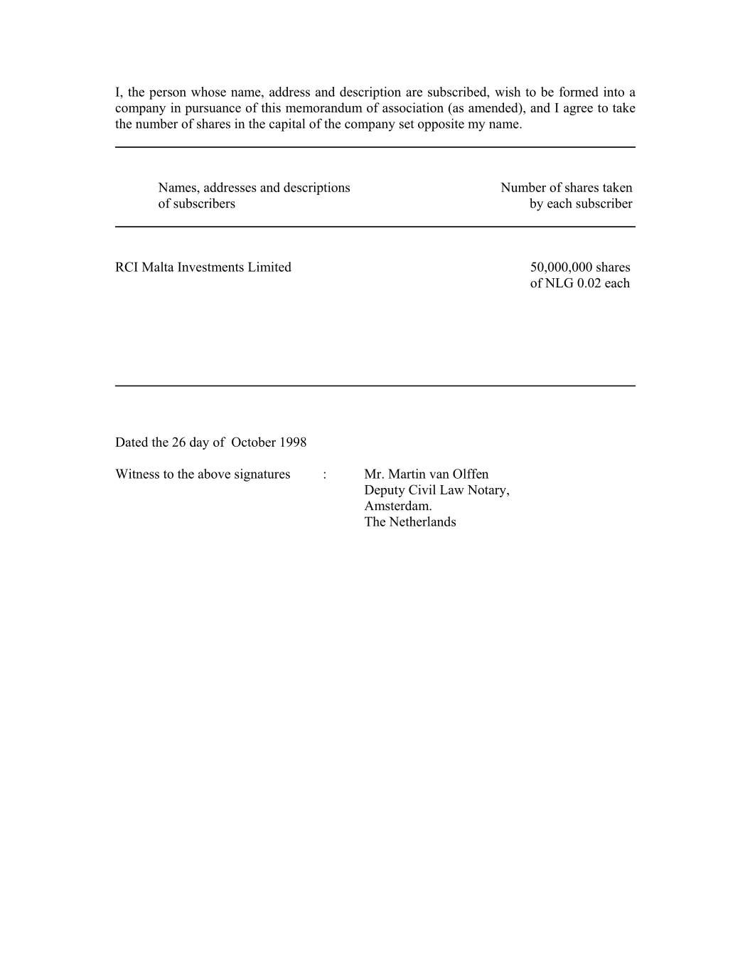I, the person whose name, address and description are subscribed, wish to be formed into a company in pursuance of this memorandum of association (as amended), and I agree to take the number of shares in the capital of the company set opposite my name. Names, addresses and descriptions Number of shares taken of subscribers by each subscriber RCI Malta Investments Limited 50,000,000 shares of NLG 0.02 each Dated the 26 day of October 1998 Witness to the above signatures : Mr. Martin van Olffen Deputy Civil Law Notary, Amsterdam. The Netherlands