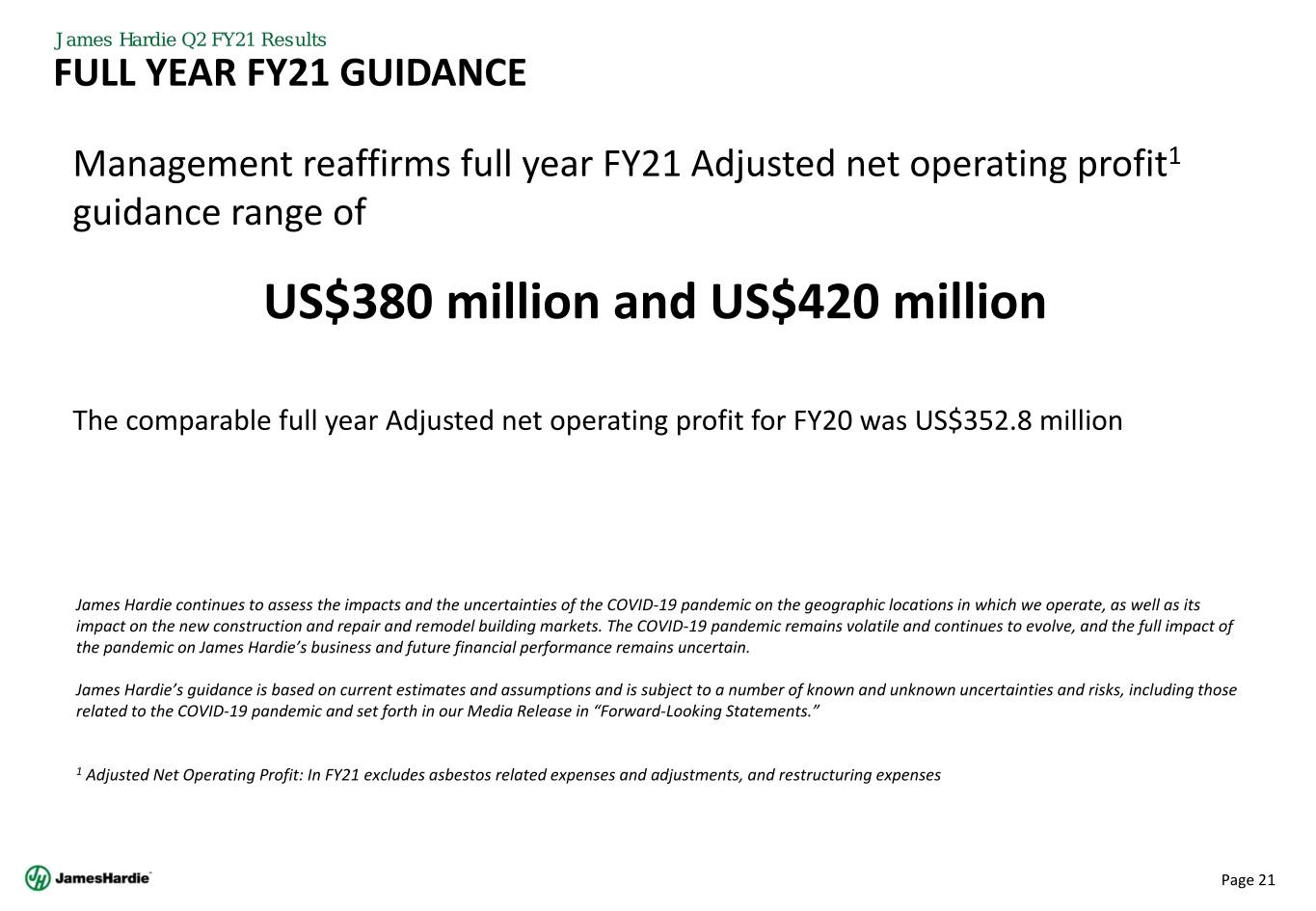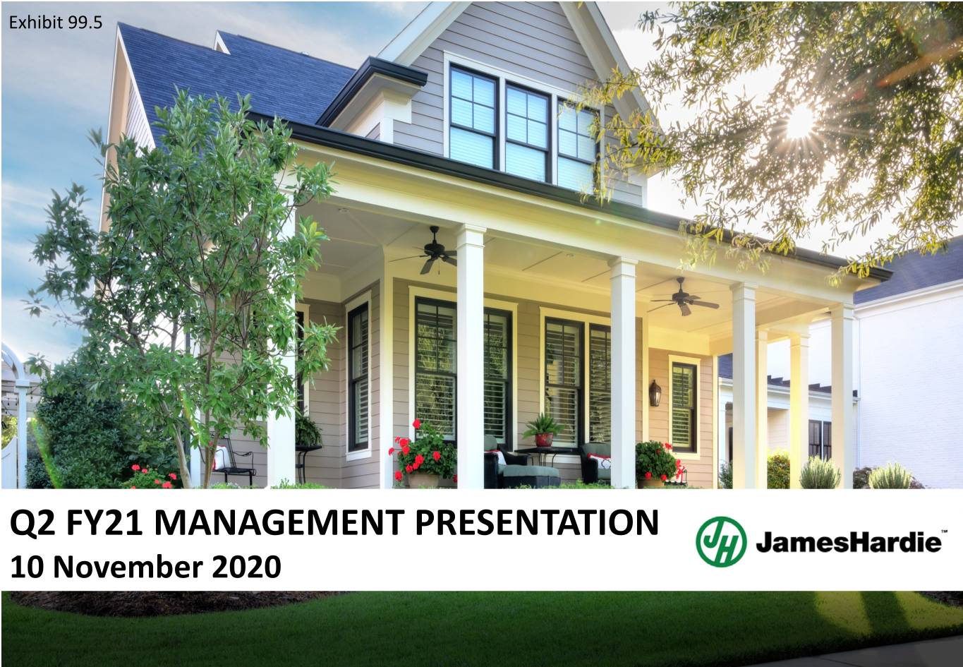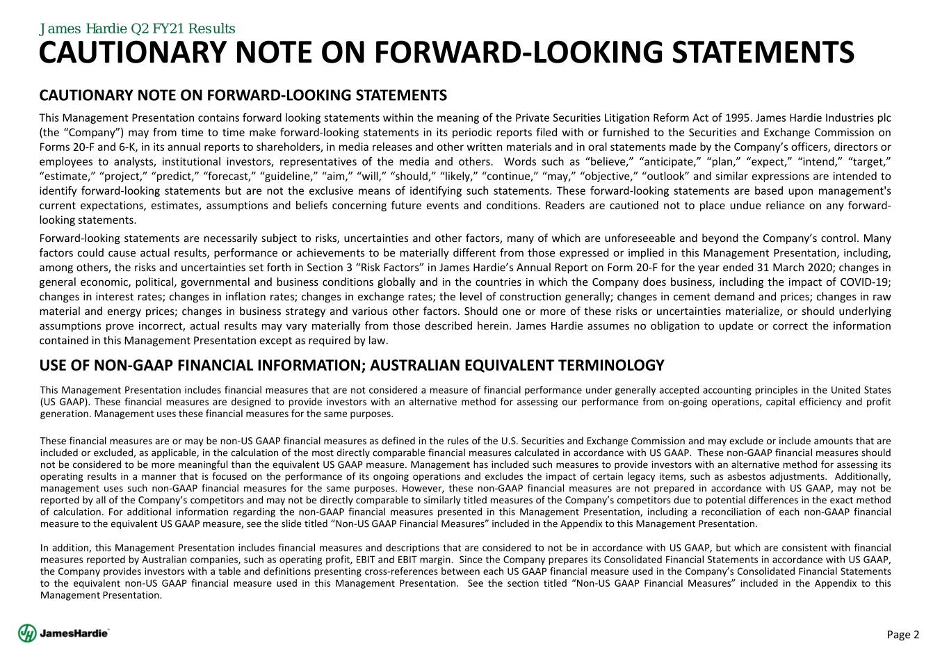 James Hardie Q2 FY21 Results CAUTIONARY NOTE ON FORWARD-LOOKING STATEMENTS CAUTIONARY NOTE ON FORWARD-LOOKING STATEMENTS This Management Presentation contains forward looking statements within the meaning of the Private Securities Litigation Reform Act of 1995. James Hardie Industries plc (the “Company”) may from time to time make forward-looking statements in its periodic reports filed with or furnished to the Securities and Exchange Commission on Forms 20-F and 6-K, in its annual reports to shareholders, in media releases and other written materials and in oral statements made by the Company’s officers, directors or employees to analysts, institutional investors, representatives of the media and others. Words such as “believe,” “anticipate,” “plan,” “expect,” “intend,” “target,” “estimate,” “project,” “predict,” “forecast,” “guideline,” “aim,” “will,” “should,” “likely,” “continue,” “may,” “objective,” “outlook” and similar expressions are intended to identify forward-looking statements but are not the exclusive means of identifying such statements. These forward-looking statements are based upon management's current expectations, estimates, assumptions and beliefs concerning future events and conditions. Readers are cautioned not to place undue reliance on any forward- looking statements. Forward-looking statements are necessarily subject to risks, uncertainties and other factors, many of which are unforeseeable and beyond the Company’s control. Many factors could cause actual results, performance or achievements to be materially different from those expressed or implied in this Management Presentation, including, among others, the risks and uncertainties set forth in Section 3 “Risk Factors” in James Hardie’s Annual Report on Form 20-F for the year ended 31 March 2020; changes in general economic, political, governmental and business conditions globally and in the countries in which the Company does business, including the impact of COVID-19; changes in interest rates; changes in inflation rates; changes in exchange rates; the level of construction generally; changes in cement demand and prices; changes in raw material and energy prices; changes in business strategy and various other factors. Should one or more of these risks or uncertainties materialize, or should underlying assumptions prove incorrect, actual results may vary materially from those described herein. James Hardie assumes no obligation to update or correct the information contained in this Management Presentation except as required by law. USE OF NON-GAAP FINANCIAL INFORMATION; AUSTRALIAN EQUIVALENT TERMINOLOGY This Management Presentation includes financial measures that are not considered a measure of financial performance under generally accepted accounting principles in the United States (US GAAP). These financial measures are designed to provide investors with an alternative method for assessing our performance from on-going operations, capital efficiency and profit generation. Management uses these financial measures for the same purposes. These financial measures are or may be non-US GAAP financial measures as defined in the rules of the U.S. Securities and Exchange Commission and may exclude or include amounts that are included or excluded, as applicable, in the calculation of the most directly comparable financial measures calculated in accordance with US GAAP. These non-GAAP financial measures should not be considered to be more meaningful than the equivalent US GAAP measure. Management has included such measures to provide investors with an alternative method for assessing its operating results in a manner that is focused on the performance of its ongoing operations and excludes the impact of certain legacy items, such as asbestos adjustments. Additionally, management uses such non-GAAP financial measures for the same purposes. However, these non-GAAP financial measures are not prepared in accordance with US GAAP, may not be reported by all of the Company’s competitors and may not be directly comparable to similarly titled measures of the Company’s competitors due to potential differences in the exact method of calculation. For additional information regarding the non-GAAP financial measures presented in this Management Presentation, including a reconciliation of each non-GAAP financial measure to the equivalent US GAAP measure, see the slide titled “Non-US GAAP Financial Measures” included in the Appendix to this Management Presentation. In addition, this Management Presentation includes financial measures and descriptions that are considered to not be in accordance with US GAAP, but which are consistent with financial measures reported by Australian companies, such as operating profit, EBIT and EBIT margin. Since the Company prepares its Consolidated Financial Statements in accordance with US GAAP, the Company provides investors with a table and definitions presenting cross-references between each US GAAP financial measure used in the Company’s Consolidated Financial Statements to the equivalent non-US GAAP financial measure used in this Management Presentation. See the section titled “Non-US GAAP Financial Measures” included in the Appendix to this Management Presentation. Page 2