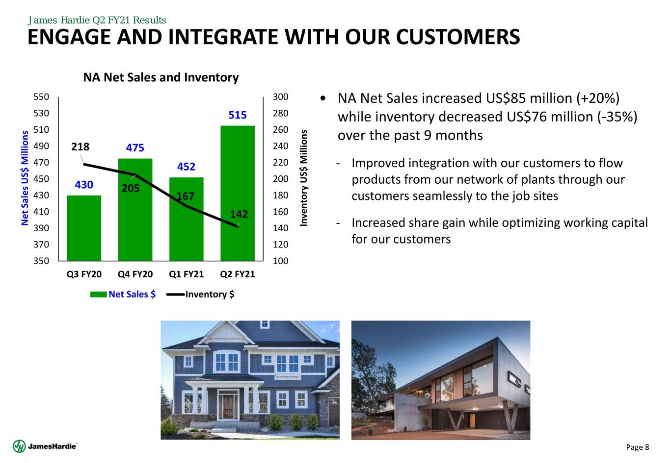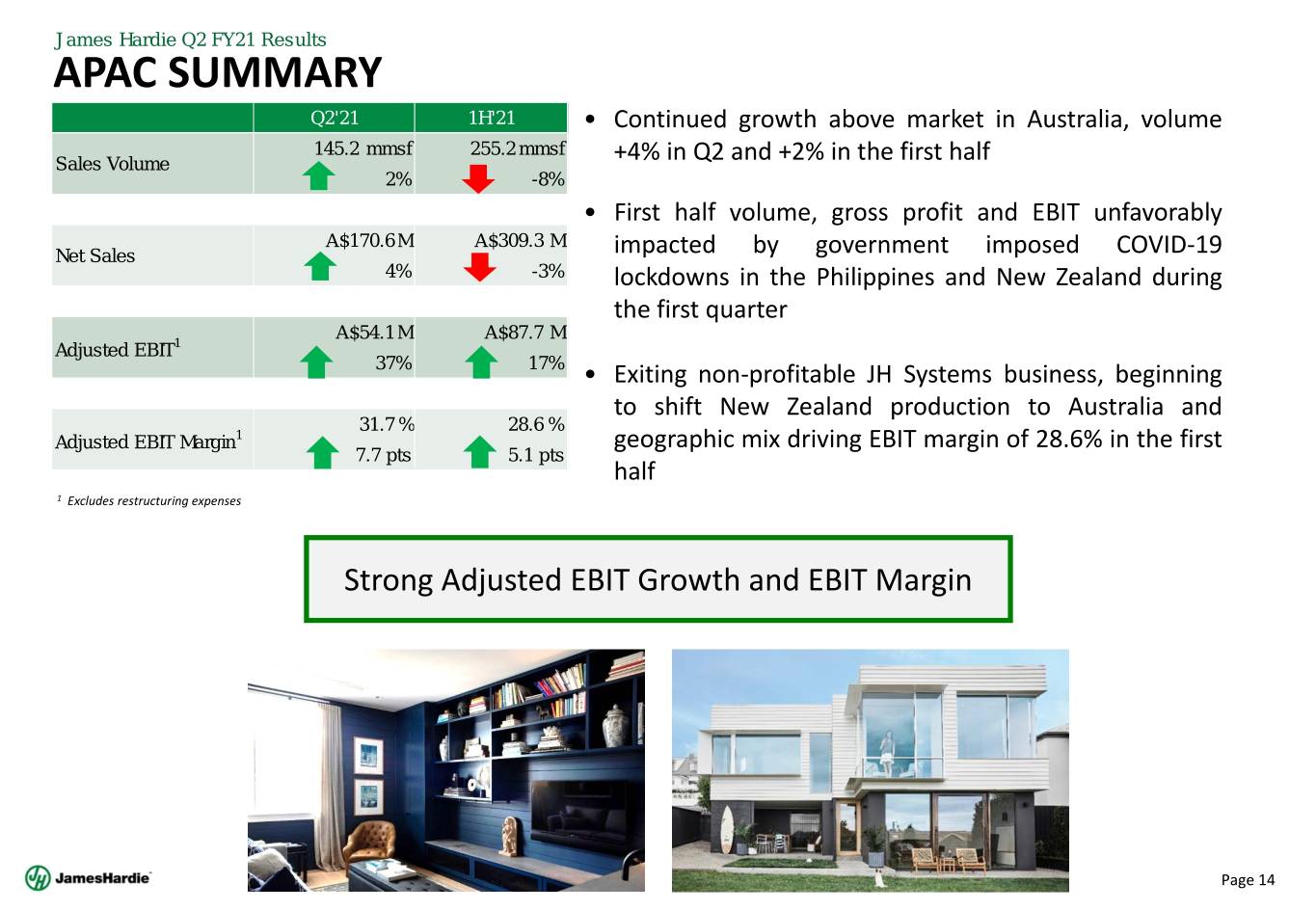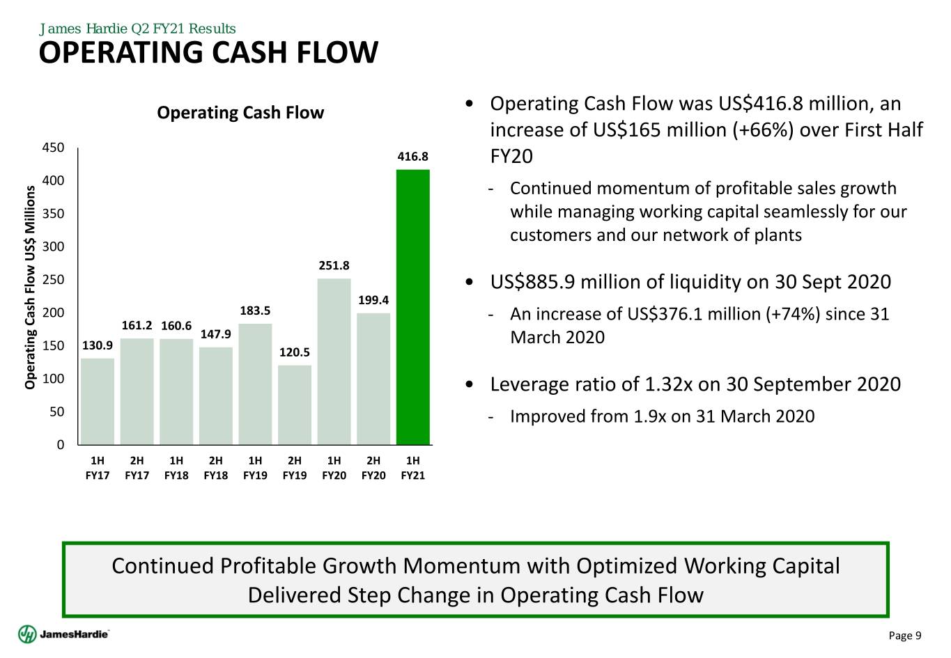 James Hardie Q2 FY21 Results CAUTIONARY NOTE ON FORWARD-LOOKING STATEMENTS CAUTIONARY NOTE ON FORWARD-LOOKING STATEMENTS This Management Presentation contains forward looking statements within the meaning of the Private Securities Litigation Reform Act of 1995. James Hardie Industries plc (the “Company”) may from time to time make forward-looking statements in its periodic reports filed with or furnished to the Securities and Exchange Commission on Forms 20-F and 6-K, in its annual reports to shareholders, in media releases and other written materials and in oral statements made by the Company’s officers, directors or employees to analysts, institutional investors, representatives of the media and others. Words such as “believe,” “anticipate,” “plan,” “expect,” “intend,” “target,” “estimate,” “project,” “predict,” “forecast,” “guideline,” “aim,” “will,” “should,” “likely,” “continue,” “may,” “objective,” “outlook” and similar expressions are intended to identify forward-looking statements but are not the exclusive means of identifying such statements. These forward-looking statements are based upon management's current expectations, estimates, assumptions and beliefs concerning future events and conditions. Readers are cautioned not to place undue reliance on any forward- looking statements. Forward-looking statements are necessarily subject to risks, uncertainties and other factors, many of which are unforeseeable and beyond the Company’s control. Many factors could cause actual results, performance or achievements to be materially different from those expressed or implied in this Management Presentation, including, among others, the risks and uncertainties set forth in Section 3 “Risk Factors” in James Hardie’s Annual Report on Form 20-F for the year ended 31 March 2020; changes in general economic, political, governmental and business conditions globally and in the countries in which the Company does business, including the impact of COVID-19; changes in interest rates; changes in inflation rates; changes in exchange rates; the level of construction generally; changes in cement demand and prices; changes in raw material and energy prices; changes in business strategy and various other factors. Should one or more of these risks or uncertainties materialize, or should underlying assumptions prove incorrect, actual results may vary materially from those described herein. James Hardie assumes no obligation to update or correct the information contained in this Management Presentation except as required by law. USE OF NON-GAAP FINANCIAL INFORMATION; AUSTRALIAN EQUIVALENT TERMINOLOGY This Management Presentation includes financial measures that are not considered a measure of financial performance under generally accepted accounting principles in the United States (US GAAP). These financial measures are designed to provide investors with an alternative method for assessing our performance from on-going operations, capital efficiency and profit generation. Management uses these financial measures for the same purposes. These financial measures are or may be non-US GAAP financial measures as defined in the rules of the U.S. Securities and Exchange Commission and may exclude or include amounts that are included or excluded, as applicable, in the calculation of the most directly comparable financial measures calculated in accordance with US GAAP. These non-GAAP financial measures should not be considered to be more meaningful than the equivalent US GAAP measure. Management has included such measures to provide investors with an alternative method for assessing its operating results in a manner that is focused on the performance of its ongoing operations and excludes the impact of certain legacy items, such as asbestos adjustments. Additionally, management uses such non-GAAP financial measures for the same purposes. However, these non-GAAP financial measures are not prepared in accordance with US GAAP, may not be reported by all of the Company’s competitors and may not be directly comparable to similarly titled measures of the Company’s competitors due to potential differences in the exact method of calculation. For additional information regarding the non-GAAP financial measures presented in this Management Presentation, including a reconciliation of each non-GAAP financial measure to the equivalent US GAAP measure, see the slide titled “Non-US GAAP Financial Measures” included in the Appendix to this Management Presentation. In addition, this Management Presentation includes financial measures and descriptions that are considered to not be in accordance with US GAAP, but which are consistent with financial measures reported by Australian companies, such as operating profit, EBIT and EBIT margin. Since the Company prepares its Consolidated Financial Statements in accordance with US GAAP, the Company provides investors with a table and definitions presenting cross-references between each US GAAP financial measure used in the Company’s Consolidated Financial Statements to the equivalent non-US GAAP financial measure used in this Management Presentation. See the section titled “Non-US GAAP Financial Measures” included in the Appendix to this Management Presentation. Page 2