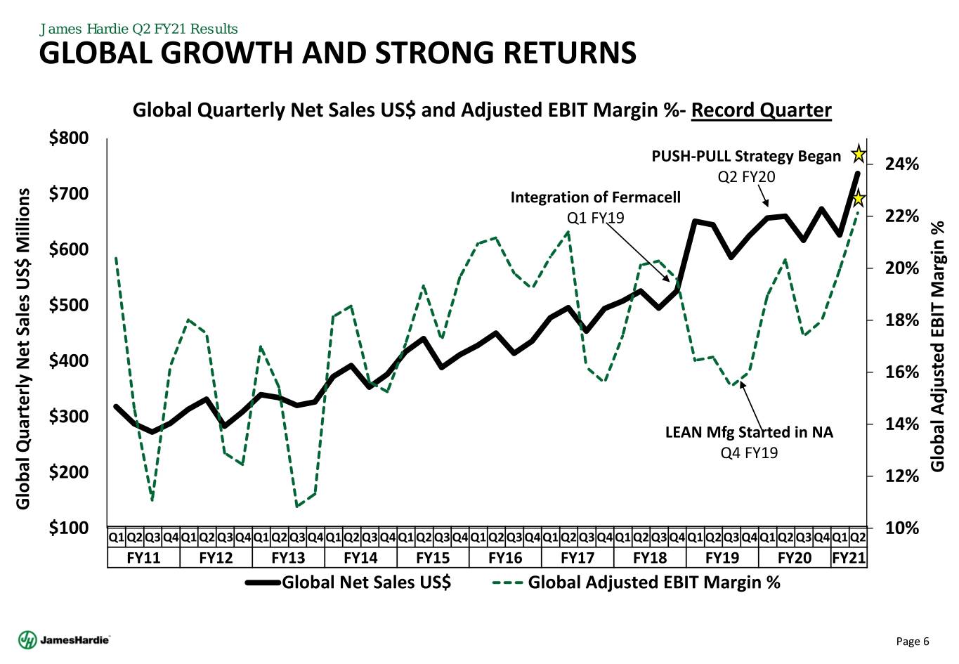 James Hardie Q2 FY21 Results GLOBAL STRATEGY: ON TRACK AND ACCELERATING Year 1: FY20 Year 2: FY21 Year 3: FY22 Begin the Shift from Big, Build on our Momentum Develop New Global SMALL, to Small, BIG Company As a Global Company Growth Platforms . Develop World Class Manufacturing . Continue to execute and deliver . Continue to execute and deliver capabilities via LEAN consistent financial results, quarter consistent, profitable global growth . Become more customer focused via on quarter . Launch the first Innovation Platform Push/Pull strategy . Engage and integrate supply chain in NA, EU, and AUS . Deliver consistent financial results, operations with our customers to quarter on quarter service the market seamlessly with optimal working capital FY20 Results: . Global Pandemic helps us accelerate: 7+% PDG and 26% Adjusted EBIT Margin in North America - Market share gain Adjusted NOPAT +17% YoY - Working Capital Improvements Operating Cash Flow +48% YoY . Delivered Record Worldwide Financial Results in Q2 FY21 Strong growth above market and returns in all 3 regions (NA, EU, APAC) Integrated and Globally Connected Management System Page 5