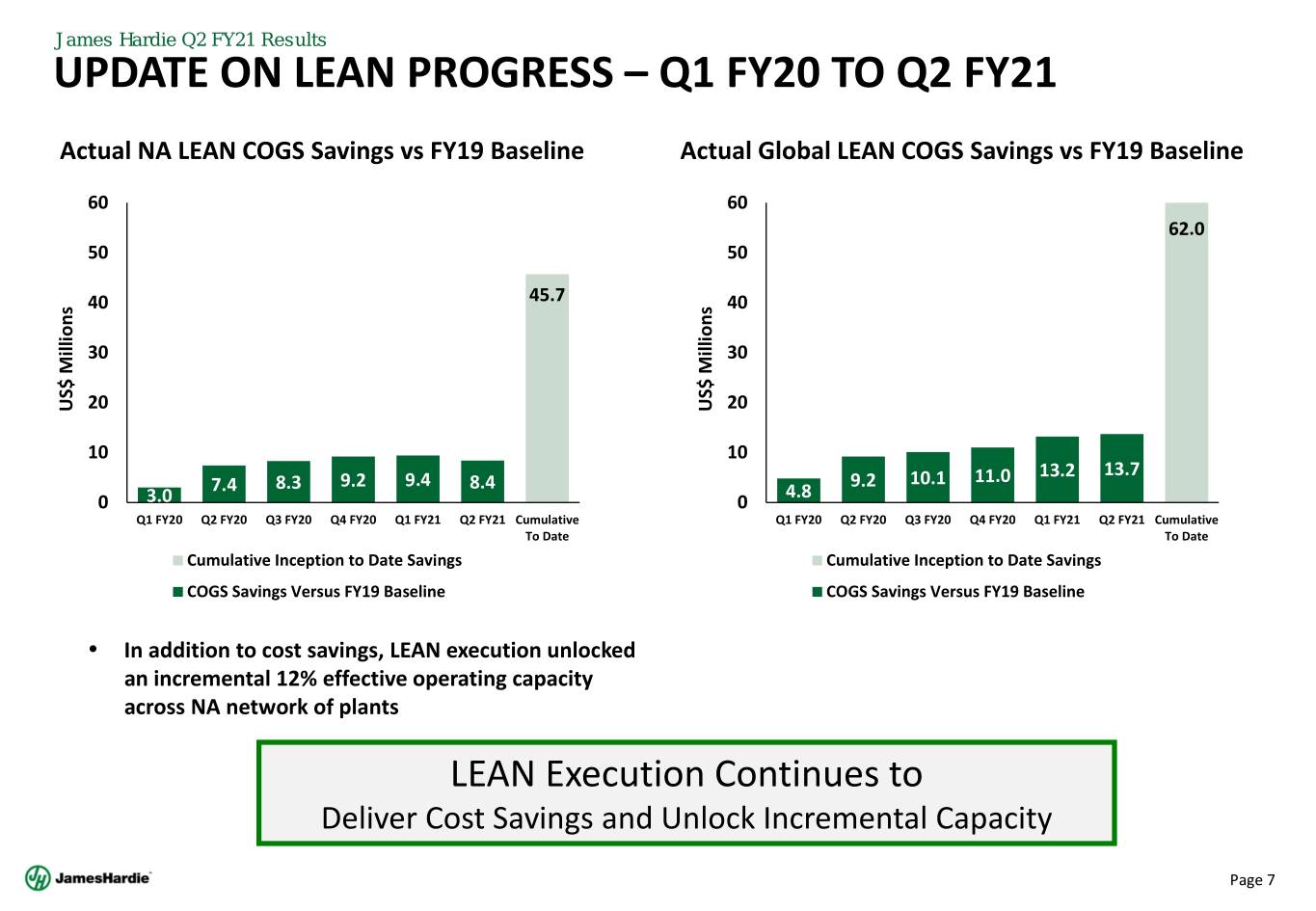 James Hardie Q2 FY21 Results GLOBAL GROWTH AND STRONG RETURNS Global Quarterly Net Sales US$ and Adjusted EBIT Margin %- Record Quarter $800 PUSH-PULL Strategy Began 24% Q2 FY20 $700 Integration of Fermacell Q1 FY19 22% $600 20% $500 18% $400 16% $300 LEAN Mfg Started in NA 14% Q4 FY19 $200 12% Global EBIT Margin Adjusted % Global Sales Quarterly Net US$ Millions $100 Q1 Q2 Q3 Q4 Q1 Q2 Q3 Q4 Q1 Q2 Q3 Q4 Q1 Q2 Q3 Q4 Q1 Q2 Q3 Q4 Q1 Q2 Q3 Q4 Q1 Q2 Q3 Q4 Q1 Q2 Q3 Q4 Q1 Q2 Q3 Q4 Q1 Q2 Q3 Q4 Q1 Q2 10% Q1 Q2 Q3 Q4 Q1 Q2 Q3 Q4 Q1 Q2 Q3 Q4 Q1 Q2 Q3 Q4 Q1 Q2 Q3 Q4 Q1 Q2 Q3 Q4 Q1 Q2 Q3 Q4 Q1 Q2 Q3 Q4 Q1 Q2 Q3 Q4 Q1 Q2 Q3 Q4 Q1 Q2 FY11 FY12 FY13 FY14 FY15 FY16 FY17 FY18 FY19 FY20 FY21 Global Net Sales US$ Global Adjusted EBIT Margin % Page 6