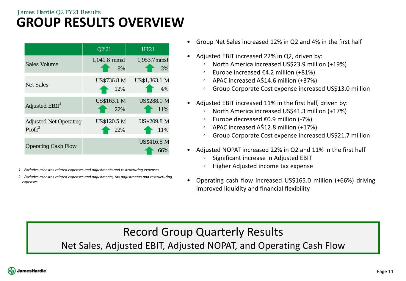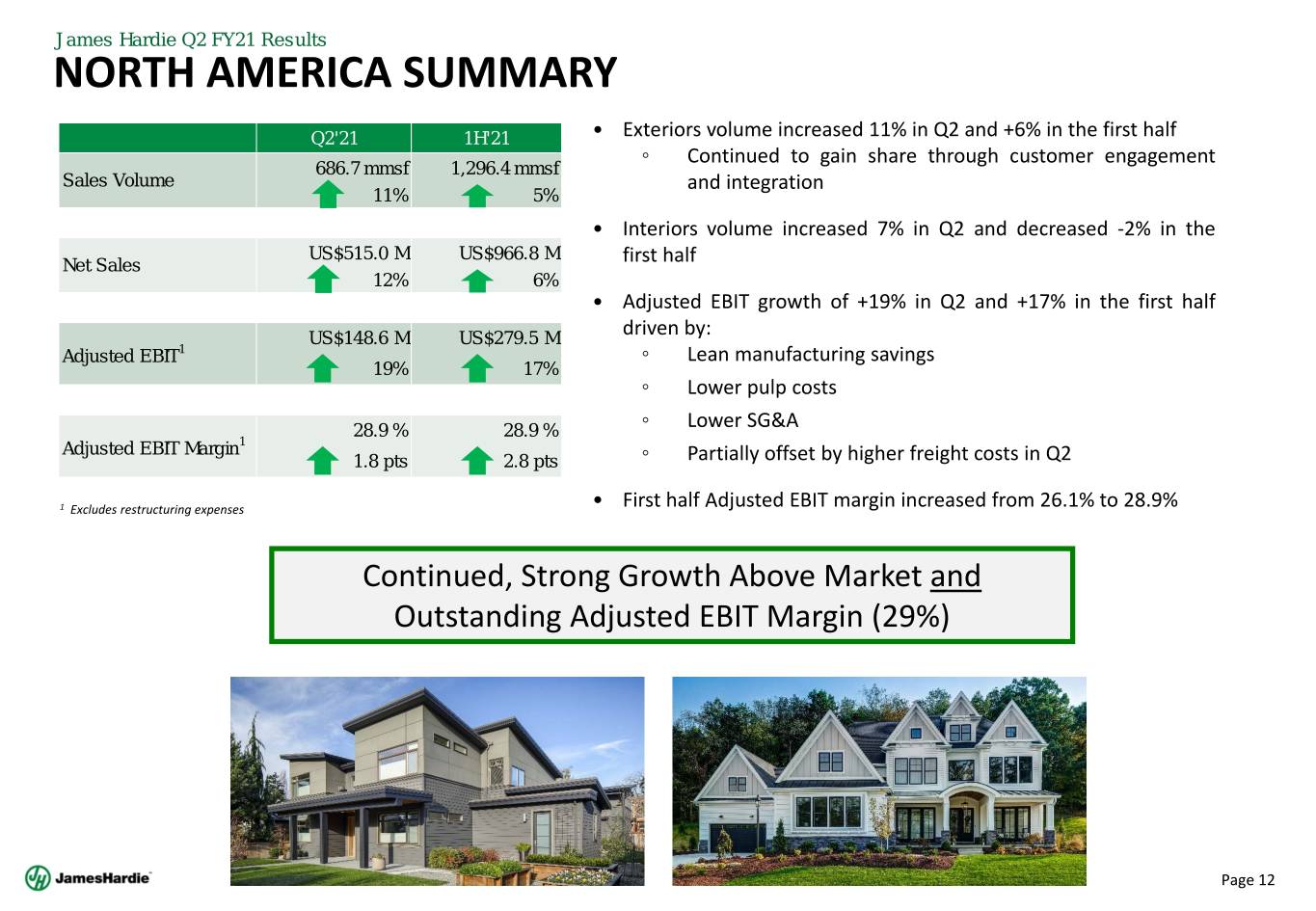 James Hardie Q2 FY21 Results GROUP RESULTS OVERVIEW • Group Net Sales increased 12% in Q2 and 4% in the first half Q2'21 1H'21 • Adjusted EBIT increased 22% in Q2, driven by: 1,041.8 mmsf 1,953.7mmsf Sales Volume ◦ North America increased US$23.9 million (+19%) 8% 2% ◦ Europe increased €4.2 million (+81%) US$736.8 M US$1,363.1 M ◦ APAC increased A$14.6 million (+37%) Net Sales 12% 4% ◦ Group Corporate Cost expense increased US$13.0 million US$163.1 M US$288.0 M Adjusted EBIT1 • Adjusted EBIT increased 11% in the first half, driven by: 22% 11% ◦ North America increased US$41.3 million (+17%) Adjusted Net Operating US$120.5 M US$209.8 M ◦ Europe decreased €0.9 million (-7%) Profit2 22% 11% ◦ APAC increased A$12.8 million (+17%) ◦ Group Corporate Cost expense increased US$21.7 million US$416.8 M Operating Cash Flow 66% • Adjusted NOPAT increased 22% in Q2 and 11% in the first half ◦ Significant increase in Adjusted EBIT 1 Excludes asbestos related expenses and adjustments and restructuring expenses ◦ Higher Adjusted income tax expense 2 Excludes asbestos related expenses and adjustments, tax adjustments and restructuring expenses • Operating cash flow increased US$165.0 million (+66%) driving improved liquidity and financial flexibility Record Group Quarterly Results Net Sales, Adjusted EBIT, Adjusted NOPAT, and Operating Cash Flow Page 11