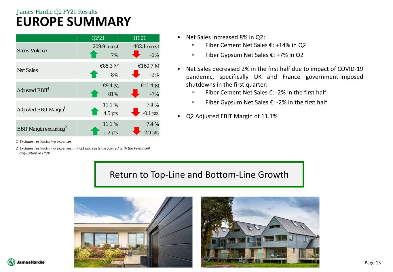James Hardie Q2 FY21 Results NORTH AMERICA SUMMARY Q2'21 1H'21 • Exteriors volume increased 11% in Q2 and +6% in the first half ◦ Continued to gain share through customer engagement 686.7 mmsf 1,296.4 mmsf Sales Volume and integration 11% 5% • Interiors volume increased 7% in Q2 and decreased -2% in the US$515.0 M US$966.8 M Net Sales first half 12% 6% • Adjusted EBIT growth of +19% in Q2 and +17% in the first half driven by: US$148.6 M US$279.5 M Adjusted EBIT1 ◦ Lean manufacturing savings 19% 17% ◦ Lower pulp costs ◦ Lower SG&A 28.9 % 28.9 % Adjusted EBIT Margin1 1.8 pts 2.8 pts ◦ Partially offset by higher freight costs in Q2 1 Excludes restructuring expenses • First half Adjusted EBIT margin increased from 26.1% to 28.9% Continued, Strong Growth Above Market and Outstanding Adjusted EBIT Margin (29%) Page 12